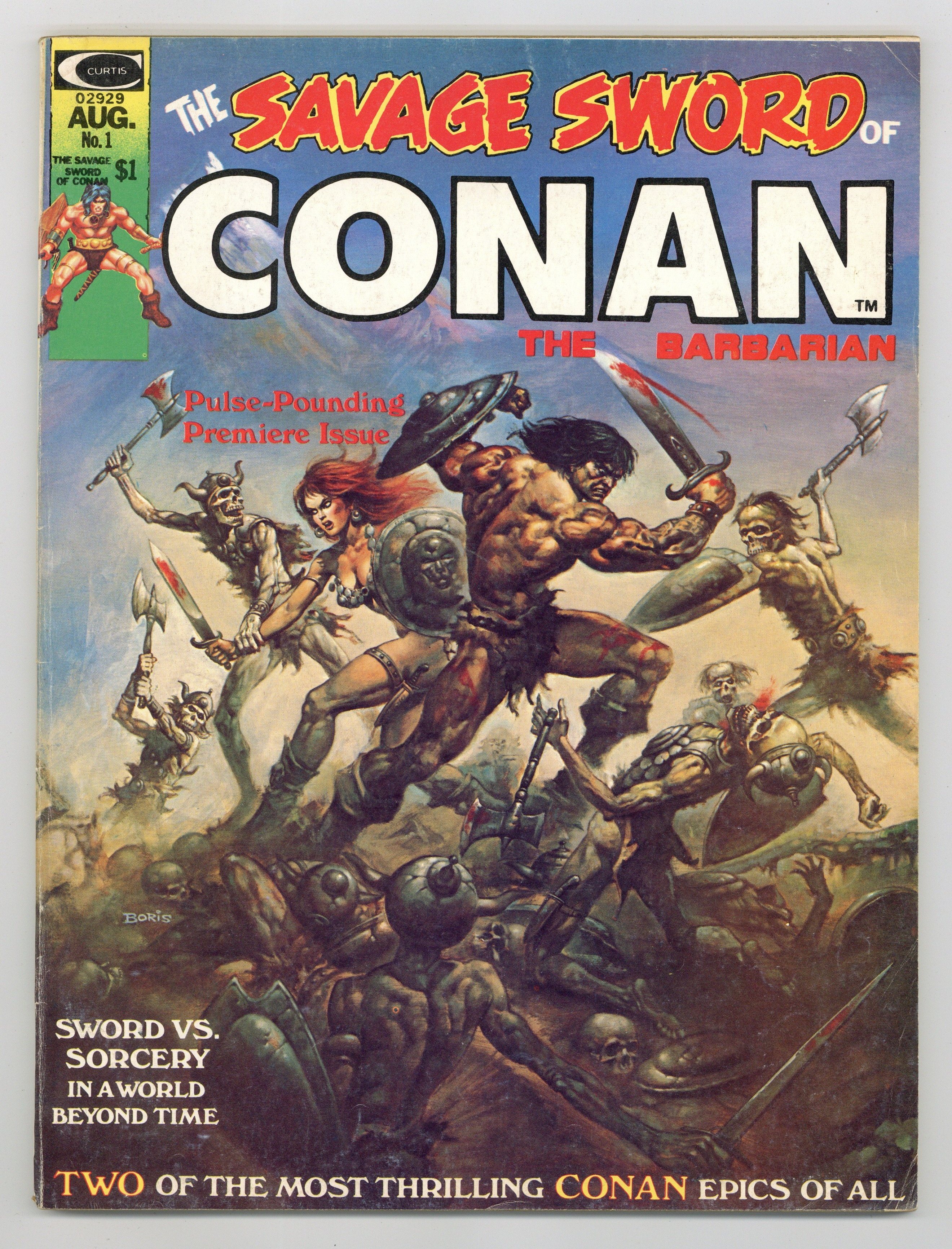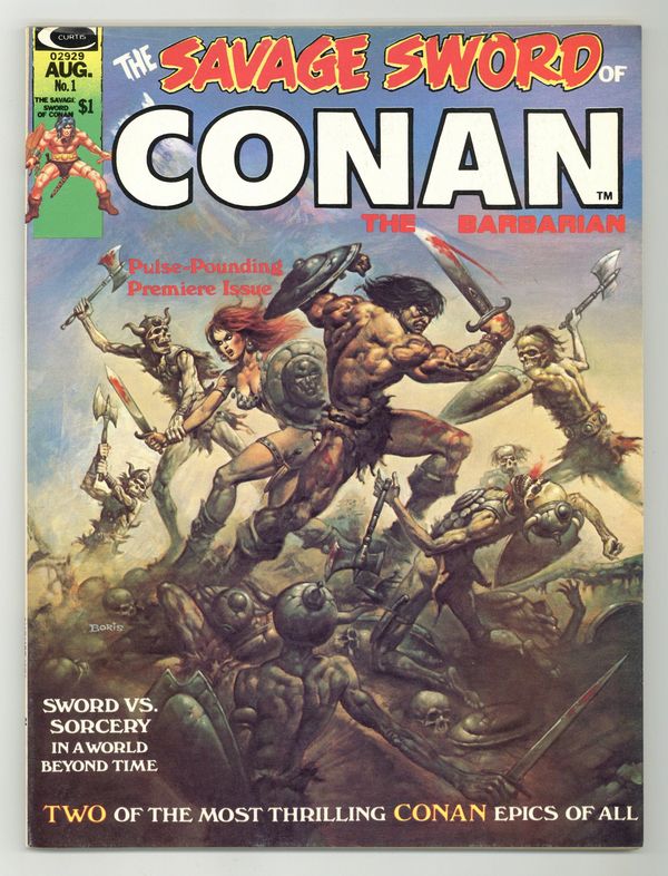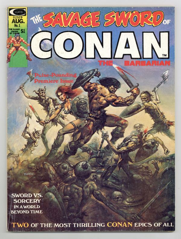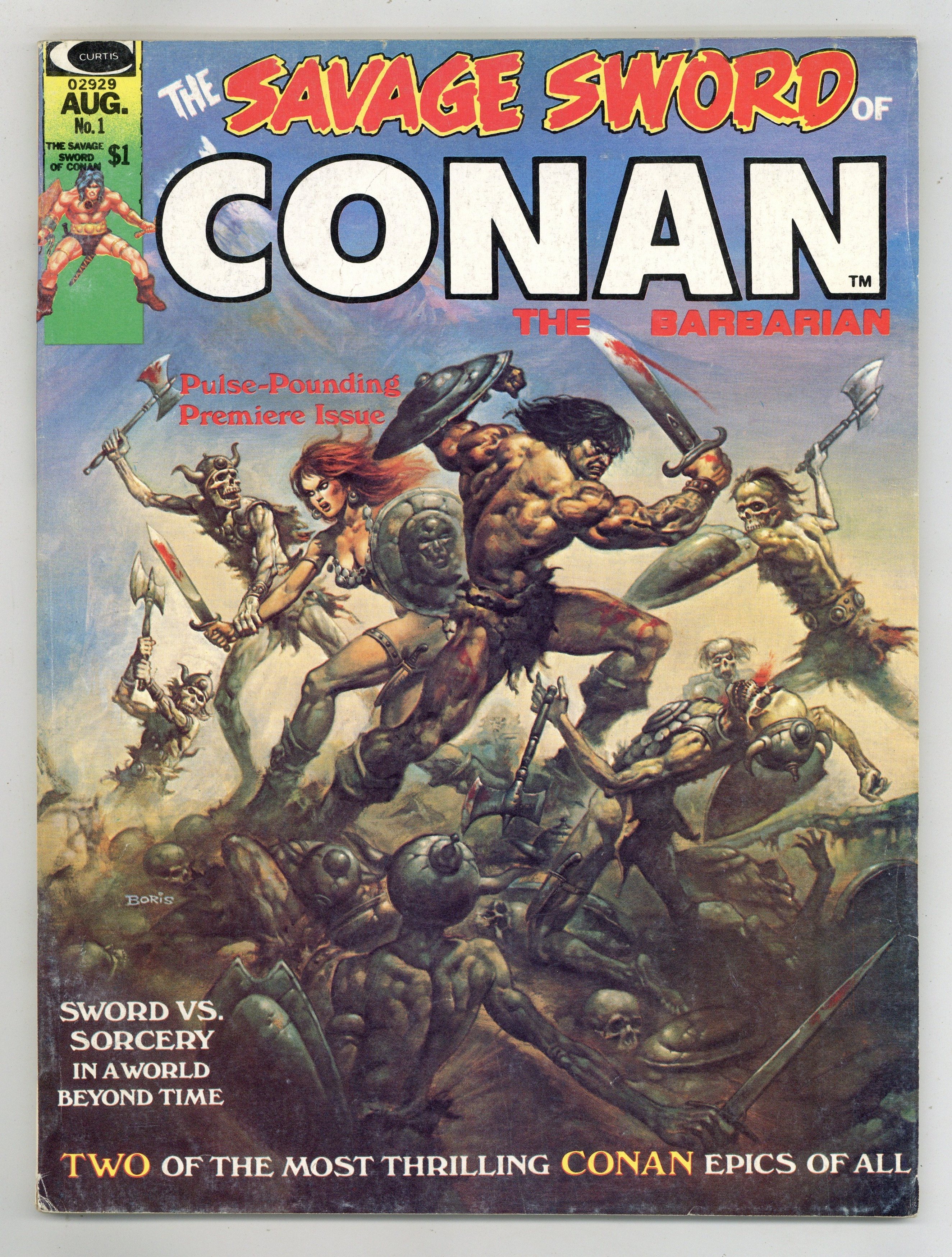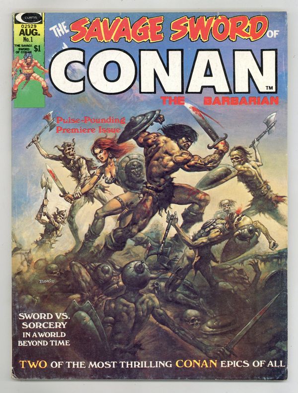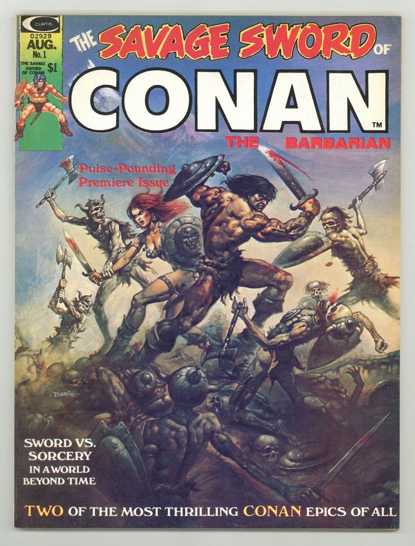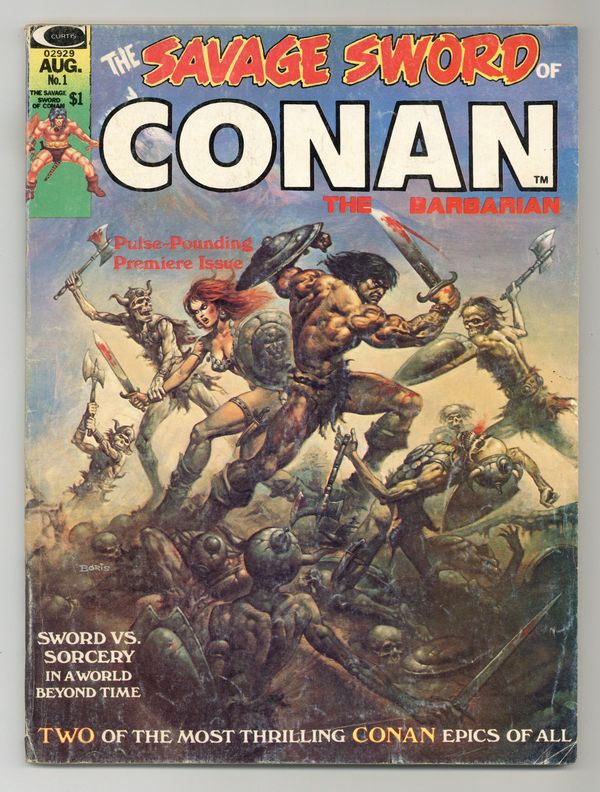 Painted cover art by Boris Vallejo. Conan and Red Sonja star in "Curse of the Undead-Man," script by Roy Thomas, pencils by John Buscema, inks by Pablo Marcos; Conan and Red Sonja put an end to the undead sorcerer Costranno; Adapted from the story "Mistress of Death" by Robert E. Howard and Gerald Page; continued in part from Conan the Barbarian 42. "Red Sonja" (3rd appearance), script by Thomas, art by Esteban Maroto, Neal Adams, and Ernie Chan (as Ernie Chua); When Red Sonja returns with a tiara she was sent for by King Ghannif she learns her "reward" is to be made a part of his harem. "Blackmark," script and art by Gil Kane (reprinting chapter 1 from the Bantam Books paperback); a Conan reprint from Savage Tales 1 (plus the additional splash page from Conan the Barbarian 16). "The Frost Giant's Daughter," script by Thomas, art by Barry Windsor-Smith (adapted from the Howard story); Conan chases Atali across the snow, slays her two frost giant brothers, and catches her; Her father, Ymir then takes her from Conan. "Conan's Women Warriors," an article by Fred Blosser illustrated by Esteban Maroto, Steve Gan, Hugh Rankin (original Weird Tales art), and Roy Krenkel; and "An Atlantean in Aquilonia," a Kull article by Glenn Lord illustrated by John Severin and Ross Andru. Alfredo Alcala pin-up. Maroto frontispiece. 84 pgs., B&W. Cover price $1.00.