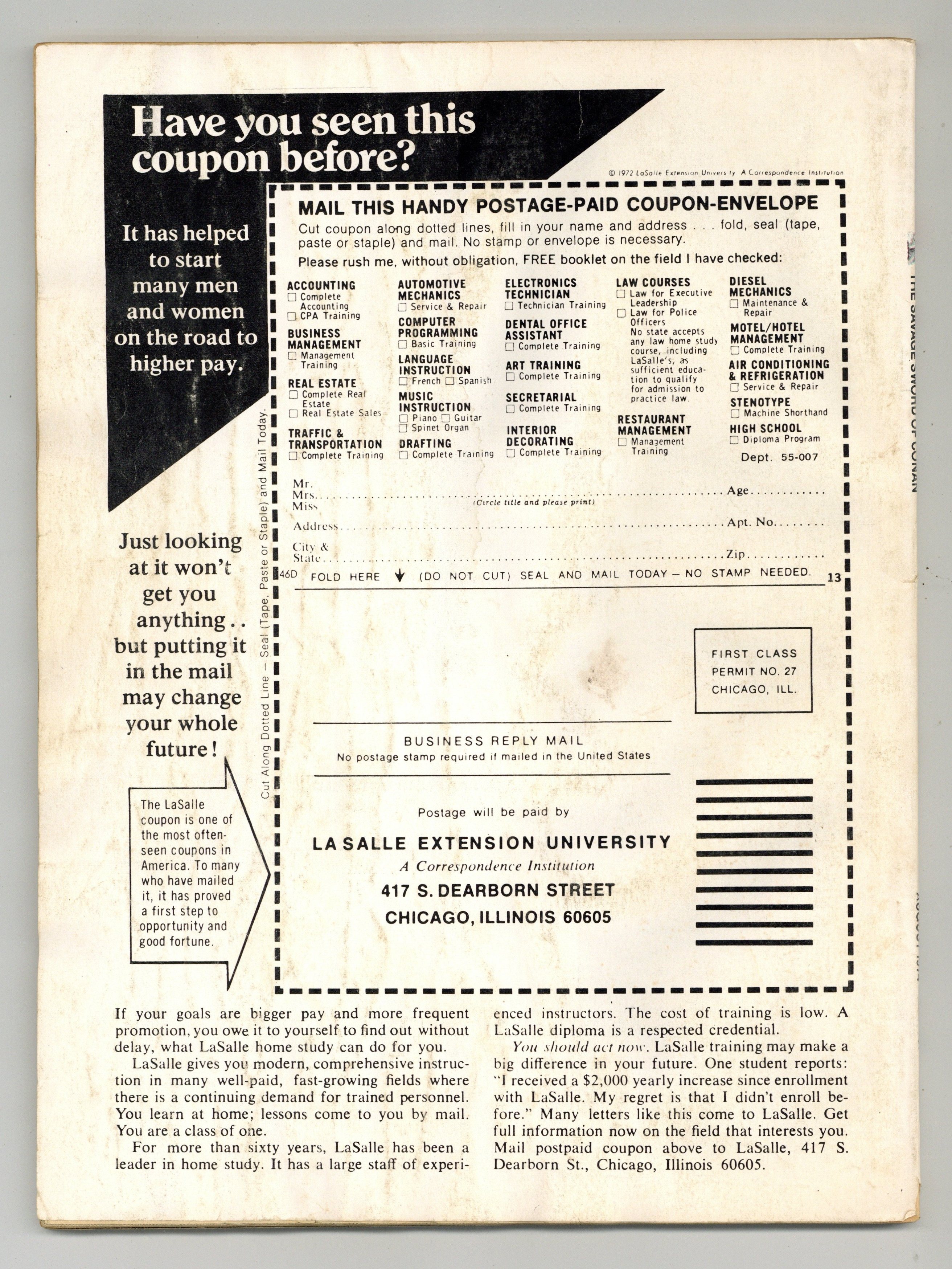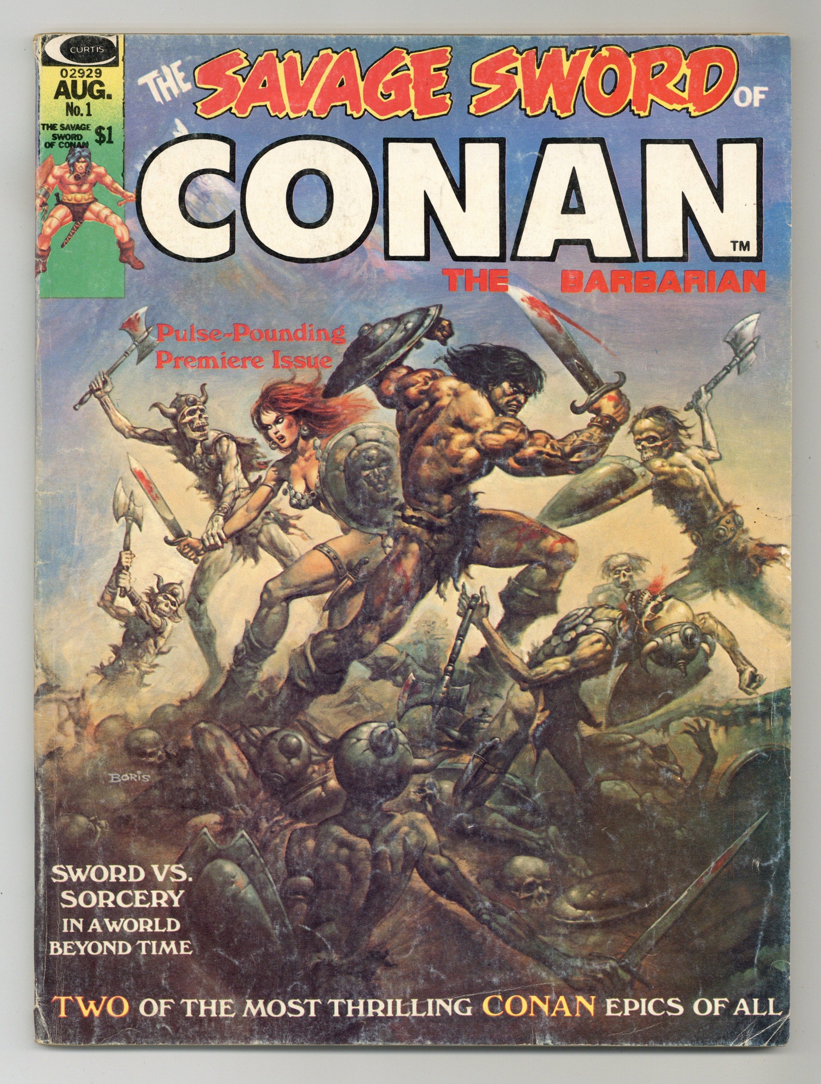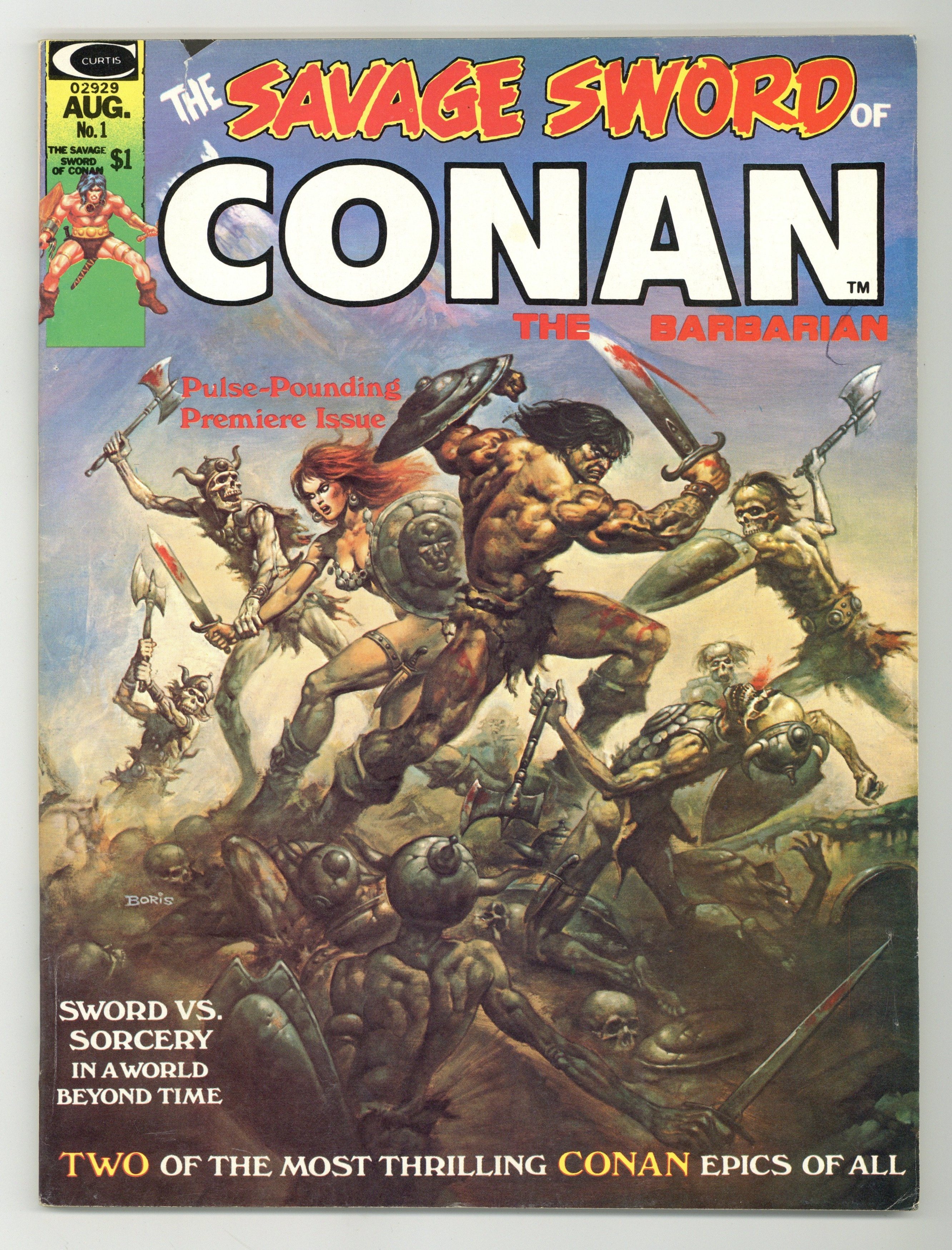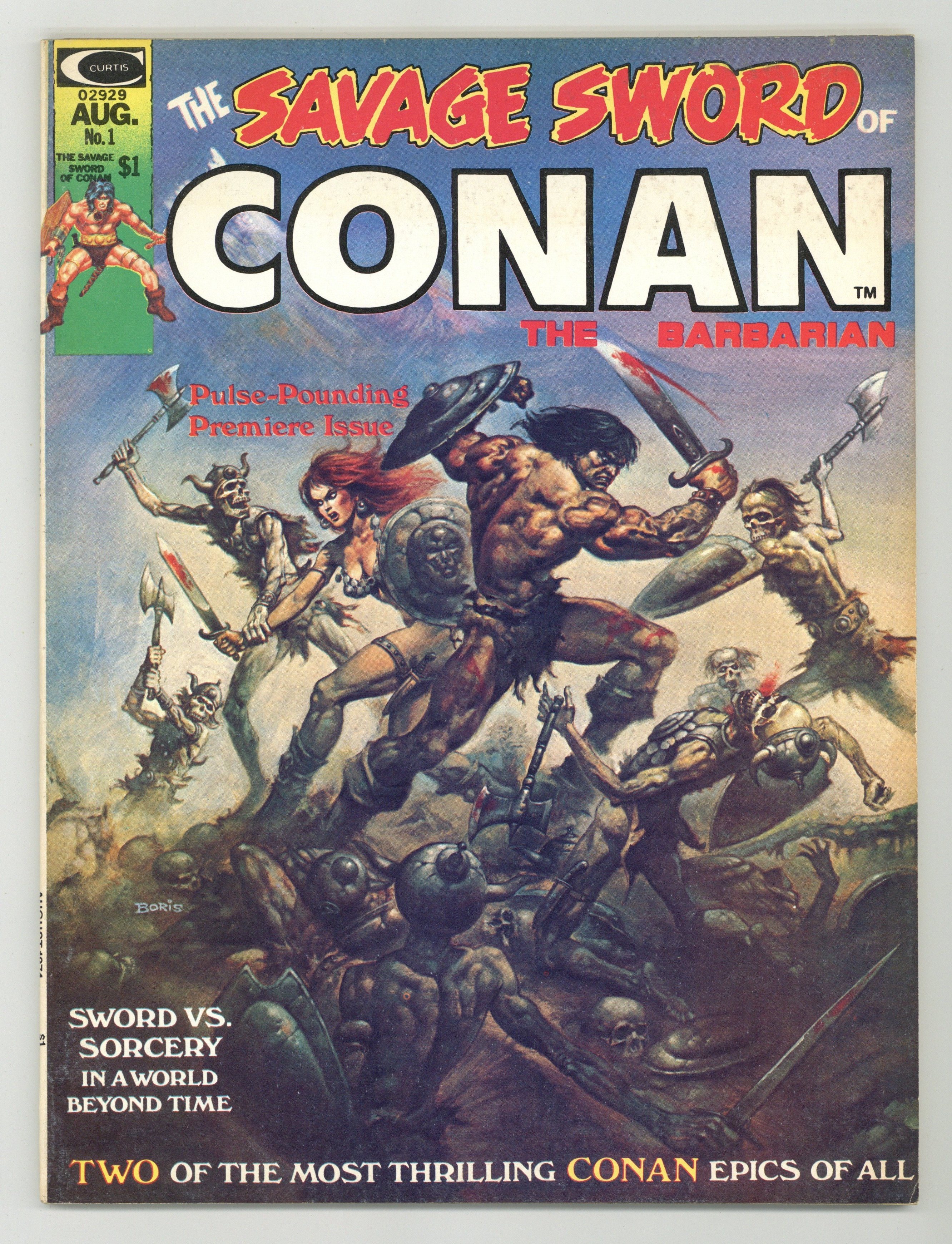 Painted cover art by Boris Vallejo. Conan and Red Sonja star in "Curse of the Undead-Man," script by Roy Thomas, pencils by John Buscema, inks by Pablo Marcos; Conan and Red Sonja put an end to the undead sorcerer Costranno; Adapted from the story "Mistress of Death" by Robert E. Howard and Gerald Page; continued in part from Conan the Barbarian 42. "Red Sonja" (3rd appearance), script by Thomas, art by Esteban Maroto, Neal Adams, and Ernie Chan (as Ernie Chua); When Red Sonja returns with a tiara she was sent for by King Ghannif she learns her "reward" is to be made a part of his harem. "Blackmark," script and art by Gil Kane (reprinting chapter 1 from the Bantam Books paperback); a Conan reprint from Savage Tales 1 (plus the additional splash page from Conan the Barbarian 16). "The Frost Giant's Daughter," script by Thomas, art by Barry Windsor-Smith (adapted from the Howard story); Conan chases Atali across the snow, slays her two frost giant brothers, and catches her; Her father, Ymir then takes her from Conan. "Conan's Women Warriors," an article by Fred Blosser illustrated by Esteban Maroto, Steve Gan, Hugh Rankin (original Weird Tales art), and Roy Krenkel; and "An Atlantean in Aquilonia," a Kull article by Glenn Lord illustrated by John Severin and Ross Andru. Alfredo Alcala pin-up. Maroto frontispiece. 84 pgs., B&W. Cover price $1.00.