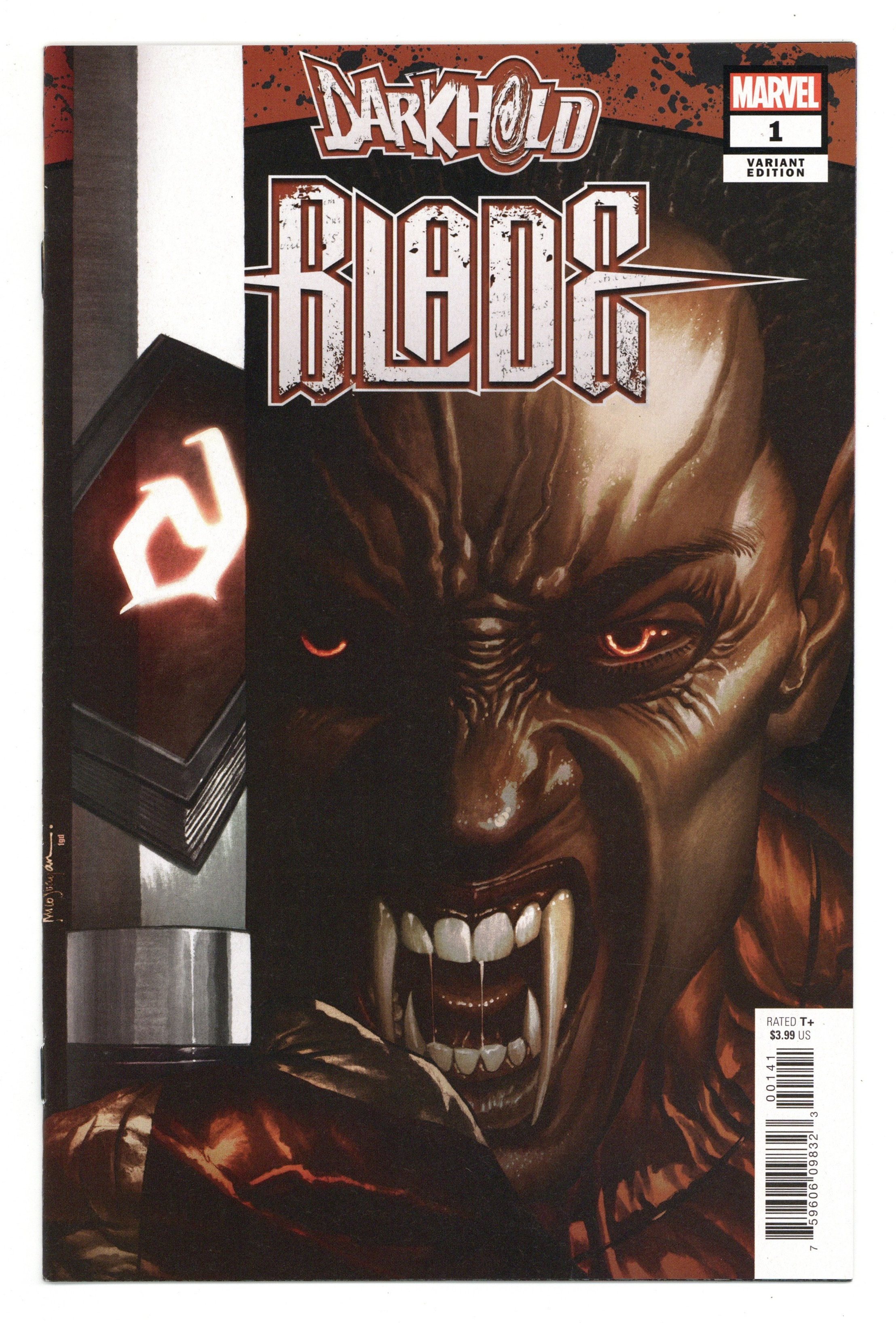 Limited 1 for 25 Retailer Incentive Variant Cover. Written by Daniel Kibblesmith. Cover by Mico Suayan. THE KING OF DEATH! Are you fanged, or are you food? The world is divided into humans and vampires - and Blade, the one who walks between them both… and kills with equal impunity. After reading from the cursed Darkhold, Blade and a cadre of other heroes were meant to enter Chthon's dimension and stop the ancient god from destroying the Multiverse. But reading the book has changed all their lives and histories… and for Blade, the consequences are far-reaching. Vampires rule the world, and he rules over them all. But there are some heroes left - and Blade is not as omniscient as he thinks. 28 pages, full color. RATED T+ Cover price $3.99.