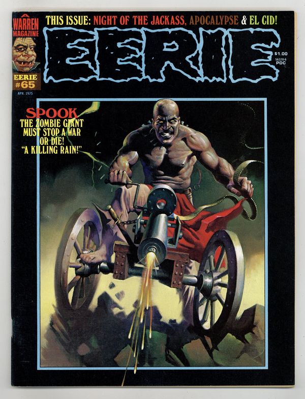 "Night of the Jackass: Endstorm" (script by Bruce Bezaire, art by Jose Ortiz), "The Hacker is Back" (script by Steve Skeates, art by Alex Toth), Spook in "Coming Soon--a Killing Rain" (script by Budd Lewis, art by Leopold Sanchez), "El Cid and the Troll" (script by Lewis, art by Gonzalo Mayo), and "Apocalypse: The Death" (script by Lewis, art by Jose Ortiz). 1 page Berni Wrightson art. This issue also lists the winners of the 1974 Warren Awards: best cover (Sanjulian), best art (Jose Gonzalez for "Sultan's Revenge" in Vampirella 33), best writer/artist (Berni Wrightson for "The Pepper Lake Monster"), best story (Budd Lewis for "Excerpts from the Year Five"), best all-around artist (Jose Ortiz), best all-around writer (Budd Lewis), and special award for excellence (Ken Kelly). This issue also lists the winners for the previous four years of Warren Awards (1970-73). Statement of ownership--average print run 163,780; average paid circulation 90,595. Ken Kelly painted cover. Cover price $1.00.