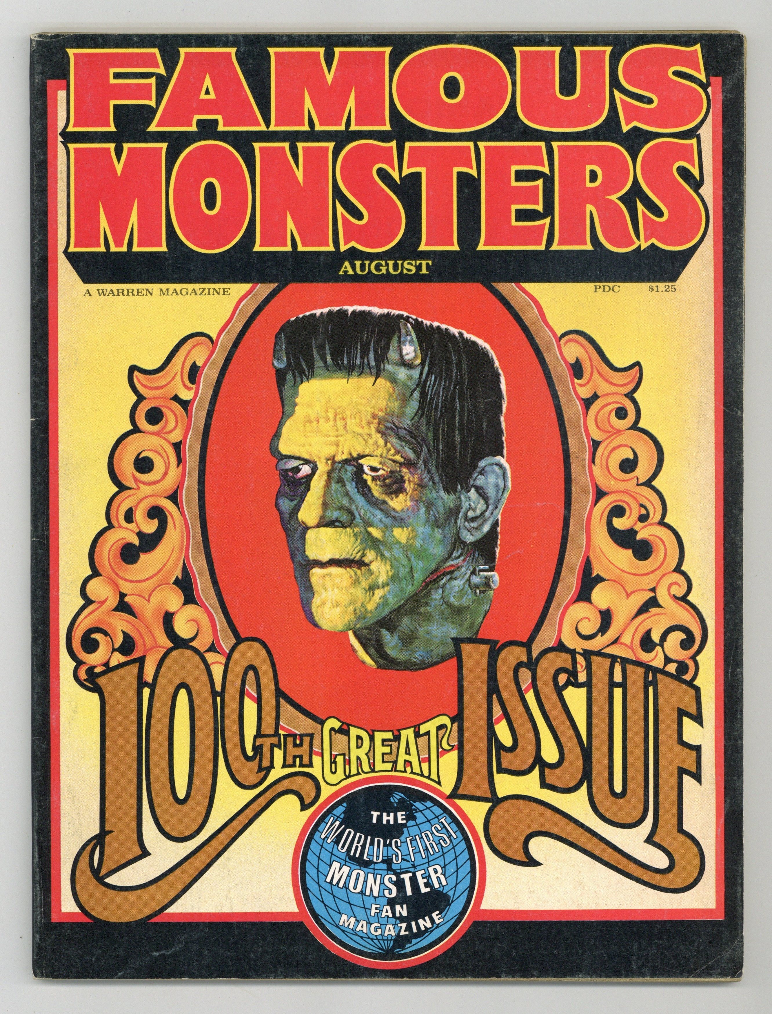$24.00Features in this special anniversary issue include: obituary of Edward G. Robinson; a feature on the first 15 years of FM; a continuation of the Lugosi filmography; Mae Clark interviewed by Forry; "Kong Men Die" (obits for Robert Armstrong and Merian C. Cooper): "Professor Gruebeard"; and more. Boris Karloff as the Frankenstein monster cover painting is by Basil Gogos, a natural for the 100th issue. The back cover is an enlargement of the front cover painting of Karloff. Cover price $1.25.