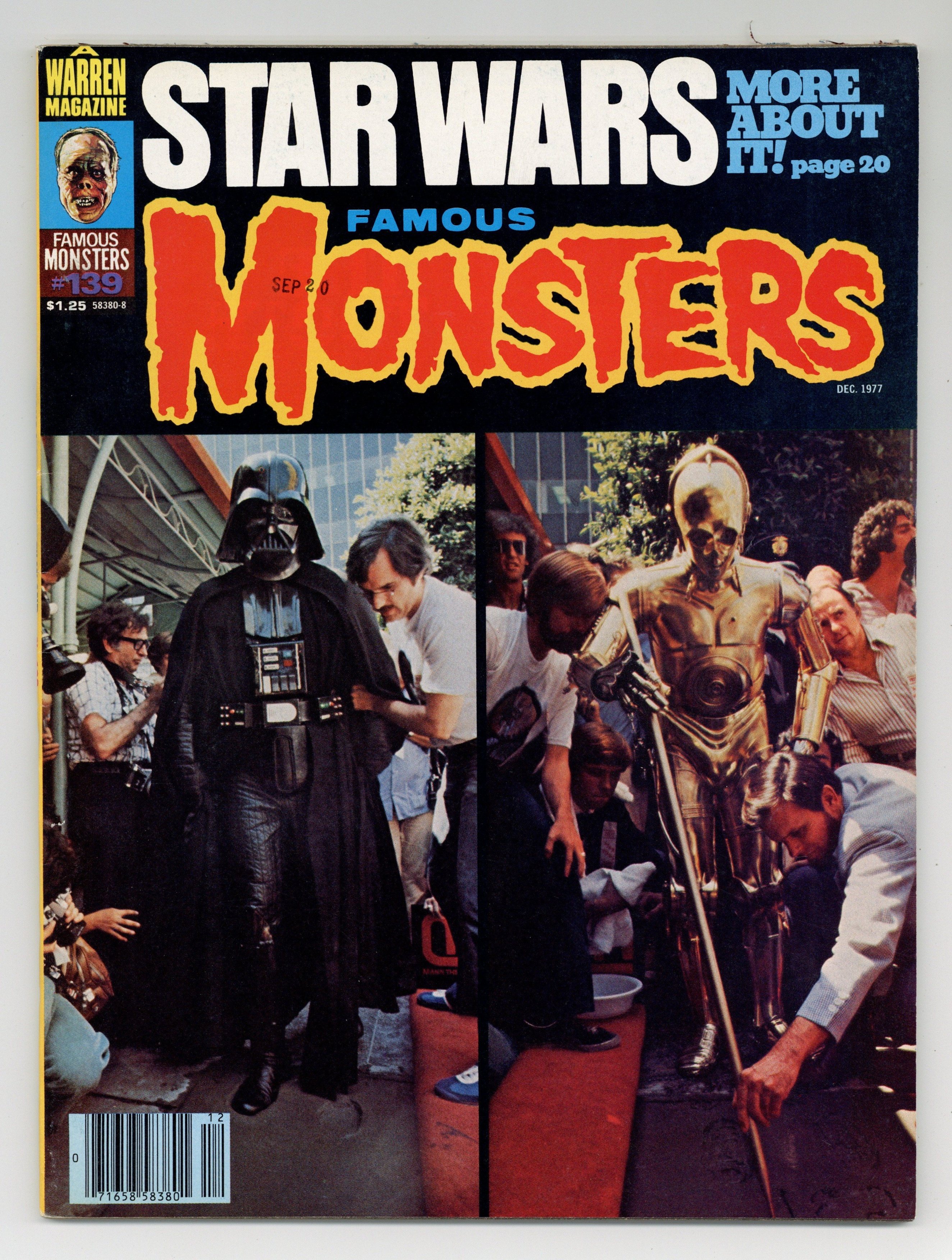 $17.00Features in this issue include: part two of The Fearless Vampire Killers filmbook; Obituaries of Allison Hayes and Ricardo Cortez; article on werewolf lore and myth; feature on The Tribe; speculation on life in outer space; and more. The cover, which is the third one in a row featuring Star Wars, shows Darth Vader and C-3PO immersing their feet in cement outside Mann's Theatre. Cover price $1.25.