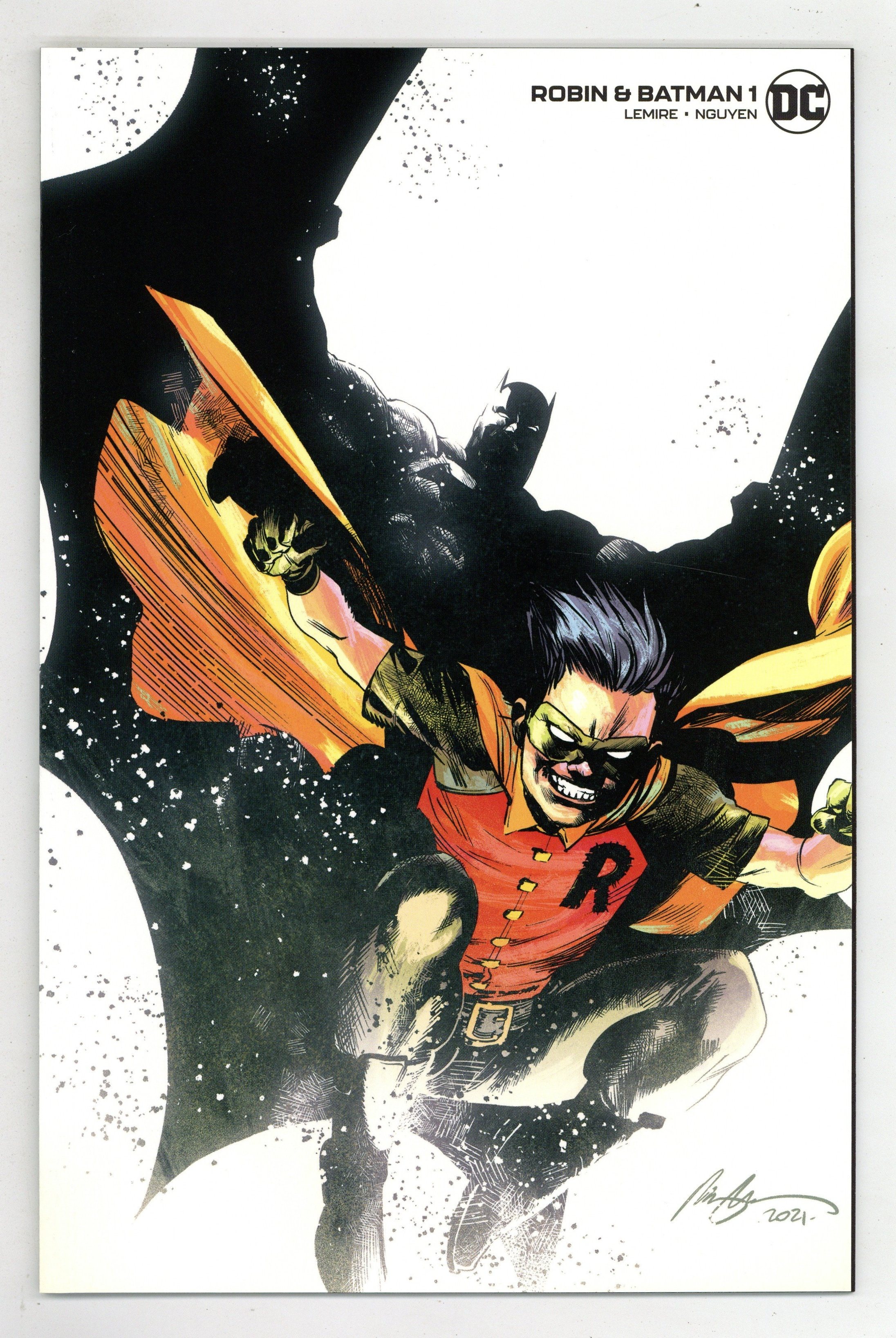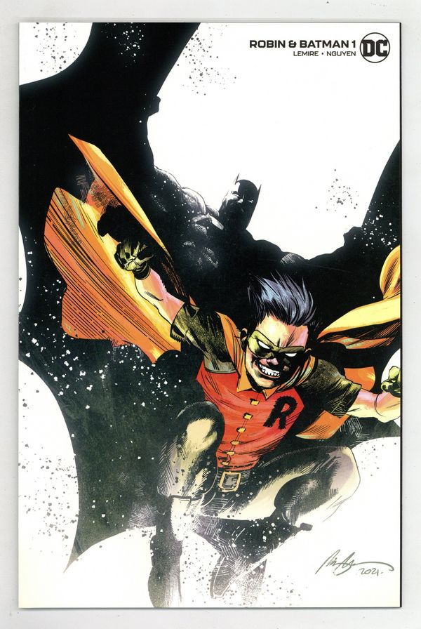 Limited 1 for 25 Retailer Incentive Variant Cover. Written by Jeff Lemire. Art by Dustin Nguyen. Cover by Rafael Albuquerque. The legendary story of Batman and Robin has reached nearly mythic proportions: the crime-fighting Dynamic Duo, always one step ahead of the criminals they pursue and never meeting a case too big. This isnt that story. This is the story of a young Dick Grayson, newly orphaned, struggling to find his way in a strange, difficult, dark new world…This is the story of Robin and Batman. The bestselling creative team behind the Eisner-winning Descender, Jeff Lemire and Dustin Nguyen, reunite in Gotham City to tell the story of a remarkable young man learning to navigate an incredible new world! 40 pages, full color. Rated T+ Cover price $5.99.