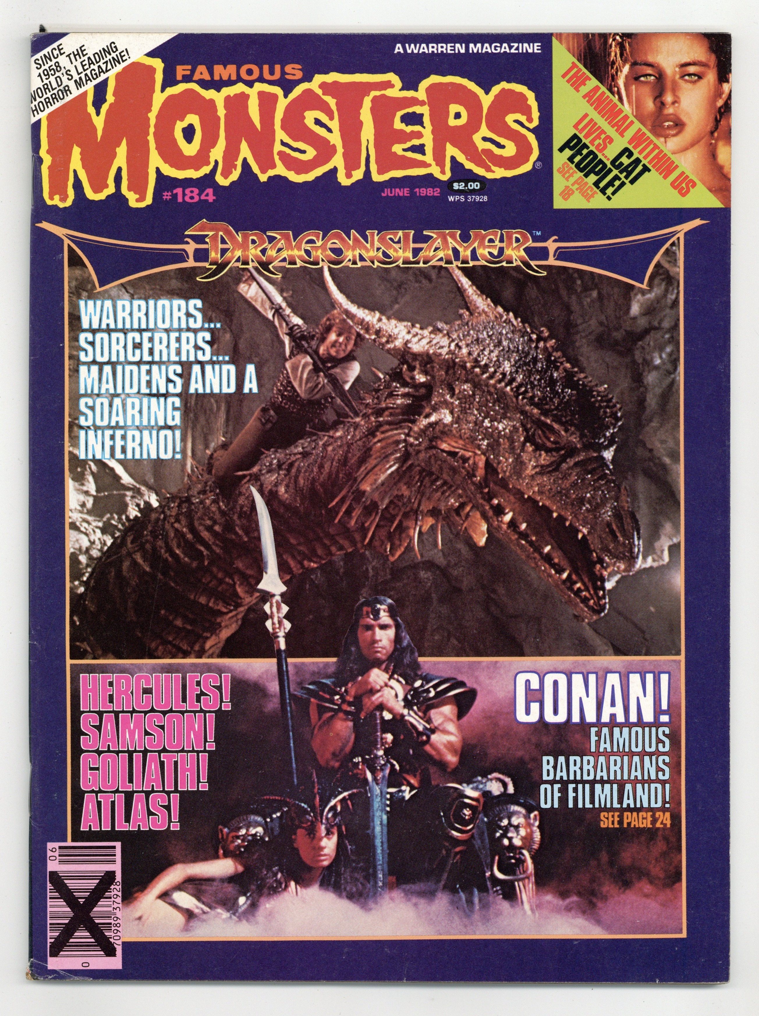 $13.00Features in this issue include: appreciation of Dragonslayer by Tim Moriarity; overviews of the original Cat People and the remake; "B.C. = Before Conan-Famous Barbarians of Filmland"; "Godzilla, The Jolly Japanese Giant"; list of Famous Monsters readers who have become pros; part two of feature on winged monsters in the movies; and more. Cover photos are from Dragonslayer and Conan the Barbarian. Cover price $2.00.