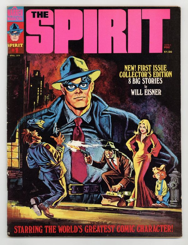 Published by Warren for the first 16 issues (and by Kitchen Sink beginning with 17), The Spirit reprints Will Eisner's groundbreaking work from the 1940s and '50s. Cover art by Basil Gogos. Introductory text with illustration and photograph of Will Eisner. "The Last Trolley," script by Will Eisner, pencils by John Spranger and Bob Palmer (splash), inks by Will Eisner and Bob Palmer (splash); Hop aboard a $100,000 ride into mystery; Travel Death's twisted track to Raven's Point; For The Spirit, it could be a one-way trip! "Escape," script and pencils by Will Eisner, inks by Will Eisner and Jerry Grandenetti; The Spirit never sleeps; Neither does the criminal mind; Watch as three escaped convicts find that the world is a prison for those who would flaunt justice! "Li'l Adam," script by Will Eisner, pencils by Will Eisner and Jules Feiffer (most of pg 6), inks by Will Eisner and Jerry Grandenetti; Parodies of Lil Abner, Dick Tracy and Little Orphan Annie. "The Criminal," script and pencils by Will Eisner, inks by Will Eisner and Jerry Grandenetti; A cop is shot; The Spirit is wounded; Tough gangland figures are held at bay; And behind it all is one Mr. Sawbuck—a seven year old boy! "El Spirito," script and pencils by Will Eisner, inks by Will Eisner and Jerry Grandenetti; The Spirit has witnessed many strange things on rainy nights; But tonight is the first time he has ever followed a ghost. "The Killer," script by Will Eisner, pencils by John Spranger, inks by Will Eisner and Bob Palmer; Henry the war-hero is back. "A Granule of Time," script and pencils by Will Eisner, inks by Will Eisner and Jerry Grandenetti; A hostile visitor from the year 2400. "The Partner," script and pencils by Will Eisner, inks by Will Eisner and Jerry Grandenetti; The Spirit is slaughtered by Slinko Joe Daws; Now there's no one to save a helpless Central City from the nefarious clutches of Slimy Skinch and Co. 76 pgs., B&W. Cover price $1.00.