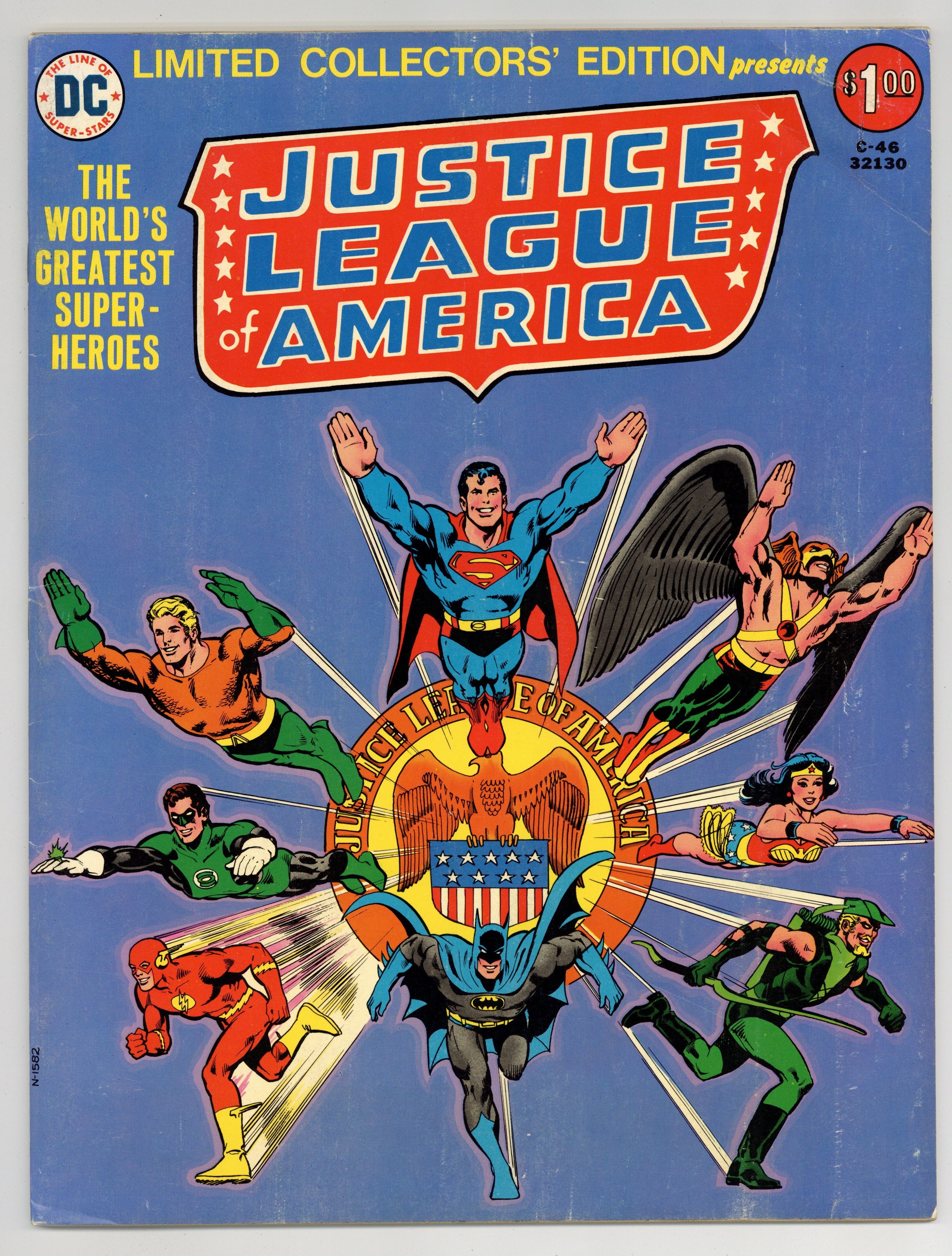 Tags: Treasury Sized Editions (part C46)$13.00Limited Collectors' Edition: Justice League of America reprints. Decoy Missions of the Justice League, script by Gardner Fox, art by Mike Sekowsky and Bernard Sachs; Kanjar Ro, the villain from the planet Dhor, conceives a brilliant scheme to steal the entire Earth—without the Justice League even knowing it; guest-starring Adam Strange. The Deadly Dreams of Dr. Destiny, script by Gardner Fox, art by Mike Sekowsky and Bernard Sachs. Two-page JLA pinup by Austin and Giordano. The JLA on TV featuring Alex Toth Super Friends art. Treasury-sized. 52 pgs. Size is 10 x 13-1/2" (about the size of a Life magazine). Cover price $1.00. Cover price $1.00.