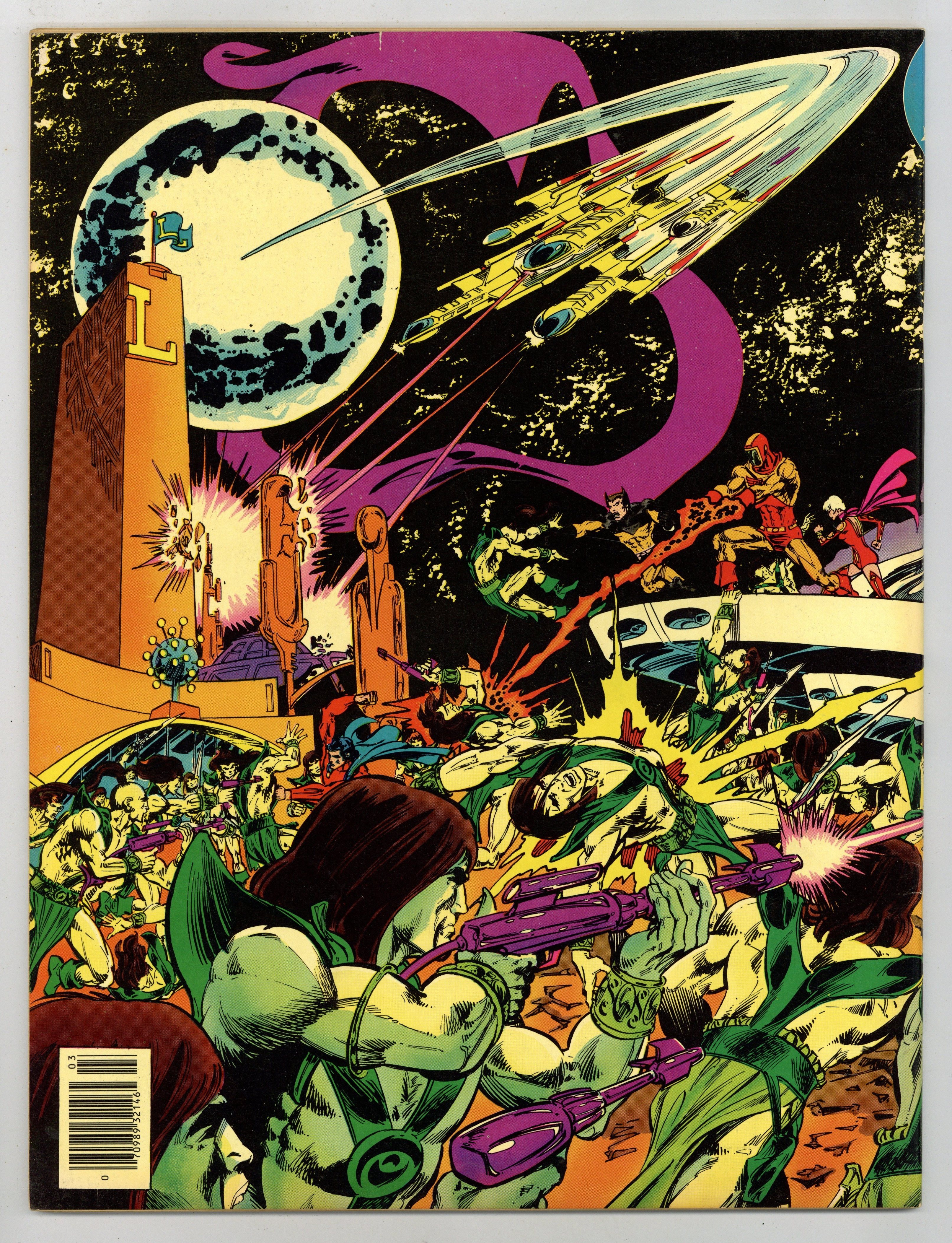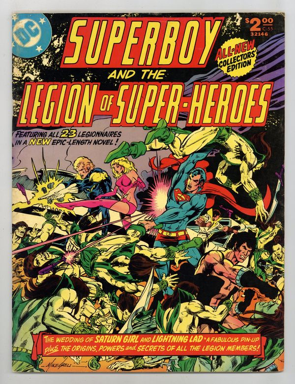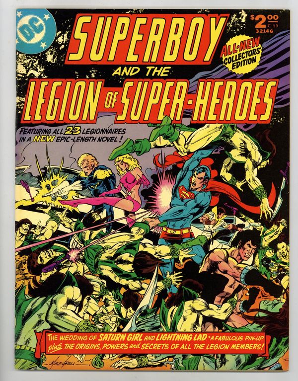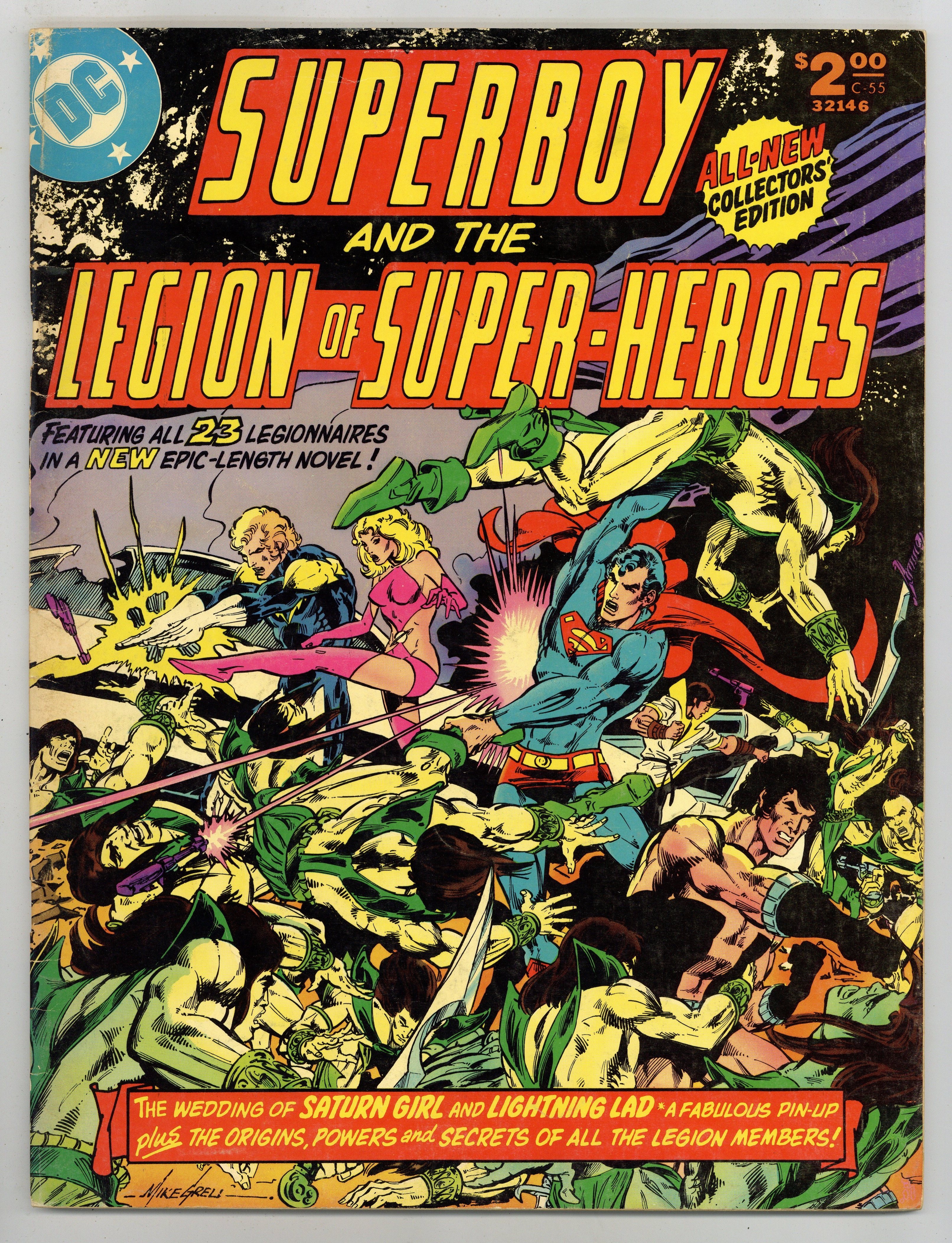 Wrap around cover by Mike Grell. The Millennium Massacre. 62 pages. Story by Paul Levitz. Pencils by Mike Grell. Inks by Vince Colletta. Superboy arrives in the future for the wedding of Saturn Girl and Lightening Lad only to find a world totally different from the one he is used to visiting. The future is now an armed camp. Whats more, the legionnaires insist it has always been that way. With Superboy unable to convince his teammates something is wrong, the wedding proceeds as planned, only to have the bride and groom kidnapped by the Lunarites. Convinced that the altering of history is the real issue, Superboy leads a group of legionnaires back in time, while the rest of the group attempts to rescue their teammates. Can Superboys team correct the flow of time and save all of the future? This story takes place between issues 237 and 238 of Superboy (1949-1979 first series). Includes a 2 page pin up of the entire Legion by Mike Grell and Vince Colletta. Includes an 8 page feature containing information on each of the legionnaires by Paul Levitz, illustrated by James Sherman and Jack Abel. 72 pages. Full color. Size is 10 x 13-1/2" (about the size of a Life magazine). Cover price $2.00.