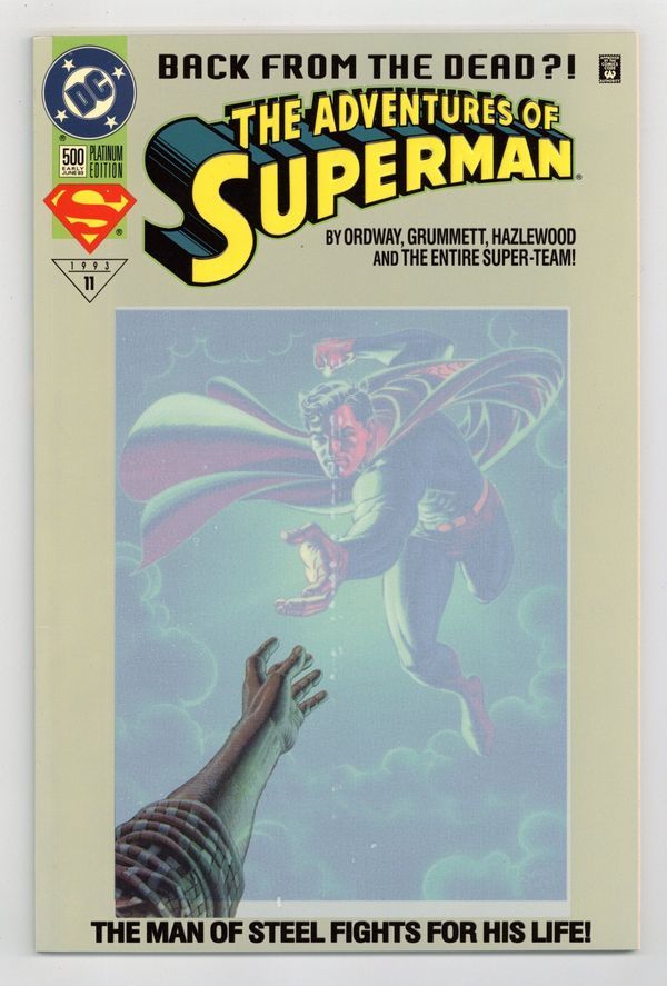 Error Edition without silver ink. Platinum Edition - UNBAGGED (black polybag is missing or has been opened). Cover by Jerry Ordway. Written by Jerry Ordway, Louise Simonson, Roger Stern, Karl Kesel and Dan Jurgens. Art by Tom Grummett, Jon Bogdanove, Butch Guice, Dan Jurgens, Brett Breeding, Doug Hazlewood, Dennis Janke and Denis Rodier. "Life After Death!" by Jerry Ordway, Tom Grummett and Doug Hazlewood - After suffering a heart attack, Jonathan's spirit joins Clark's in the astral plane. Jonathan must get Clark to clear his head, or else he might end up in Blaze's domain...forever. 8 extra story pages replace ad pages that are in the standard edition. Characters in this story: Gangbuster [Jose Delgado]; Cat Grant; Inspector Bill Henderson; Jonathan Kent; Martha Kent; Lois Lane; Jimmy Olsen; The Prankster; Superman [Clark Kent]; Kismet; Harry Kent (hallucination); Peter; Vincent Edge; Ty; Ron Troupe; High-Pockets; Cindy; Clarice Day; Cleric (demon; villain); Blaze [Angela Blaze] (villain). Also: 4-page Steel story "First Sighting" by Louise Simonson, Jon Bogdanove and Dennis Janke - In the midst of a battle between rival gangs, John Henry Irons rises from the rubble of the battle between Superman and Doomsday. Characters in this story: John Henry Irons; White Rabbit [Angora Lapin] (first appearance; villain); The Dragons [Homes; Wheels; Hype (death)] (villains); The Sharks (villains). Story continues in Superman The Man of Steel (1991) #22. Plus: 4-page Eradicator story "First Sighting" by Roger Stern, Butch Guice and Denis Rodier - A guy tries to hijack a car, and is pursued by the cold Last Son of Krypton. Characters in this story: The Eradicator; Darryl Wilbur (first appearance; villain). Story continues in Action Comics (1938 DC) #687. And: 4-page Superboy story "First Sighting" by Karl Kesel, Tom Grummett and Doug Hazlewood - Superboy escapes from Cadmus with the help of the Newsboy Legion. Characters in this story: The Newsboy Legion [Big Words; Flip; Gabby; The Guardian; Scrapper; Tommy Tompkins, Jr.]; Superboy [Conner Kent/Kon-El]; Paul Westfield; Carl Packard. Story continues in Adventures of Superman (1987) #501. Also: 4-page Cyborg Superman story "First Sighting" by Dan Jurgens and Brett Breeding - Superman returns to Metropolis, but portions of his body have been replaced with cybernetic parts. Character in this story: Cyborg Superman [Hank Henshaw]. Story continues in Superman (1987 2nd Series) #78. 64 pages, full color.