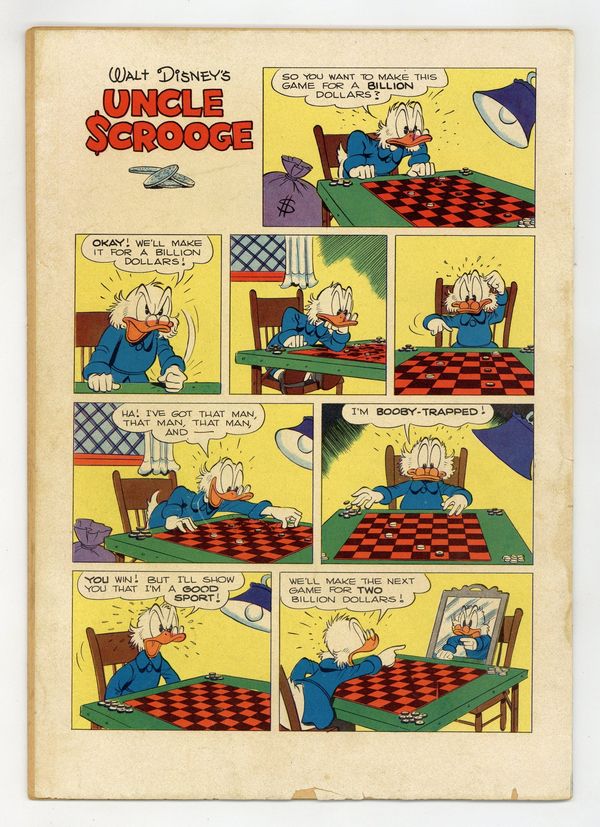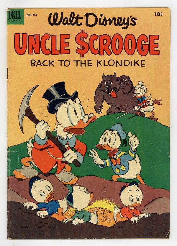 Indicia title is "Walt Disney's UNCLE SCROOGE, BACK TO THE KLONDIKE, No. 456." Cover art by Carl Barks. Back to the Klondike, script and art by Carl Barks; Scrooge takes pills to restore his failing memory, and immediately recalls the location of bag of nuggets he cached in the Yukon fifty years before; When the ducks arrive in the Klondike, they find that Scrooge's claim has been taken over by Glittering Goldie, a former dance hall girl Scrooge knew in the gold rush days--and who still owes Scrooge a thousand dollars, plus interest. Somethin' Fishy Here, script and art by Carl Barks; Donald pastes up a fake newspaper that convinces Scrooge that fish have been made the official money of the land. Back cover strip by Barks. 36 pages, full color. Cover price $0.10.