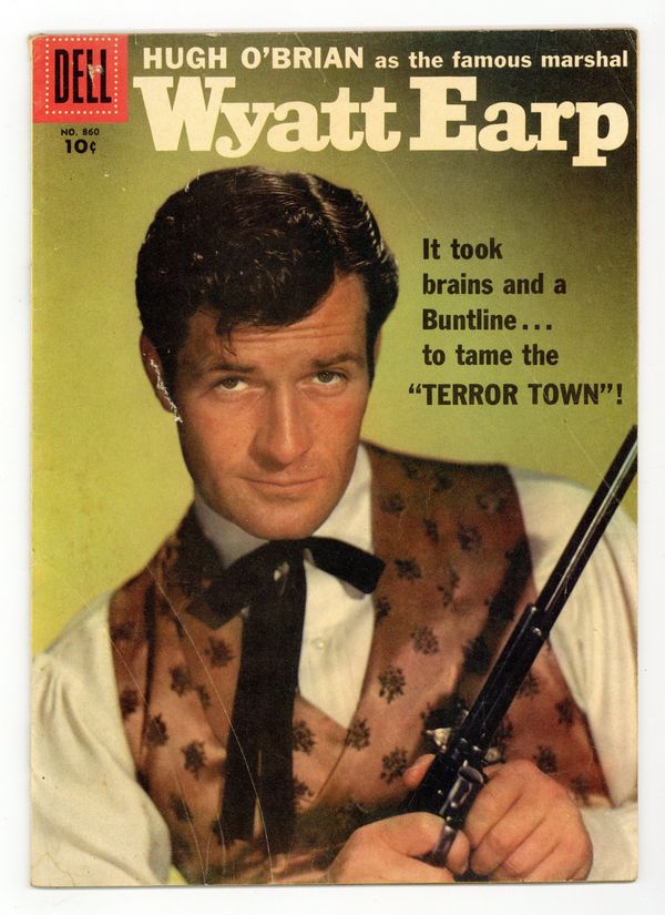 10ยข Edition. Indicia title is "WYATT EARP, No. 860." Based on the "Wyatt Earp" TV series. Cover photo of Wyatt Earp (as played by Hugh O'Brian). Terror Town, script by Eric Freiwald and Robert Schaefer, art by Russ Manning; After gunmen rob a stage and take the Mayor of Dodge City hostage, Wyatt Earp and his deputy track them to an old Army post on a high mesa. Doomsday at Dodge City, script by Eric Freiwald and Robert Schaefer, art by Russ Manning; Bank robber Loop Hackett comes to Dodge to settle a score with Wyatt Earp. Short biography of frontier law officer Bill Tilghman, art by Manning. An account of a showdown between Wyatt Earp and Clay Allison, art by Manning. 36 pages, full color. Cover price $0.10.
