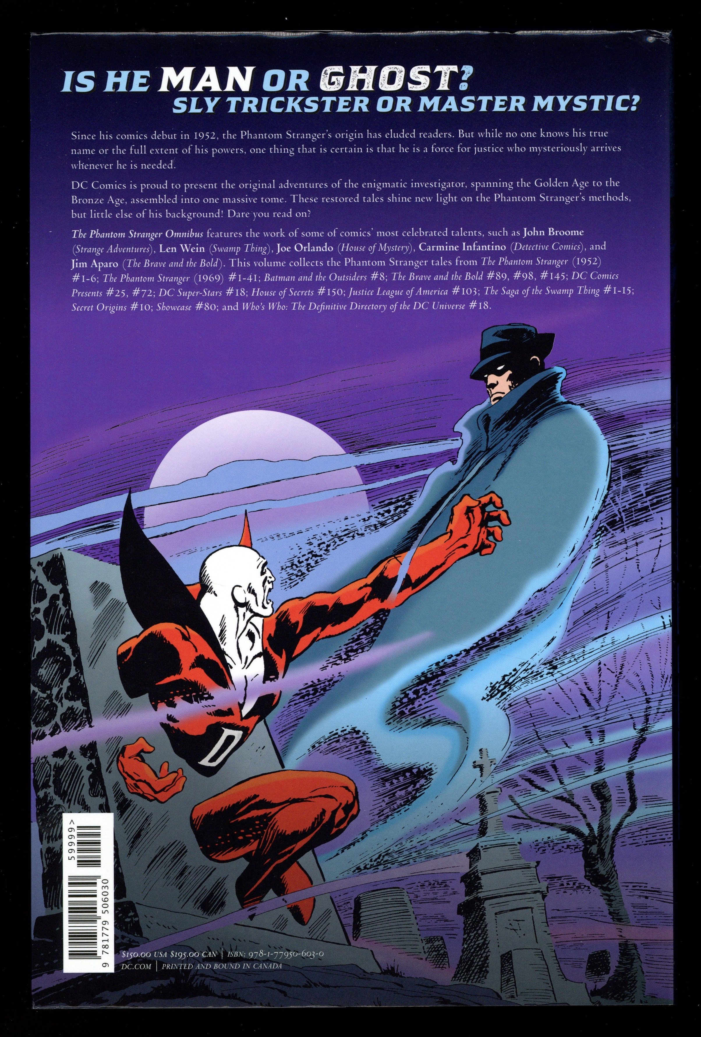 1st printing. Collects The Phantom Stranger (1952 1st Series) #1-6, The Phantom Stranger (1969-1976 2nd Series) #1-41, Batman and the Outsiders (1983-1987 1st Series) #8, stories from The Saga of the Swamp Thing (1982-1996 2nd Series) #1-13, Who's Who The Definitive Directory of the DC Universe (1985-1987) #18, The Brave and the Bold (195-1983 1st Series DC) #89, 98, and 145, Showcase (1956-1978) #80, Justice League of America (1960-1987 1st Series) #103, The House of Secrets (1956-1978 1st Series) #150, DC Super Stars (1976-1978) #18, Secret Origins (1986-1990 DC 2nd Series) #10 and DC Comics Presents (1978-1986 DC) #25, and 72. Written by Manly Wade Wellman, John Broome, Mike Friedrich, Otto Binder, Robert Kanigher, Mike Sekowsky, Bob Haney, Denny O'Neil, Joe Orlando, Len Wein, Gerry Conway, Michael Pellowski, Marv Wolfman, Arnold Drake, Guy Lillian, David Michelinie, Martin Pasko, Paul Levitz, Bruce Jones, Mike W. Barr, Joey Cavalieri, Nicola Cuti, Dan Mishkin, Paul Kuppergerg, and Alan Moore. Art by Carmine Infantino, Sy Barry, Joe Giella, Frank Giacoia, Bernard Sachs, Murphy Anderson, Gene Colan, Murphy Anderson, Bernard Sachs, Jerry Grandenetti, Bill Draut, Neal Adams, Mike Sekowsky, Vince Colletta, Frank Springer, Dick Giordano, Joe Orlando, Ross Andru, Mike Esposito, Jim Aparo, Tony DeZuniga, Dick Dillin, Dick Giordano, Gerry Talaoc, Mike Grell, Fred Carrillo, Bob Layton, Frank McLaughlin, Dan Spiegle, Tony DeZuniga, Howard Bender, Bo Hampton, Scott Hampton, Alex Saviuk , Dennis Jensen, Jose Luis Garcia-Lopez, Ernie Colon, Pablo Marcos, and Joe Orlando. Cover by Neal Adams. Back Cover art by Jim Aparo. A supernatural hero with origins shrouded in mystery, the Phantom Stranger is one of DCs most enigmatic characters. This omnibus collects the Phantom Strangers earliest adventures in the 1950s, his late-1960s revival, and early-1980s stories in the pages of The Saga of the Swamp Thing. Through it all, the Phantom Stranger has remained one of the most unique characters in comics, navigating the weird, scary side of the DC Universe! Hardcover, 8 1/2-in. x 11-in., 1,200 pages, full color. Cover price $150.00.