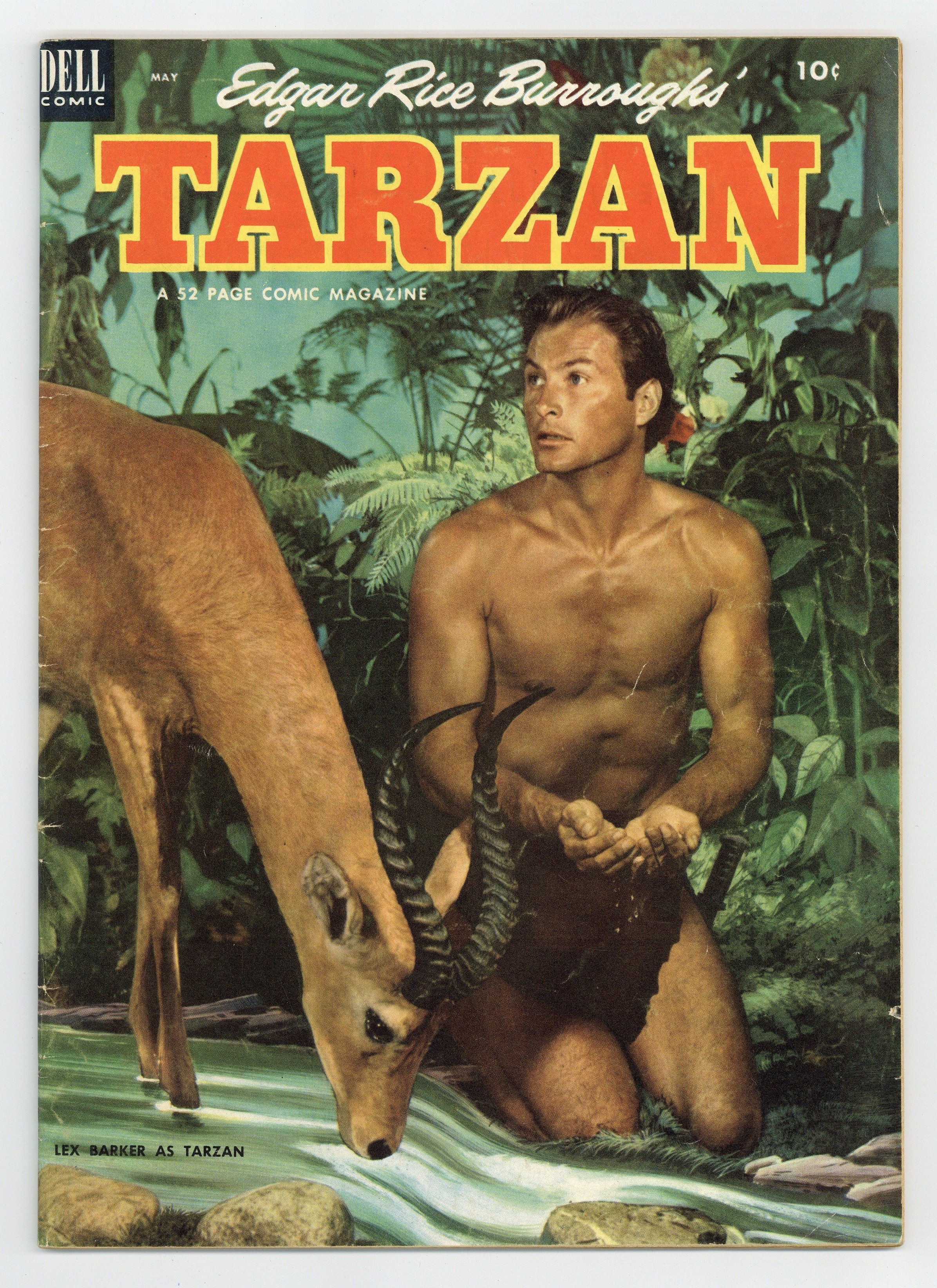 Published May 1953 by Dell/Gold Key.$17.50Lex Barker photo cover. "Tarzan and the Little Spearmen," script by Gaylord Du Bois, art by Jesse Marsh; Tarzan and Muviro help a race of small people battle giant vultures that are menacing them. "Tarzan and the Strange Balu," script by Gaylord Du Bois, art by Jesse Marsh; When the plane carrying Barbara Wales and her baby crashes in the jungle, one of the apes adopts her baby and Tarzan must help return the child to its rightful mother. "Down the River" text story starring Mabu. "Brothers of the Spear," script by Gaylord Du Bois, art by Russ Manning; Dan-El and Natongo spoil a witch doctor's attempt to convince a city to join his army. Argus illustration by Jesse Marsh. Phil Rizzuto Sparks Yankees ad for Wheaties. 52 pages, full color. Cover price $0.10.