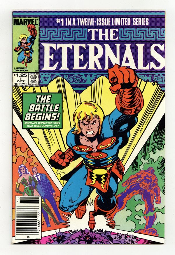 Direct Edition. "A Mirror for Mortality!" Written by Peter B. Gillis. Pencils by Sal Buscema. Inks by Al Gordon. Cover by Walt Simonson. Years have passed since the return and judgment of the Celestials. However, only a handful of mortals remember the ordeal with the space gods. One man tries to reveal the truth but no one believes him. Meanwhile, the Eternals, immortal heroes of myth and legend, trying living amongst their mortal cousins and waiting for the return of the Celestials. However, the dark spawn known as the Deviants plot and scheme from the shadows. Can it be long before these demonic monsters strike out against their hated enemies? Includes a 4-page back-up tale which reveals the Eternals influence throughout mankind's history. Note: First appearance of Khoryphos, Cybele, and Phastos. Cover price $1.25.