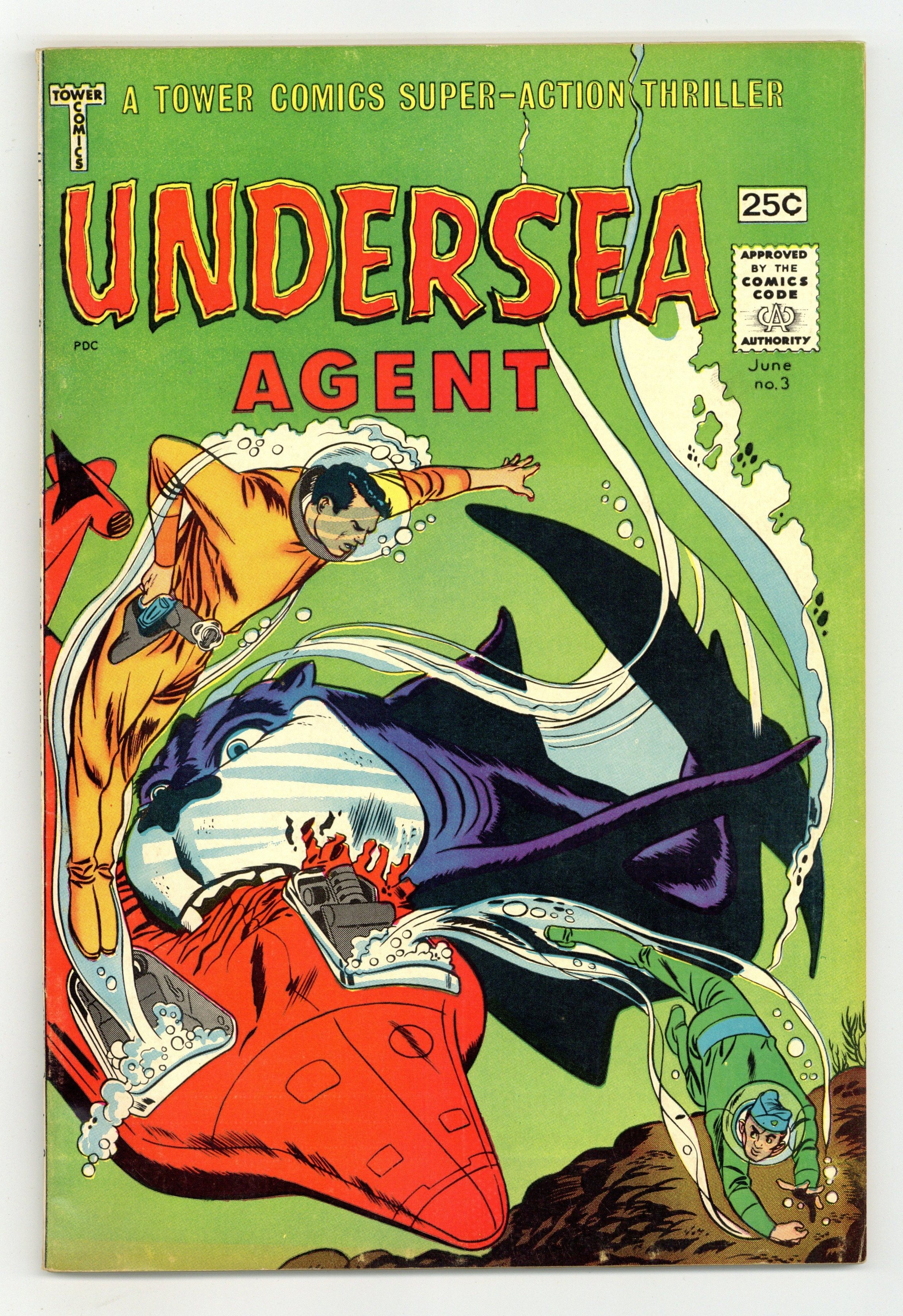 Cover by Mike Sekowsky and Frank Giacoia. Stories and art by Gil Kane, Steve Skeates, Ray Bailey, John Giunta, Mike Sekowsky and Frank Giacoia. A spinoff of Tower's THUNDER Agents books, as Lt. Davey Jones and hero-team UNDERSEA defend the Earth's oceans from super-villainy. Davey's date is interrupted by agents of Dr. Mayhem, so he trails them back to the mad scientist's island hideout. Electric-powered Davey gains the power of super-magnetism, in a story featuring early art by future Marvel legend Gil Kane. An enemy sends an android duplicate of Lt. Jones to Atlantis - but which enemy? To Save a King; At the Mercy of Dr Mayhem; The Panther Whales; The Will Warp; True or False. 64 pages, Full Color. Cover price $0.25.