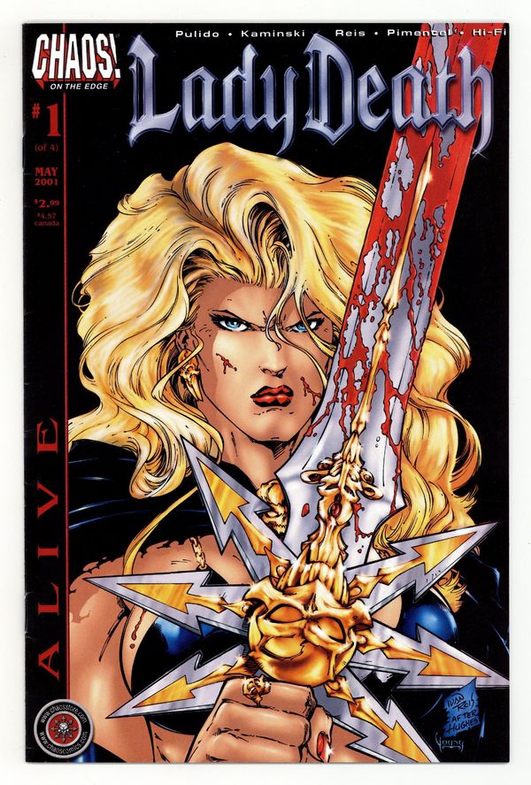 by Brian Pulido, Len Kaminski, & Various. Chaos! launches into the 21st century with a new take on Lady Death that's perfect for a new generation of readers! Gone is the pale skin, pupiless eyes, steely remote exterior, and white hair. Now she's real flesh and blood ?? mortal! At the crossroads of her destiny, Lady Death finds herself seemingly abandoned by her mentor, the Grim Reaper. Without her immense power can she survive the apocalyptic badlands and reclaim her power? Or, will her newfound humanity take her in another direction all together?! Each issue of Lady Death: Alive is now completely self-contained. FC, 32pg (1 of 4 Cover price $2.99.