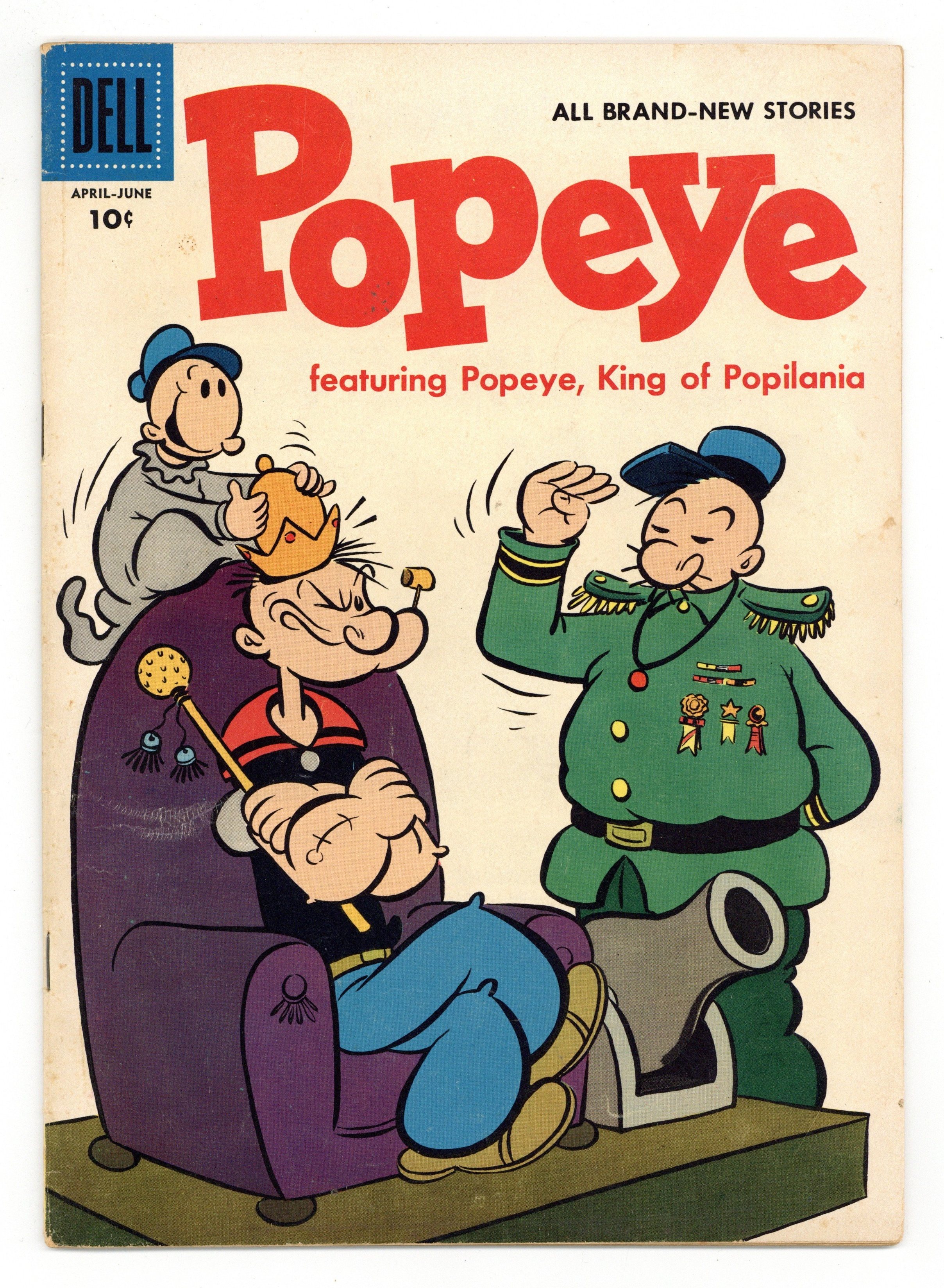 Published Jun 1956 by Dell/Gold Key/Whitman.$18.50Cover art by Bud Sagendorf. Scripts and art by Bud Sagendorf. Untitled one-page story; Popeye wants to be a king so he buys a deserted island from his friend King Blozo and names it Popilania, but before long Blozo wants to borrow more money and then declares war on Popeye's new country. Pappy's Spook!; Pappy pretends to be a ghost to hoodwink Popeye. Untitled story; The Professor invents an atomic compressor and shrinks Sappo's house but it doesn't enlarge so neatly. Canned Nuts text story. Untitled one-page story; Wimpy prefers to catch hamburgers instead of fish. Based on the classic cartoon and comic strip character. 36 pages, full color. Cover price $0.10.