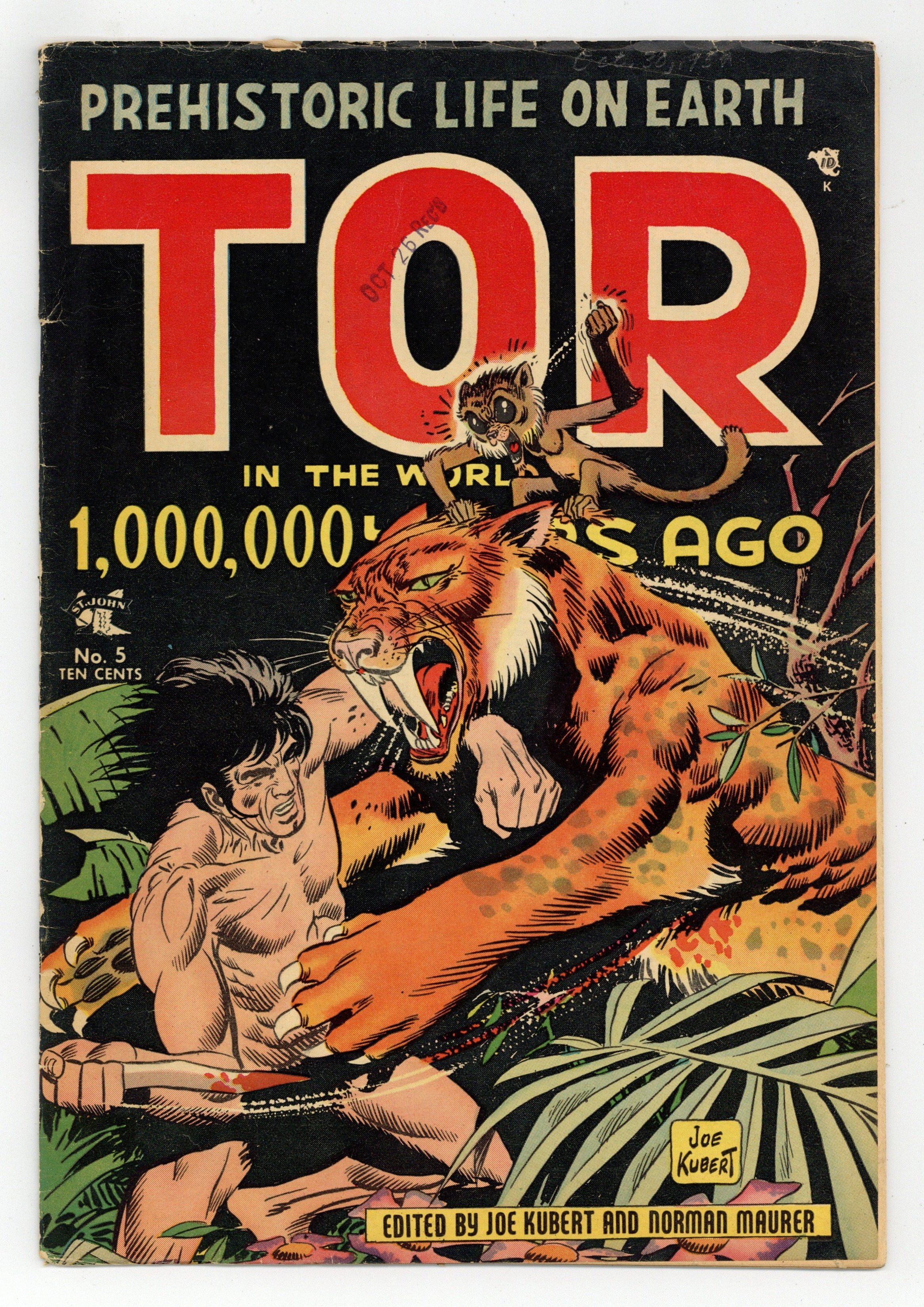 Cover by Joe Kubert. Stories and art by Joe Kubert and Norman Maurer. Comics legend Joe Kubert won fans early in his career with his tales of Tor, a caveman struggling for survival in a world where humans co-exist with dinosaurs. Tor saves the cave-boys Tik and Tok from a pteranodon nest, earning the gratitude of their father the chieftain, but also the enmity of the corrupt shaman Valnu. In another story, Tor solves a prehistoric murder mystery. Tor must brave a tribe of ape-men to save a village from a deadly disease. Co-creators Joe Kubert and Norman Maurer put themselves into the comic to discuss the anti-comics hysteria of the 1950s, including the Kefauver hearings. Plus full-page dinosaur illustrations by Kubert. And an ad for the "Scholart Institute," one of Kubert's first attempts at comics art instruction, preceding the Joe Kubert School by two decades. Terrific sabre-tooth tiger cover by Kubert. Falling Fire!; Man-Beast!!!; Avenging Waters; History of Prehistoric Animals: Eryops, Dimetrodon; Danny Dreams. Final issue of the series; the saga was revived by DC two decades later as Tor (1975 DC 1st Series). 32 pages, Full Color. Cover price $0.10.