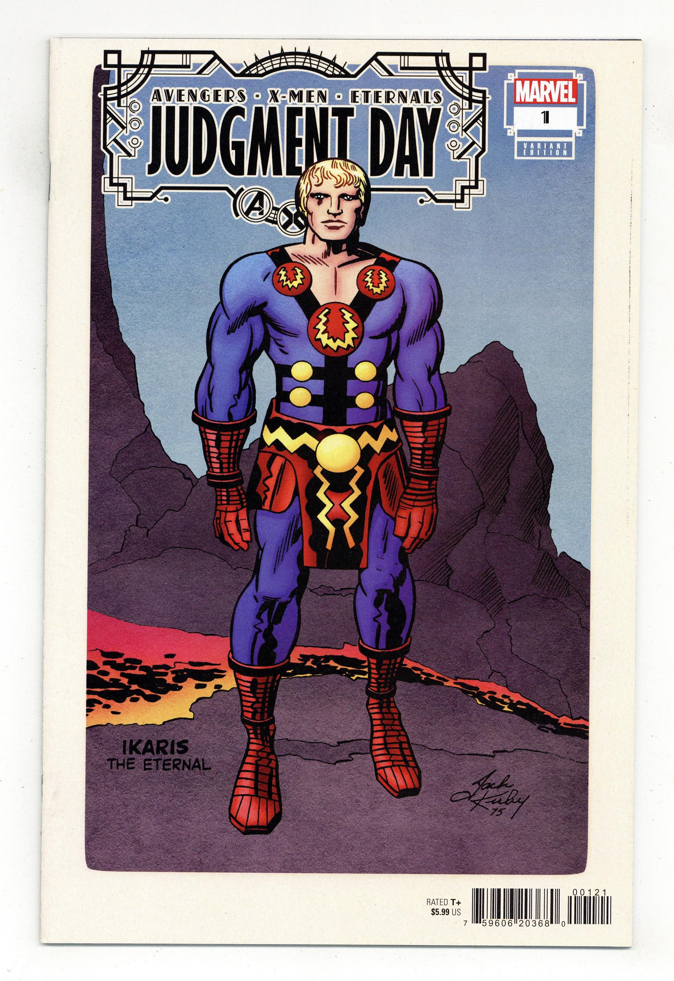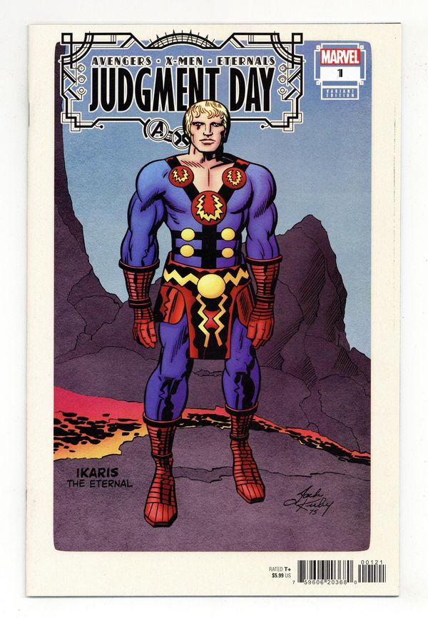 Limited 1 for 50 Retailer Incentive Variant Cover. Written by Kieron Gillen. Art by Guiu Villanova. Cover by Jack Kirby. IN THE LAND OF THE RIGHTEOUS... The X-Men claim they're the planets' new gods. The Eternals know that position is already filled. The Avengers are about to realize exactly how many secrets their so-called friends have kept from them. Years of tension lead to a volcanic eruption as two worlds burn. Who has leaked the X-Men's secrets to their latest foes? Why is Tony Stark abducting an old friend? And who stands in judgment over the whole world? Judgment Day from Kieron Gillen and Valerio Schiti is the apocalyptic emotional event to define the summer. 32 pages, full color. Rated T+ Cover price $5.99.