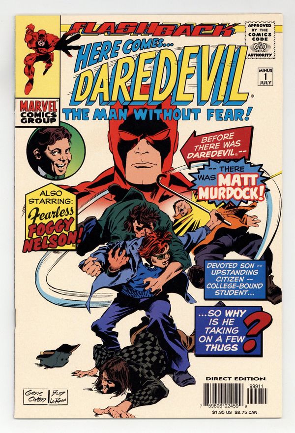 Flashback! In this previously untold tale, "Battlin'" Jack Murdock hangs up the boxing gloves to take his blind son Matt to the ivy-covered walls of academia! There he discovers something that he never expected! Written by Joe Kelly. Art by Gene Colan and Matt Ryan. Cover by Gene Colan and Bud LaRosa. Cover price $1.95.