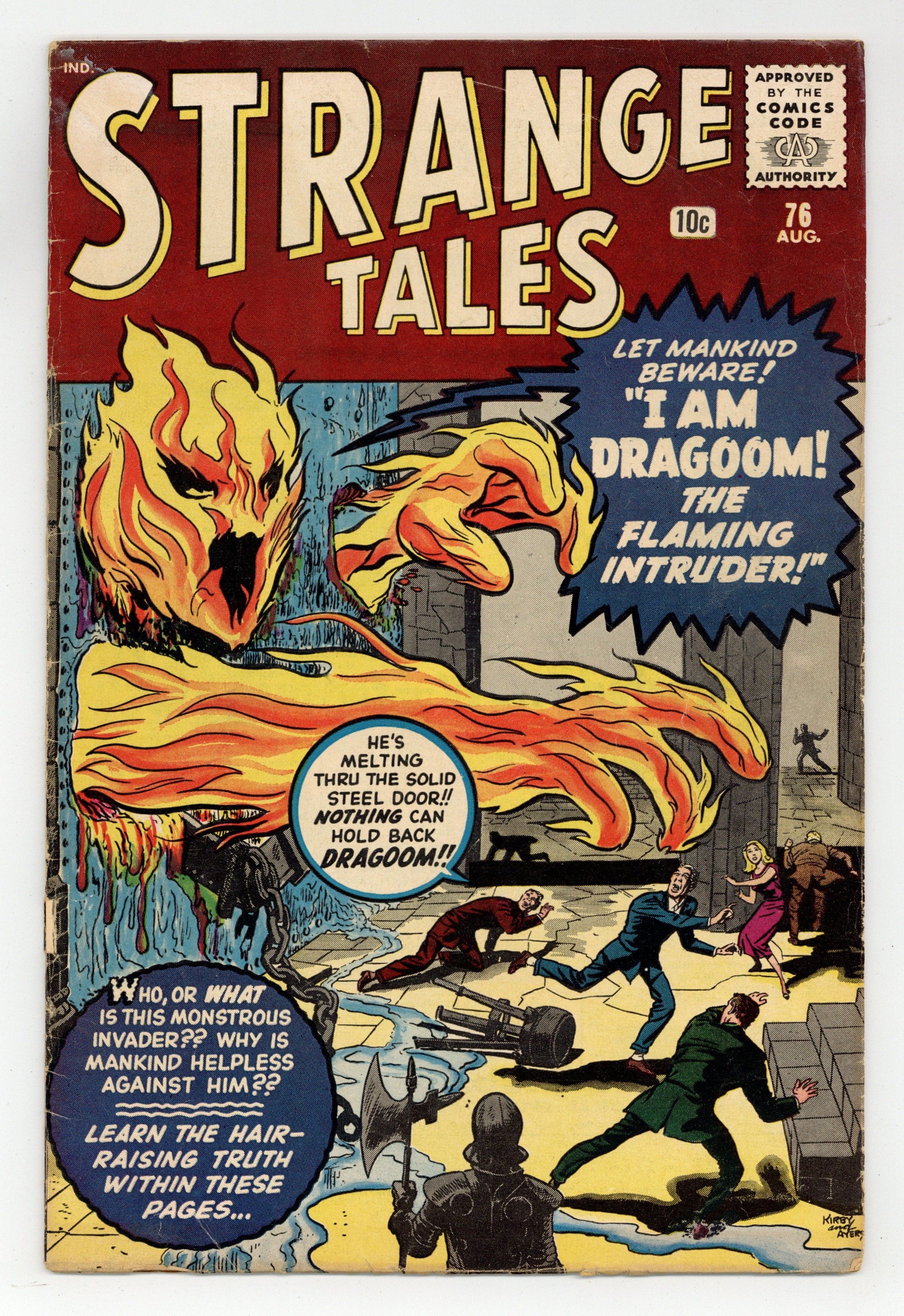 Prototype issue (Human Torch). Cover pencils by Jack Kirby, inks by Dick Ayers. "I Am Dragoom! The Flaming Invader!", pencils by Jack Kirby, inks by Dick Ayers; A flaming alien monster terrorizes Earth; A movie director fools him by using special effects to fake the arrival of police from Vulcan in pursuit of the monster, frightening him away. "The Pact" text story. "Beware!! The Ghosts Surround Me!!", art by Don Heck; A fugitive hides in an abandoned house, but aliens from another dimension appear to him; They cannot hurt him, but instead they phase him into an immaterial state and leave him there forever. "The Dummy and Me!", art by Paul Reinman; Some gangsters come for a ventriloquist who has unpaid gambling debts; They corner him in the alley and shoot him. "I Found the Mad Universe!", art by Steve Ditko; A scientist uses a powerful new microscope to discover an entire world existing at the sub-atomic level; He is horrified to find that this world, Earth, is just as barbaric and violent as his own. 36 pgs., full color. Cover price $0.10.