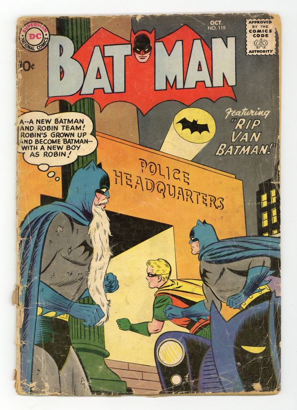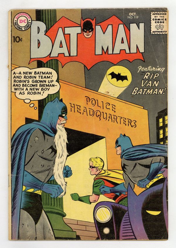 Cover pencils by Curt Swan, inks by Stan Kaye. "The Arch-Rivals of Gotham City," pencils by Sheldon Moldoff, inks by Stan Kaye; The "Woman of the Year" contest has two finalists: Vicki and Batwoman, and the judges decide to give both ladies a chance to prove their abilities before they select a winner...a winner who gets a date with the Batman! Lost -- A Free Education public service announcement with Binky, art by Bob Oksner. "The Secret of Batman Island," script by Bill Finger, pencils by Sheldon Moldoff (as Bob Kane), inks by Charles Paris; The founder/owner of Batman Island is followed home by criminals seeking films the man has been shooting that could finger them for a crime they committed. Half-page "Humorous Sheriff!" story. One-page Jail Jests story by Henry Boltinoff. "Fatal Incident" text story. "Rip Van Batman," script by Bill Finger, pencils by Sheldon Moldoff (as Bob Kane), inks by Charles Paris; Looking for criminal Al Hackett, Batman enters a greenhouse with exotic flowers and accidently trips over a vine, smashing into a case with a flower that gives off a strange vapor, and he passes out. One-page Casey the Cop story by Henry Boltinoff. 36 Pages, Full Color. Cover price $0.10.