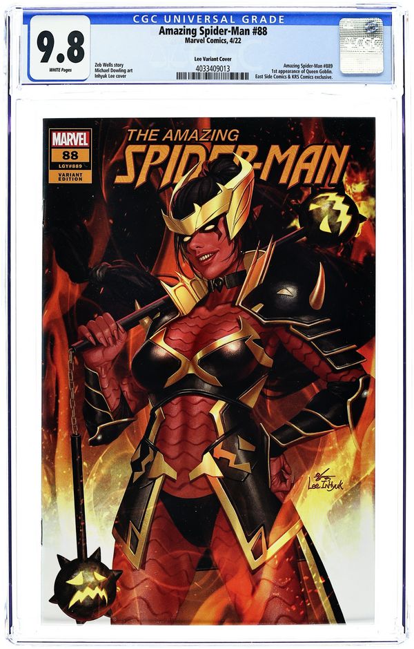 East Side Comics and KRS Comics exclusive cover by InHyuk Lee. Written by Zeb Wells. Art by Michael Dowling. Who is QUEEN GOBLIN?! For almost sixty years, Spider-Man has been defined by Goblins, and Ben Reilly has a brand-new one all his own. 28 pages, full color. Rated T