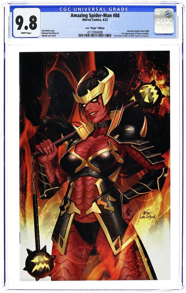 East Side Comics and KRS Comics exclusive virgin cover by InHyuk Lee. Written by Zeb Wells. Art by Michael Dowling. Who is QUEEN GOBLIN?! For almost sixty years, Spider-Man has been defined by Goblins, and Ben Reilly has a brand-new one all his own. 28 pages, full color. Rated T