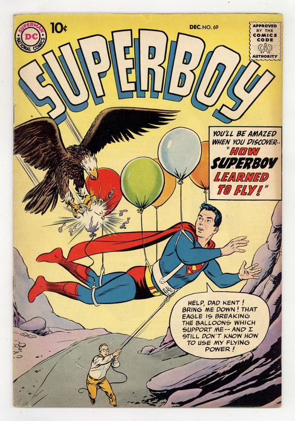 Tags: Superman$30.00Cover pencils by Curt Swan, inks by Stan Kaye. How Superboy Learned to Fly, script by Otto Binder, art by John Sikela; Flashback to early in his career when Superboy couldn't steer. The Racer in the Leaden Mask!, script by Otto Binder, art by George Papp; A scientist invents a super motor that enables him to win races on land, sea and air. Shorty humor page by Henry Boltinoff. The Indestructible Robot, art by George Papp; When criminals develop a kryptonite flame thrower only Superboy's robots can stop them, but he only has one in working order, and it is slowly destroyed by the gangs super weapons. 36 Pages, Full Color. Cover price $0.10.