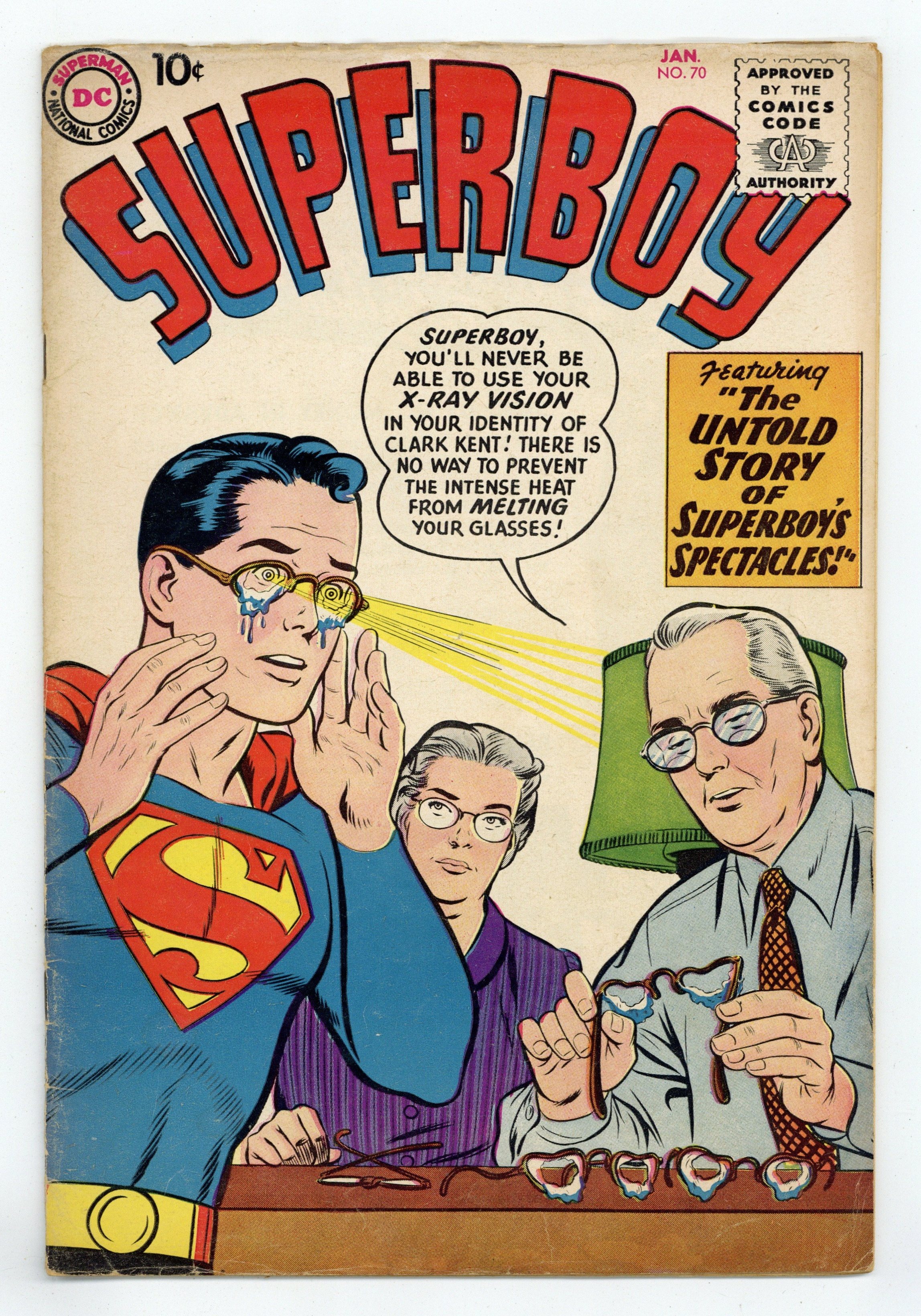 Cover pencils by Curt Swan, inks by Stan Kaye. The Super-Brat, script by Otto Binder, art by George Papp; Clark has to baby sit for a child with super-powers! Superboy's Nightmare Dream House, art by John Sikela. Tricksy humor page by Henry Boltinoff. The Secret of Superboy's Spectacles, script by Otto Binder, art by John Sikela; Flashback to early in Superboy's career before he learned how to make his glasses impervious to heat vision (called X-Ray vision in this story). 36 Pages, Full Color. Cover price $0.10.