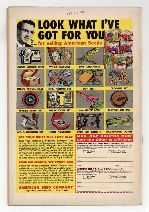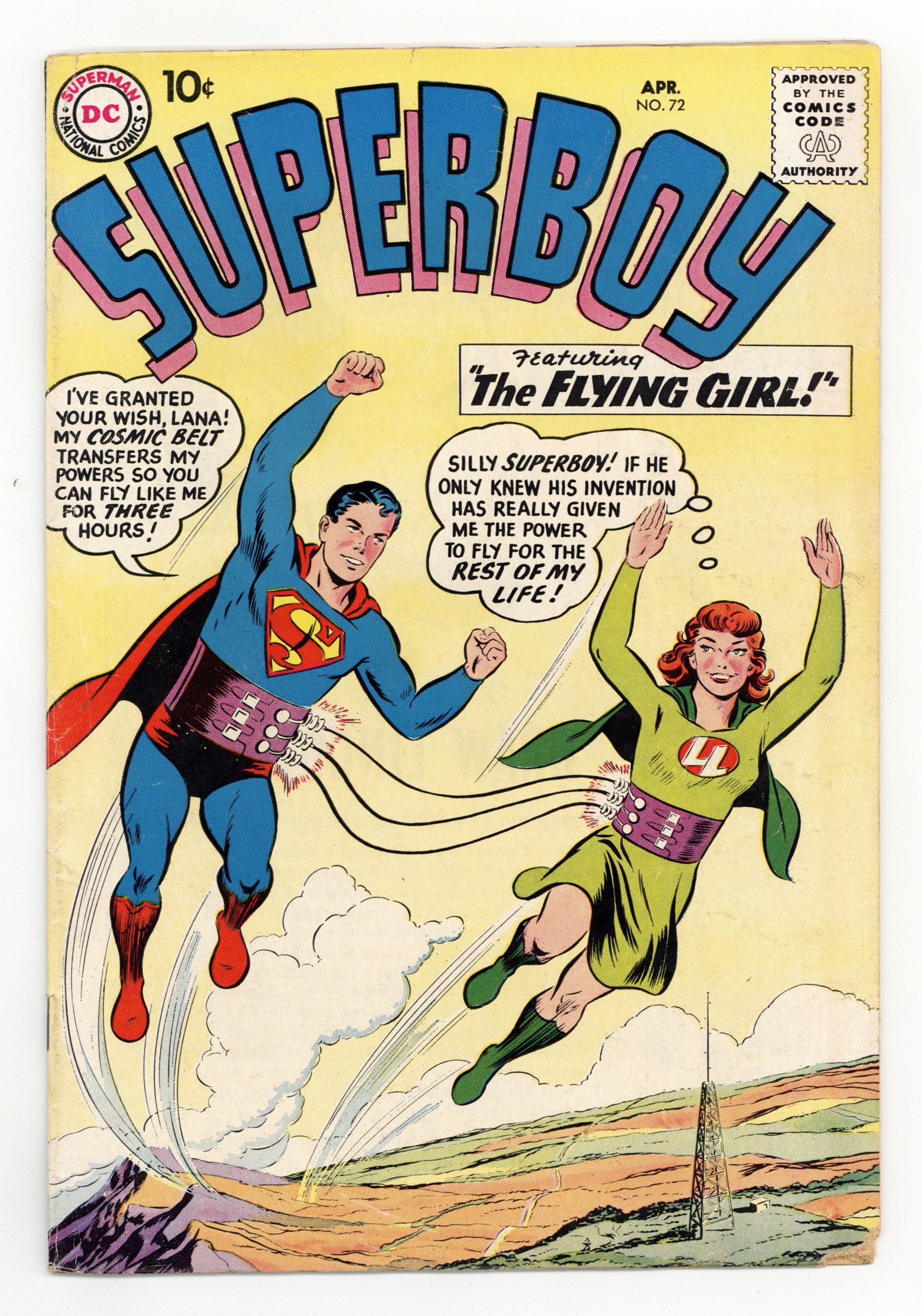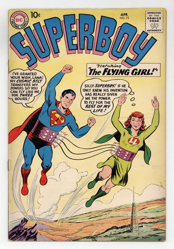 Cover pencils by Curt Swan, inks by Stan Kaye. Rebello, the Human Robot!, script by Otto Binder, art by John Sikela; Superboy builds his first robot capable of independent thought and it rebels against him. The Brave and the Bold #23 ad. What's Your B. Q.*? (*Brotherhood Quotient) public service announcement, script by Jack Schiff, art by Bernard Baily. The Day Superboy Was a Coward, script by Otto Binder, art by George Papp; Superboy loses all confidence after he apparently kills an escaping criminal. Varsity Vic humor page by Henry Boltinoff. The Flying Girl of Smallville!, script by Jerry Coleman, art by Creig Flessel; Lana Lang tricks Superboy into giving her the power to fly and, if they stay together for a continuous three hours, Lana will gain the power permanently. 36 Pages, Full Color. Cover price $0.10.