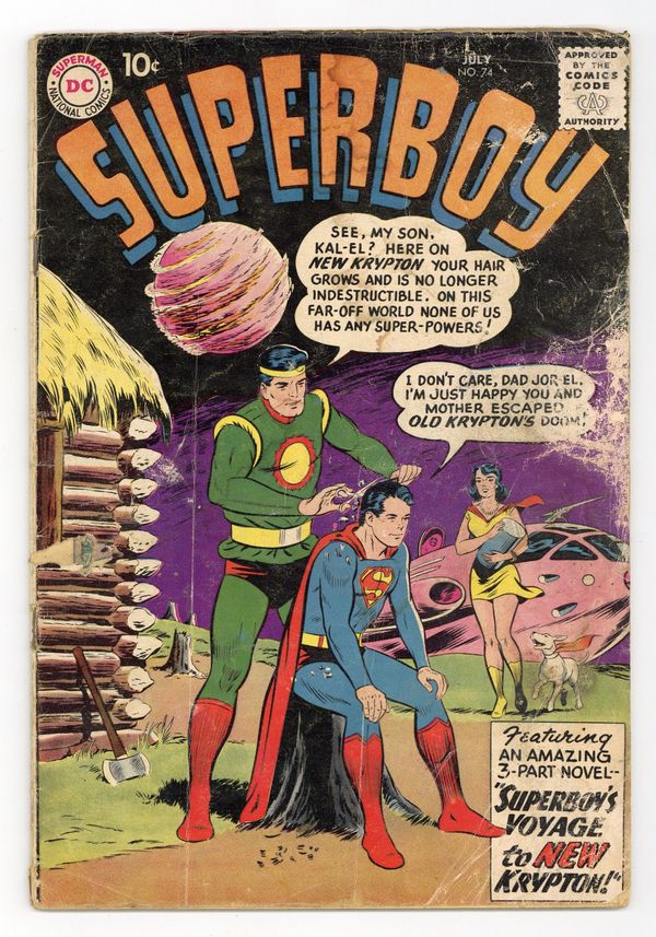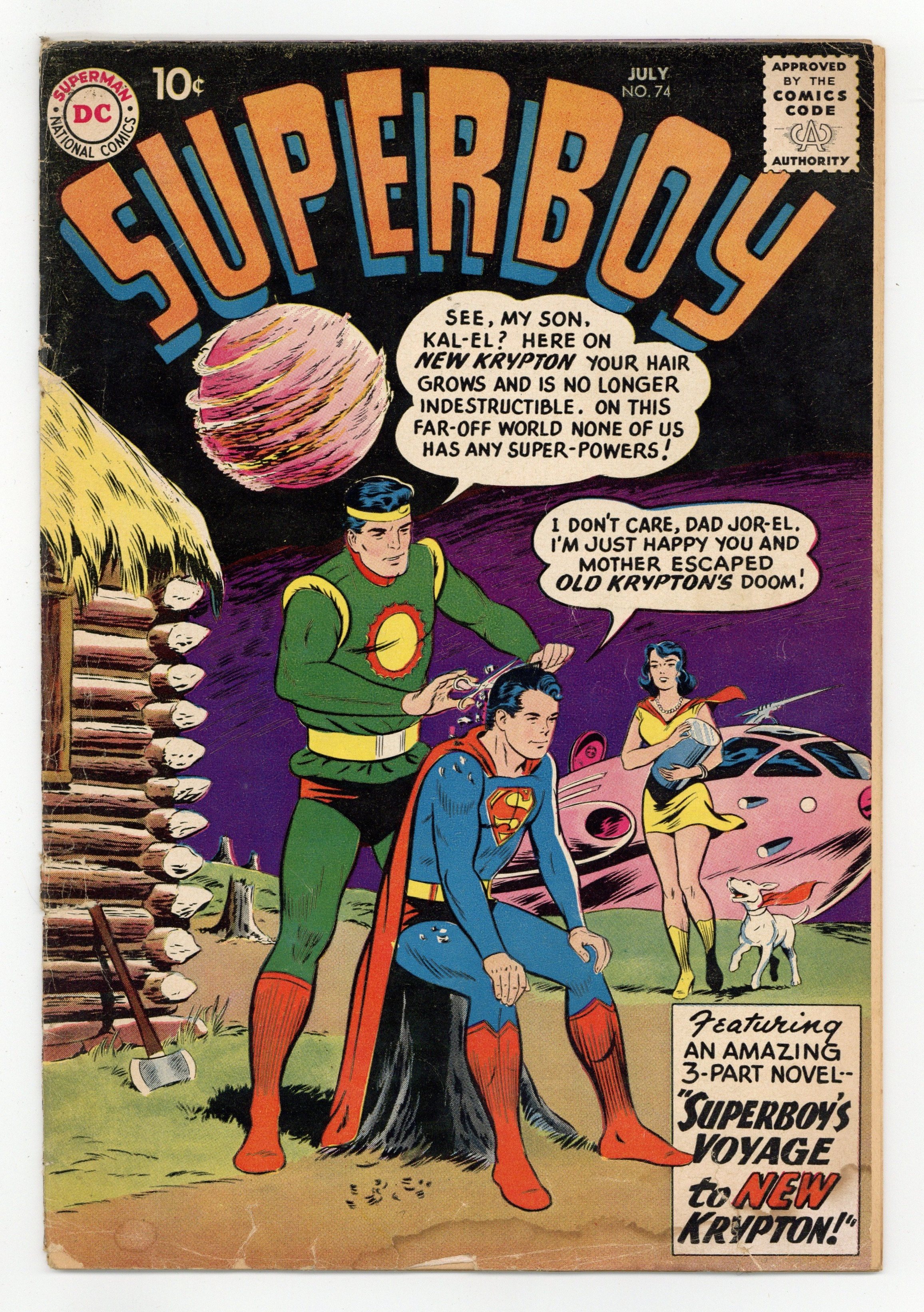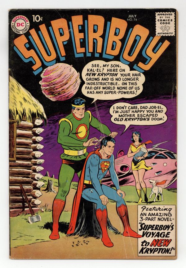 Cover pencils by Curt Swan, inks by Stan Kaye. Be Sure of Your Facts! public service announcement starring Buzzy, script by Jack Schiff, art by Win Mortimer. Superboy's Voyage to New Krypton, Part 1: The Return of Jor-El and Lara, script by Otto Binder, art by John Sikela; When a space creature breathes red kryptonite flame on Superboy, he falls sick; Surprisingly, Jor-El and Lara show up and nurse him back to health. Tricksy humor page by Henry Boltinoff. Superboy's Voyage to New Krypton, Part 2: The Voyage to New Krypton, script by Otto Binder, art by John Sikela; The Super-family makes plans to leave Earth in search of a new home. Superboy's Voyage to New Krypton, Part 3: The Orphan of Steel!, script by Otto Binder, art by John Sikela; New Krypton is imperiled by a falling moon. 36 Pages, Full Color. Cover price $0.10.