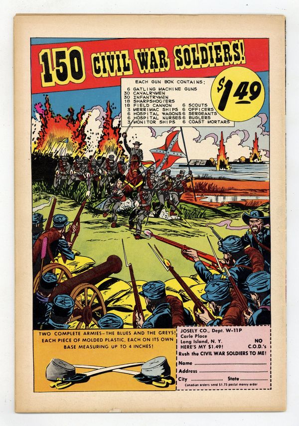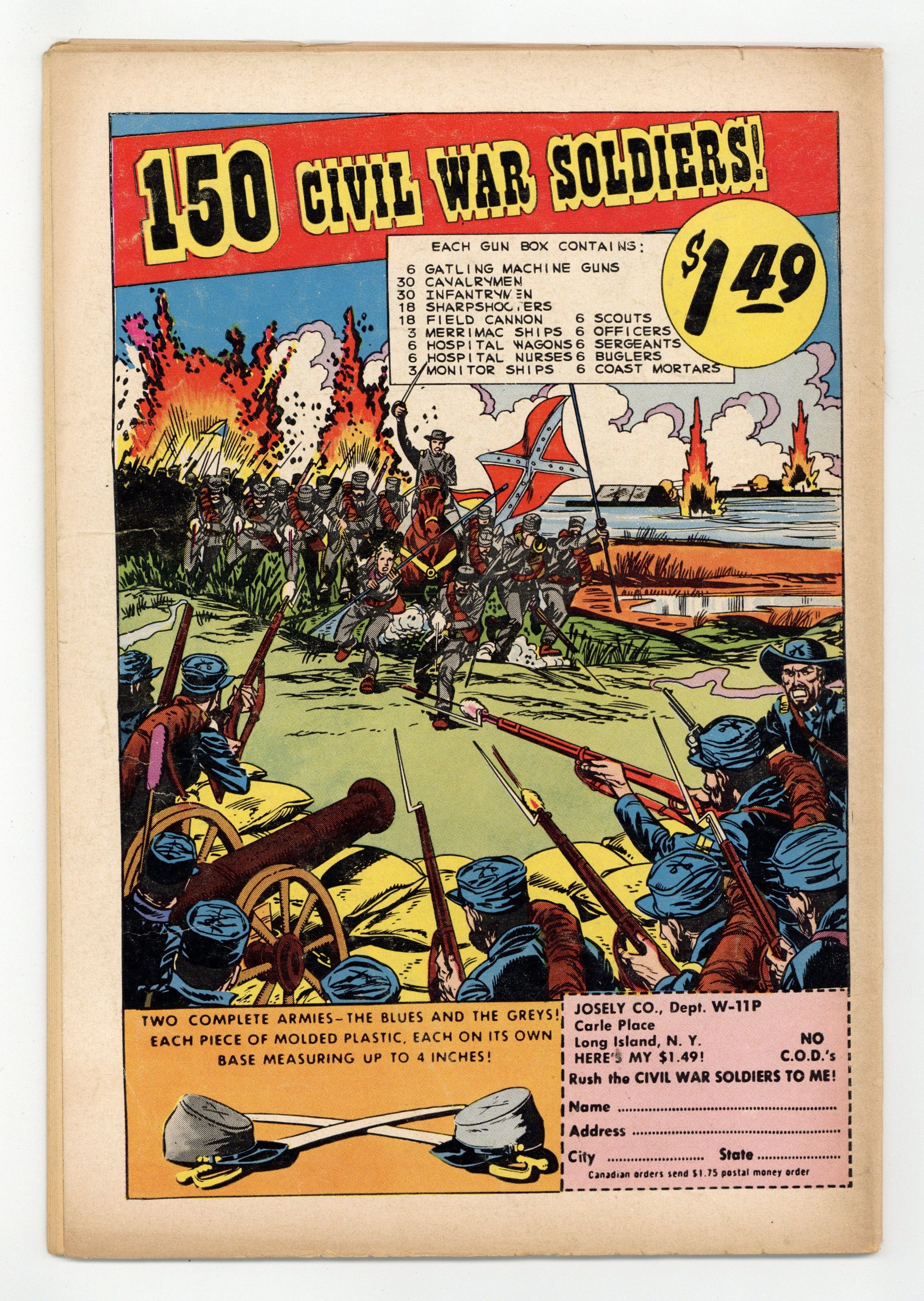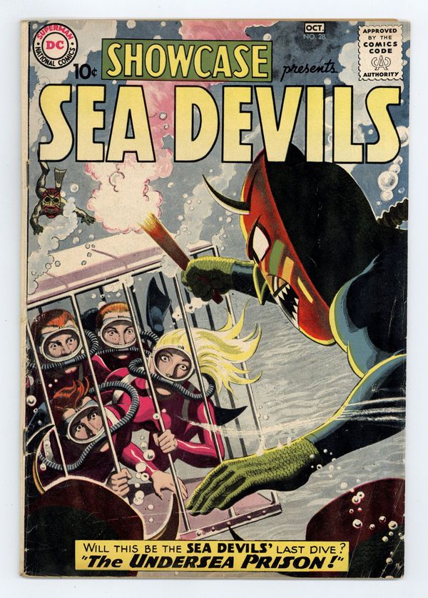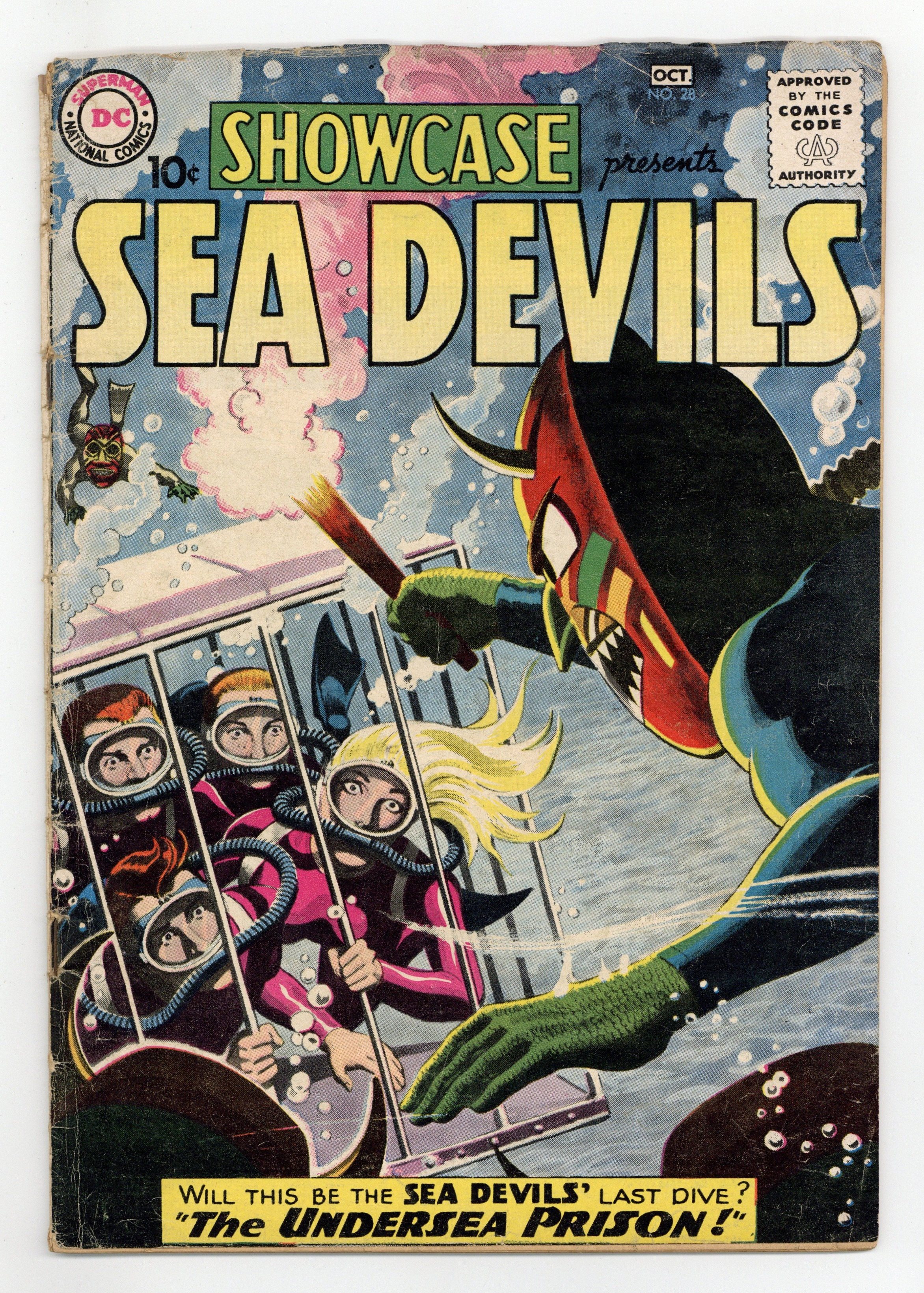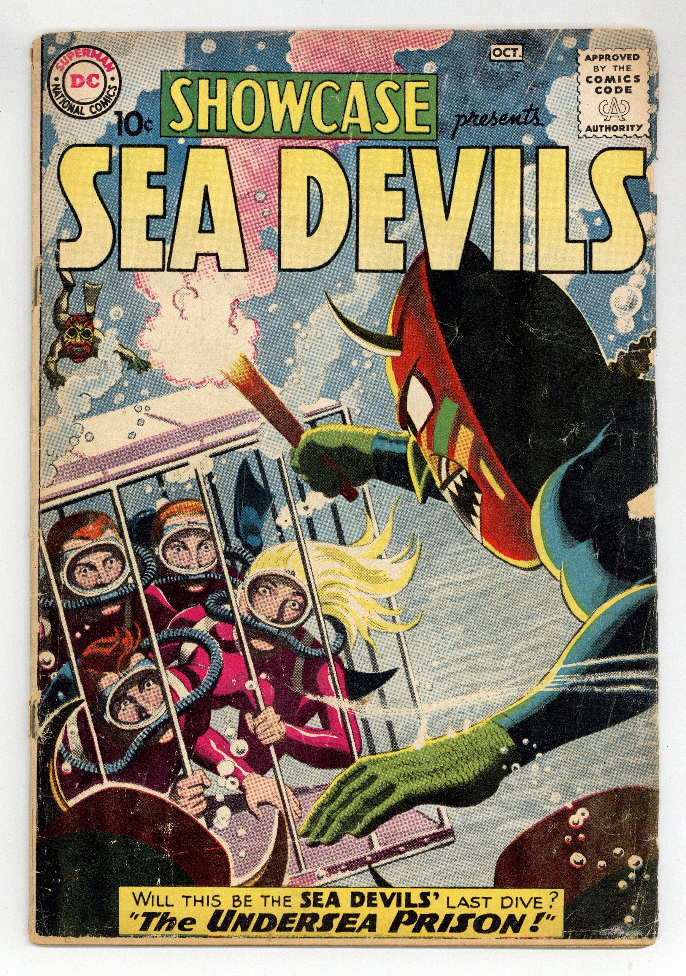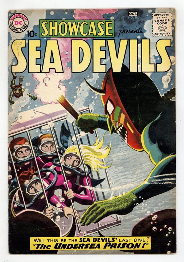Cover art by Russ Heath. 2nd appearance of Sea Devils in The Prize Flippers!, art by Russ Heath; The Sea Devils compete with each other to win the flippers that belong to Dane's father; Everyone knows how badly Nicky wants them, so they each disparage their own efforts in the competition. The First Frogman, script by Robert Kanigher, pencils by Ross Andru, inks by Mike Esposito; Scyllis, a Greek diver in the fifth century B.C., performs great underwater feats. Undersea Prison!, art by Russ Heath; The Sea Devils agree to help Mona Moray locate her missing father. 36 Pages, Full Color. Cover price $0.10.