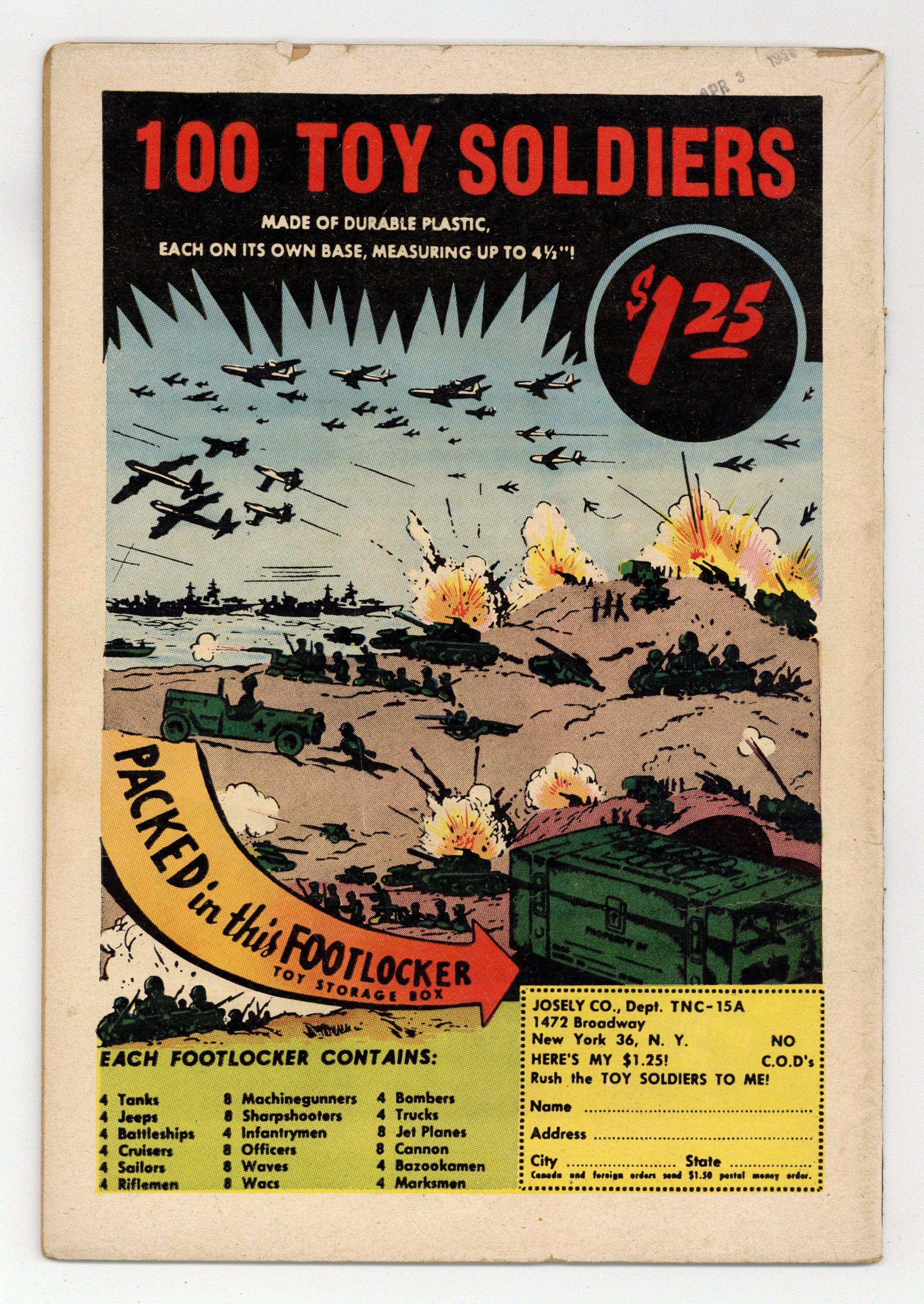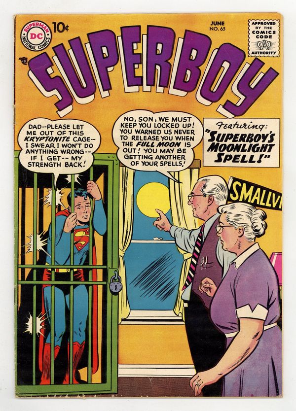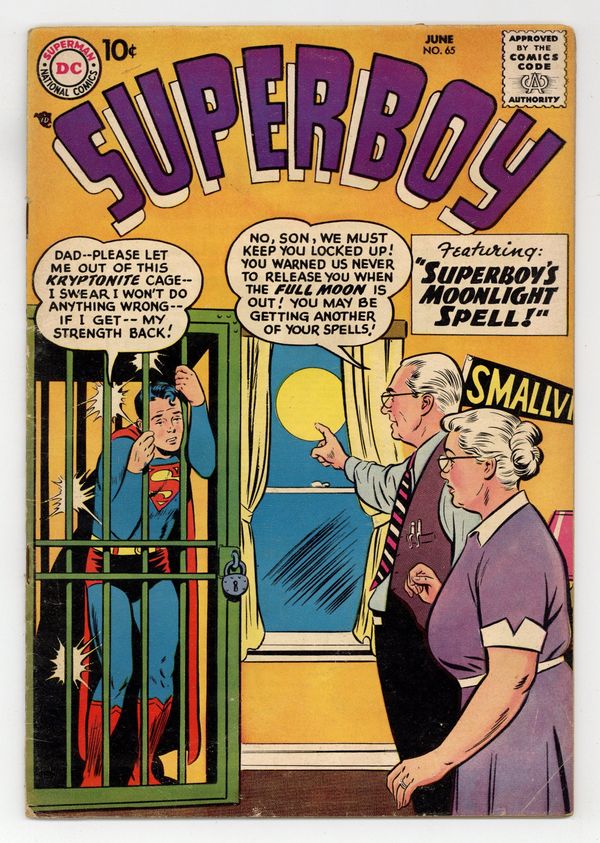 Cover pencils by Curt Swan, inks by Stan Kaye. "The Super-Weakling from Space" starring Superboy, Dworn, Martha Kent, Jonathan Kent, and Lana Lang, script by Jerry Coleman, art by George Papp; A young alien named Dworn arrives on Earth and befriends Clark Kent; Clark soon discovers that Dworn has the ability to turn other objects into solid gold. Sgt. Bilko's Pvt. Doberman ad. Ollie humor page by Henry Boltinoff. "Superboy's Moonlight Spell" starring Superboy and Jonathan and Martha Kent, art by Al Plastino; Superboy continues to experiment in his junior lab in the hopes of finding a cure for Kryptonite poisoning; His experiment malfunctions however and a mysterious gas blankets Superboy. Flashlight Projector - Superboy's Workshop activity page. "The Amazing Adventures of Krypto Mouse," script by Jerry Coleman, art by John Sikela; Tommy Ewell's parents force him to get rid of all of his pets, including his beloved mouse, Fuzzy; He releases Fuzzy into a field, where the mouse proceeds to scamper about until it finds the laboratory of Professor Egglehead; Fuzzy interrupts the path of Professor Egglehead's Atomic Krypton Ray, and the resulting exposure transforms him into a large bipedal mouse with all of the powers of Superboy. Nature's Prize Pupil! public service announcement, script by Jack Schiff, art by Bob Brown. 36 Pages, Full Color. Cover price $0.10.