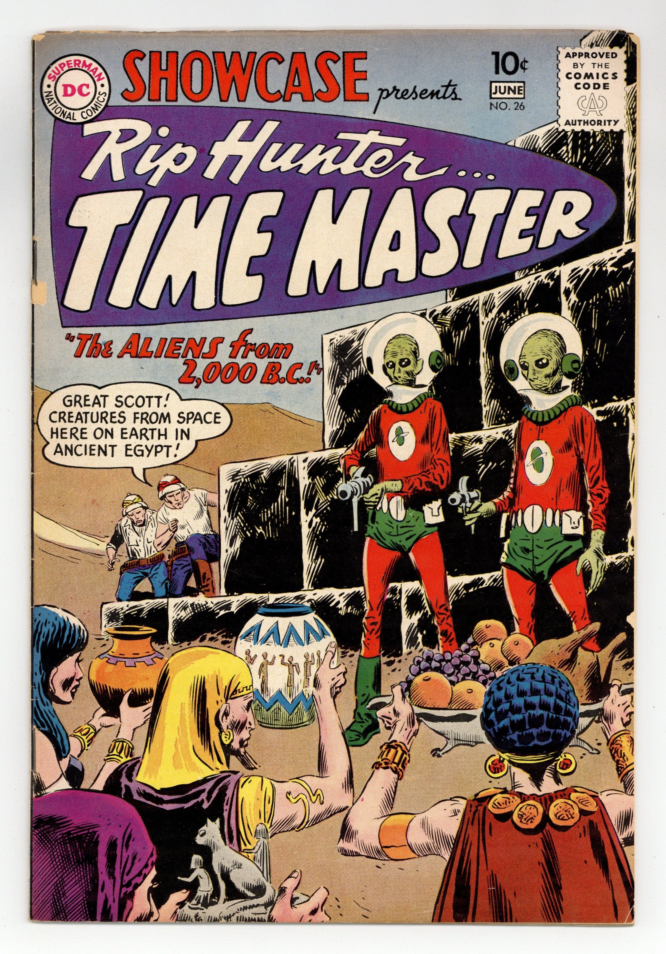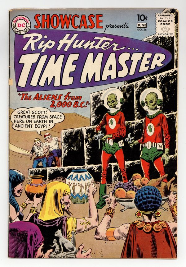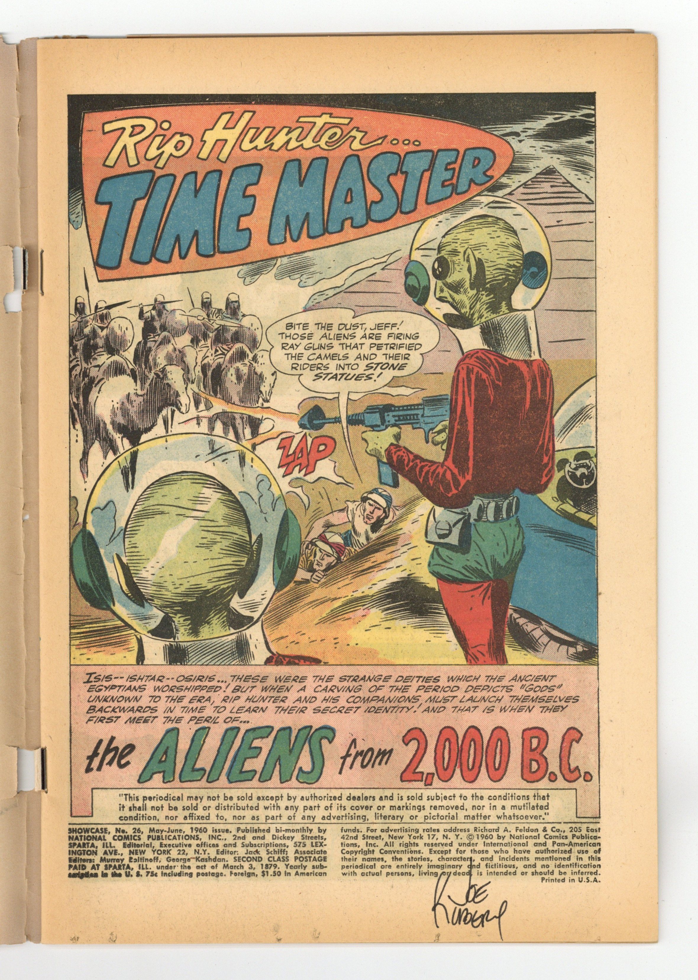 Cover by Joe Kubert. "The Aliens from 2,000 B.C.", script by Jack Miller, art by Joe Kubert; An egyptology professor asks for Rip's help in solving mysterious hieroglyphs showing the ancient Egyptians worshipping unknown gods; With his fellow time masters tagging along, Rip takes the Time Sphere into the year 2000 B.C., landing in the ancient Egypt village of El Karnak., where two alien beings from another world have been portraying themselves as gods and demanding tribute from the poor villagers; Following the extraterrestrials to their island hideout, Rip finds that they are preparing for a global takeover using robot soldiers manufactured from a machine; He and Jeff destroy the robot-maker and rush back to the village to try and warn the people about the aliens and their remaining robots; The villagers at first don't believe them, but then a brilliant flash of light occurs and two more alien visitors appear; They explain that they are the law enforcement of their world, and that they came to recapture the two escaped criminals that made their way to Earth; It's at that time when the robots come into view! Continued in Rip Hunter, Time Master #1. Professor Eureka half-page by Henry Boltinoff. 36 Pages, Full Color. Cover price $0.10.