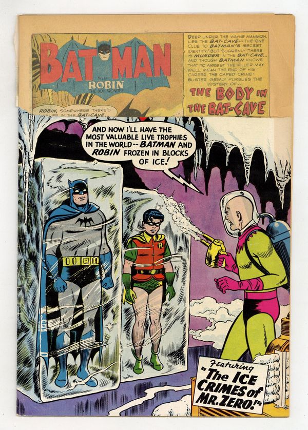 1st appearance of Mr. Freeze in "The Ice Crimes of Mr. Zero." Cover pencils by Curt Swan, inks by Stan Kaye. The Magic Card! public service announcement, script by Jack Schiff, art by Bernard Baily. "The Body in the Bat-Cave," script by Bill Finger, pencils by Sheldon Moldoff, inks by Charles Paris; As Bruce and Dick head for the Bat-Cave to change to their other identities, they discover the dead body of a man known for selling secrets to the underworld; Batman and Robin therefore must discover if this man sold the secret location of the Bat-Cave to underworld thugs. Two-page Warden Willis story by Henry Boltinoff. "Crime Rides the Rails," script by Bill Finger, pencils by Sheldon Moldoff, inks by Charles Paris; Criminals derail a circus train so that animals get loose and the Caped Crusaders have to deal with that problem while gang members attempt to free their boss from a prison train. "Homicide in Hollywood" text story. 2/3-page Shorty story by Henry Boltinoff. "The Ice Crimes of Mr. Zero," script by Dave Wood, pencils by Sheldon Moldoff, inks by Charles Paris; A scientist accidently falls victim to the effects of an experiment, making him a virtual "human icicle," a foe who puts the chill on Batman and Robin. "Mystery of the Golden Bean Bag!" one-page story, script by Julius Schwartz, pencils by Morris Waldinger, inks by Tommy Nicolosi. 36 Pages, Full Color. Cover price $0.10.