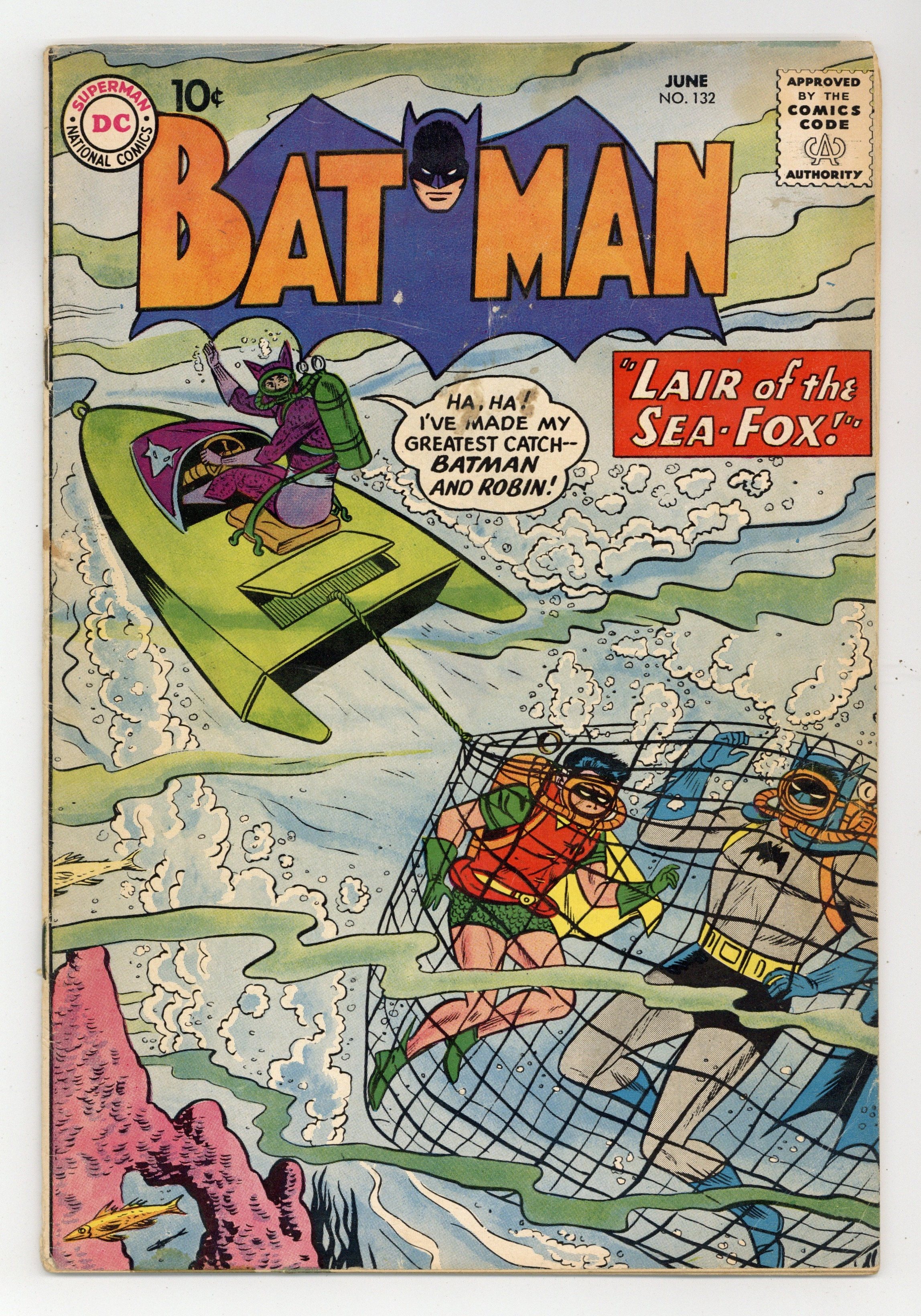 Cover by Sheldon Moldoff. "The Martian from Gotham City," script by Bill Finger, pencils by Sheldon Moldoff, inks by Charles Paris; An actor suffering amnesia believes that he is a Martian and at war with the world; When three criminals discover this, they trick the actor into helping them. One-page Warden Willis story by Henry Boltinoff. "The Three Faces of Batman," script by Bill Finger, art by Sheldon Moldoff; While trying to capture Big Jim Masters, Batman is subjected to an scientific experimental device that makes him unable to fight crime when he hears a siren or bell. One-page Casey the Cop story by Henry Boltinoff. "The Lair of the Sea-Fox," script by Bill Finger, art by Sheldon Moldoff; The Sea-Fox cleverly uses underwater waterways beneath Gotham to commit his crimes and the Caped Crusaders must find a way to stop him. 36 Pages, Full Color. Cover price $0.10.