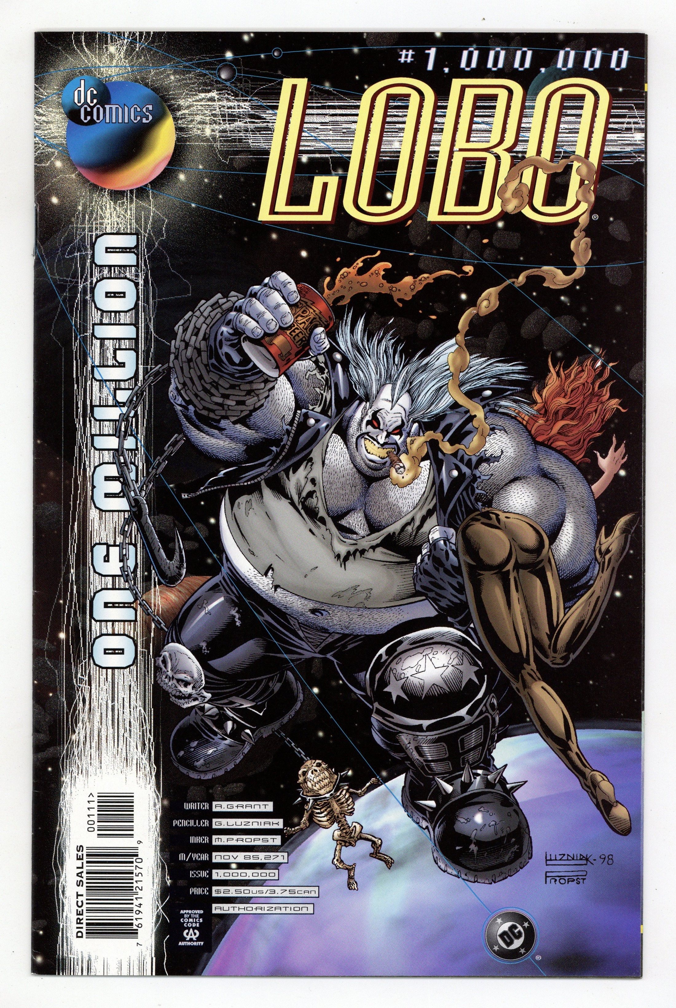 By all that is holy, what sort of insane mischief has the decrepit, disgusting monster known as Lobo been up to in the last couple of hundred centuries? It's worse than you may have imagined, as the Main Old Man, bloated and hateful, tries to adapt to the majestic world beyond tomorrow. It ain't gonna be pretty, that's for sure. Written by Alan Grant. Art and cover by Greg Luzniak and Mark Propst. FC, 32 pg. Mando Format. NOTE: The DC One Million series consists of 31 issues including a 4-issue mini-series and 27 individual one-shots. Cover price $2.50.