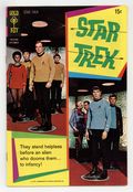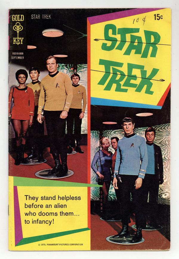 Comic book version of the original Star Trek TV series that starred William Shatner and Leonard Nimoy. Photo cover of cast members William Shatner (Kirk), Leonard Nimoy (Spock), DeForest Kelley (McCoy), James Doohan (Scotty), Majel Barrett (Chapel), Walter Koenig (Chekov), George Takei (Sulu) and Nichelle Nichols (Uhura). The Youth Trap, script by Dick Wood, art by Alberto Giolitti; the Enterprise crew stands helpless against an alien who dooms them to infancy. Gold Key Comics Club News. 36 pgs., full color. $0.15. Cover price $0.15.