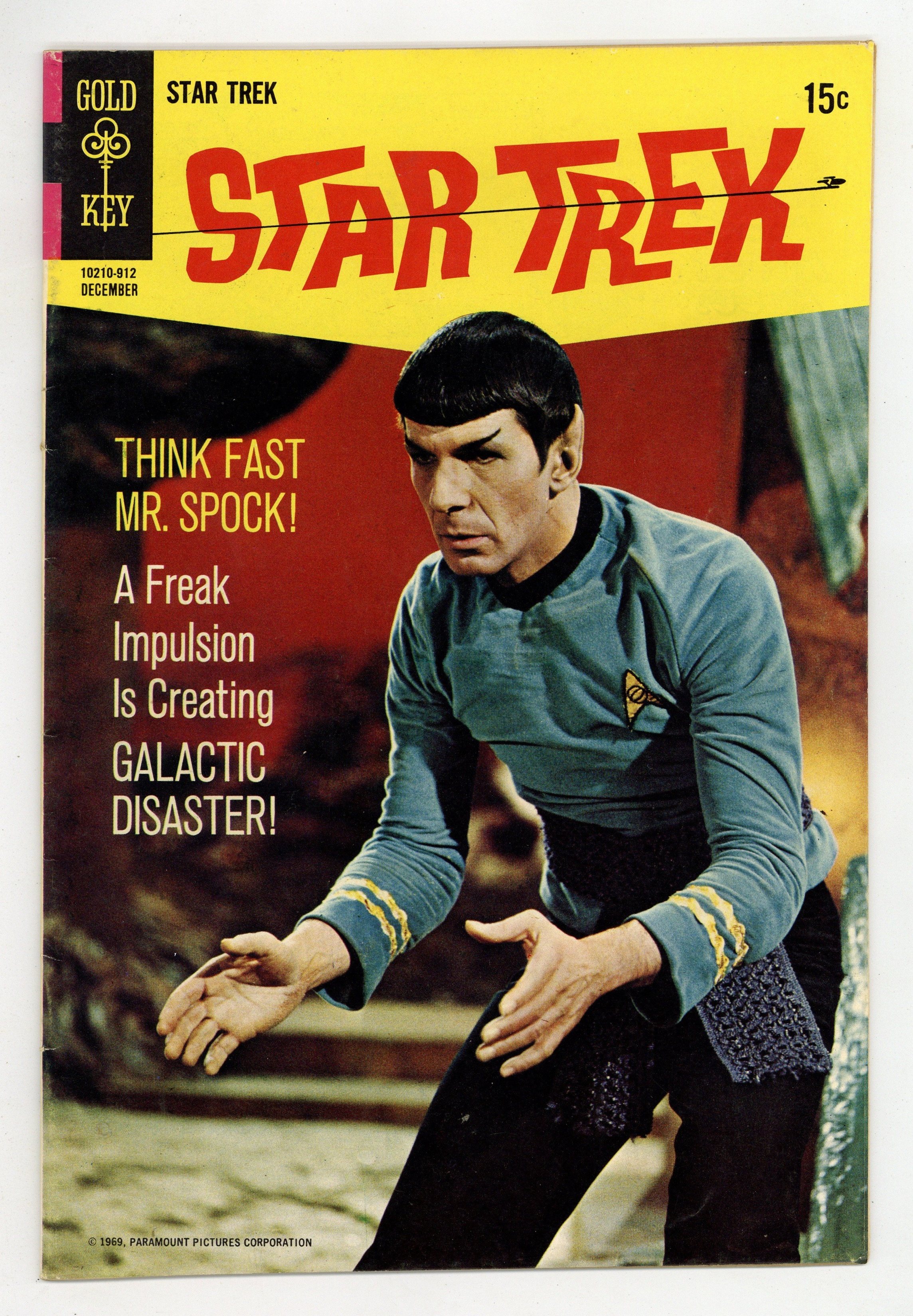 Comic book version of the original Star Trek TV series that starred William Shatner and Leonard Nimoy. 10210-912. Photo cover of Leonard Nimoy as Spock, from the TV episode Amok Time. "When Planets Collide," script by Dick Wood, art by Alberto Giolitti; Kirk and Spock are in a race against time to save two inhabited planets. 36 pgs., full color. $0.15. Cover price $0.15.