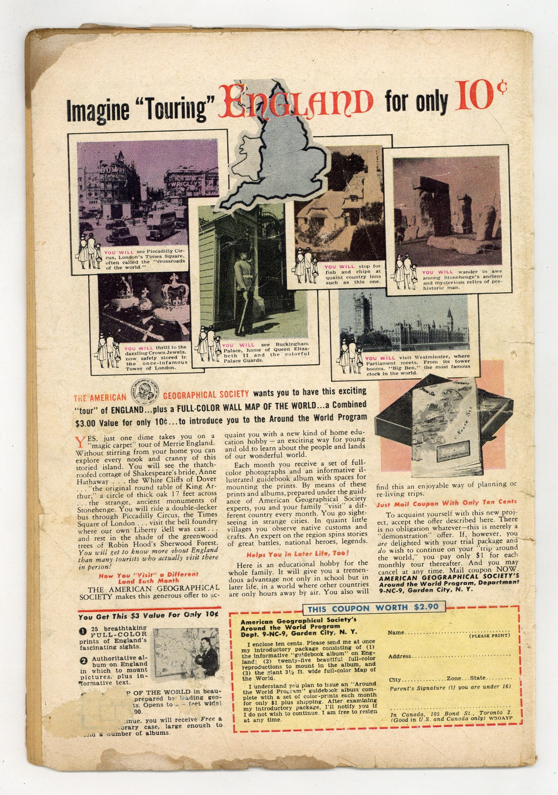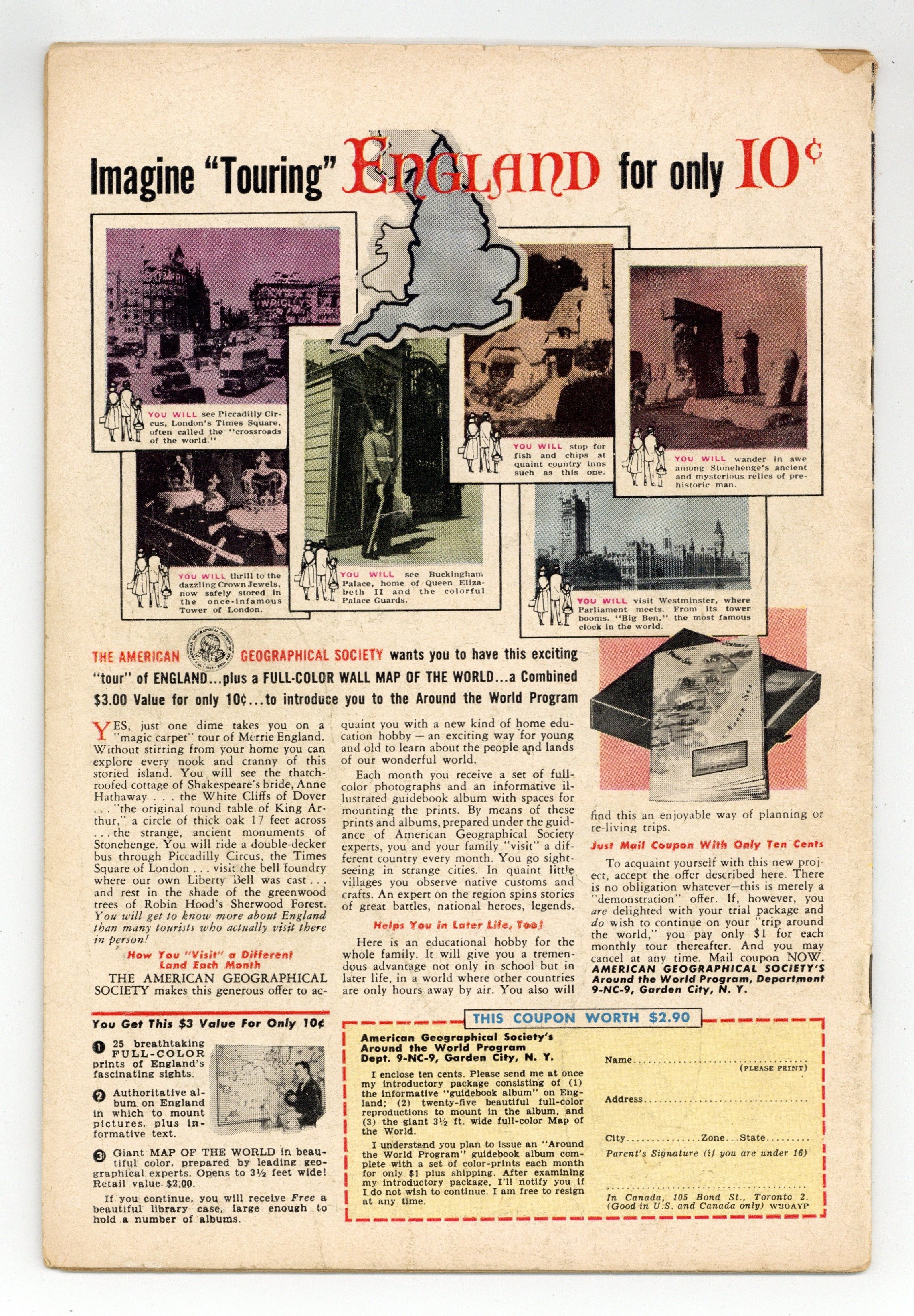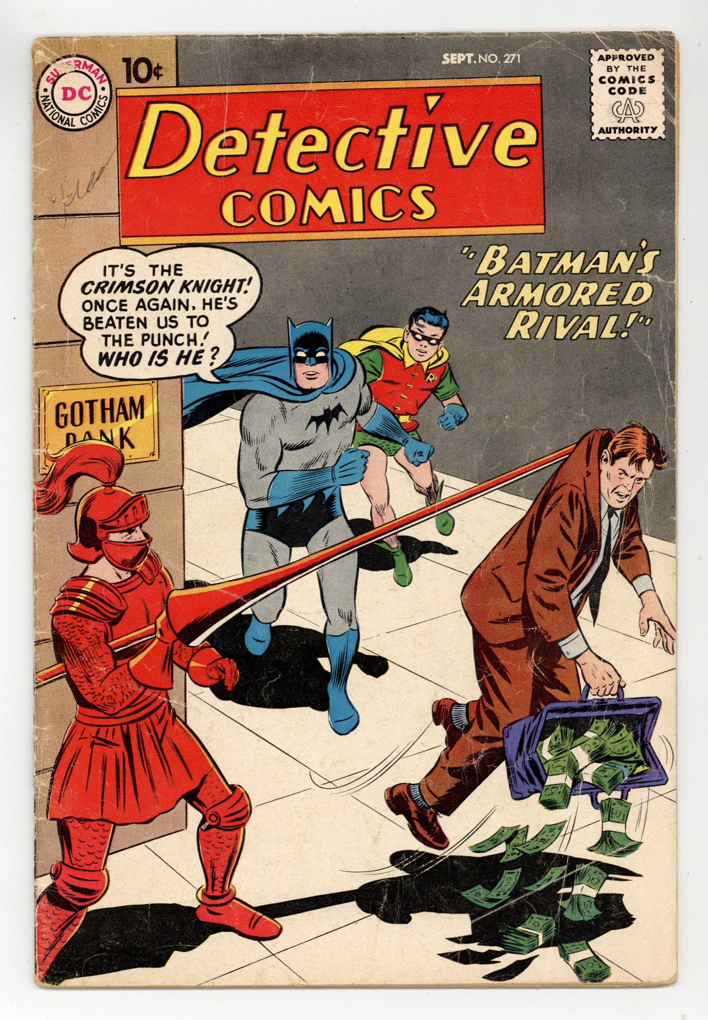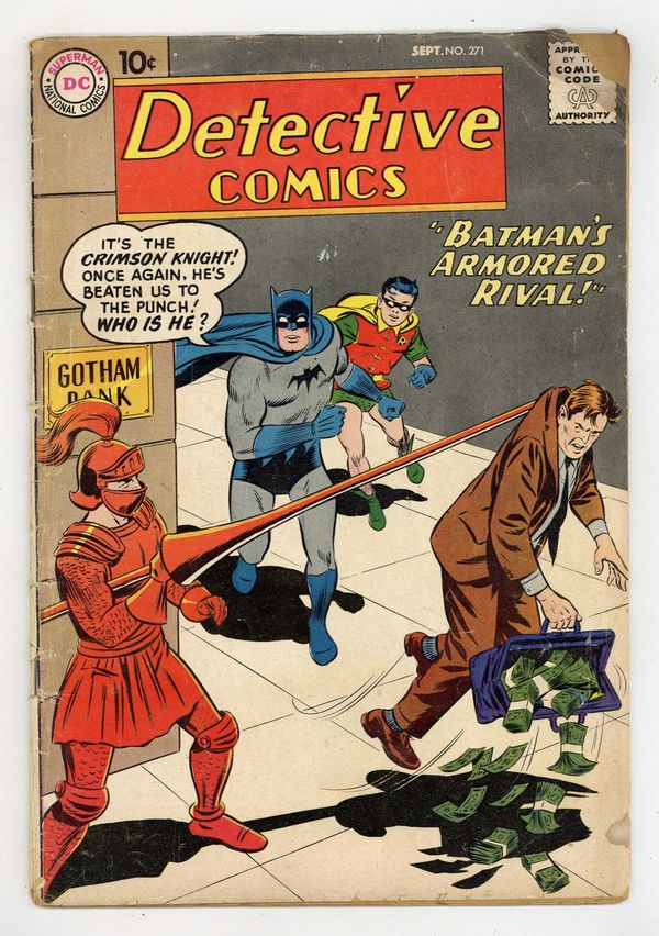 Cover pencils by Curt Swan, inks by Stan Kaye. "Batman's Armored Rival" starring Batman, Robin, and the Crimson Knight (intro), script by Dave Wood, art by Sheldon Moldoff; Batman and Robin are assisted by a new hero, the Crimson Knight; But whose side is the mystery man really on? Water: A Good Friend or a Deadly Enemy--Depending on You! public service announcement, script by Jack Schiff, art by Bernard Baily. "The Incredible Cave Creatures" starring Roy Raymond TV Detective, script by Jack Miller, art by Ruben Moreira. "The Lost Identity" starring John Jones Manhunter from Mars, script by Jack Miller, art by Joe Certa; Jones loses his ability to change to Earthman form; vs. Rocky Wheeler (intro, villain) and The Hanshaw Gang. 36 pgs., full color. Cover price $0.10.