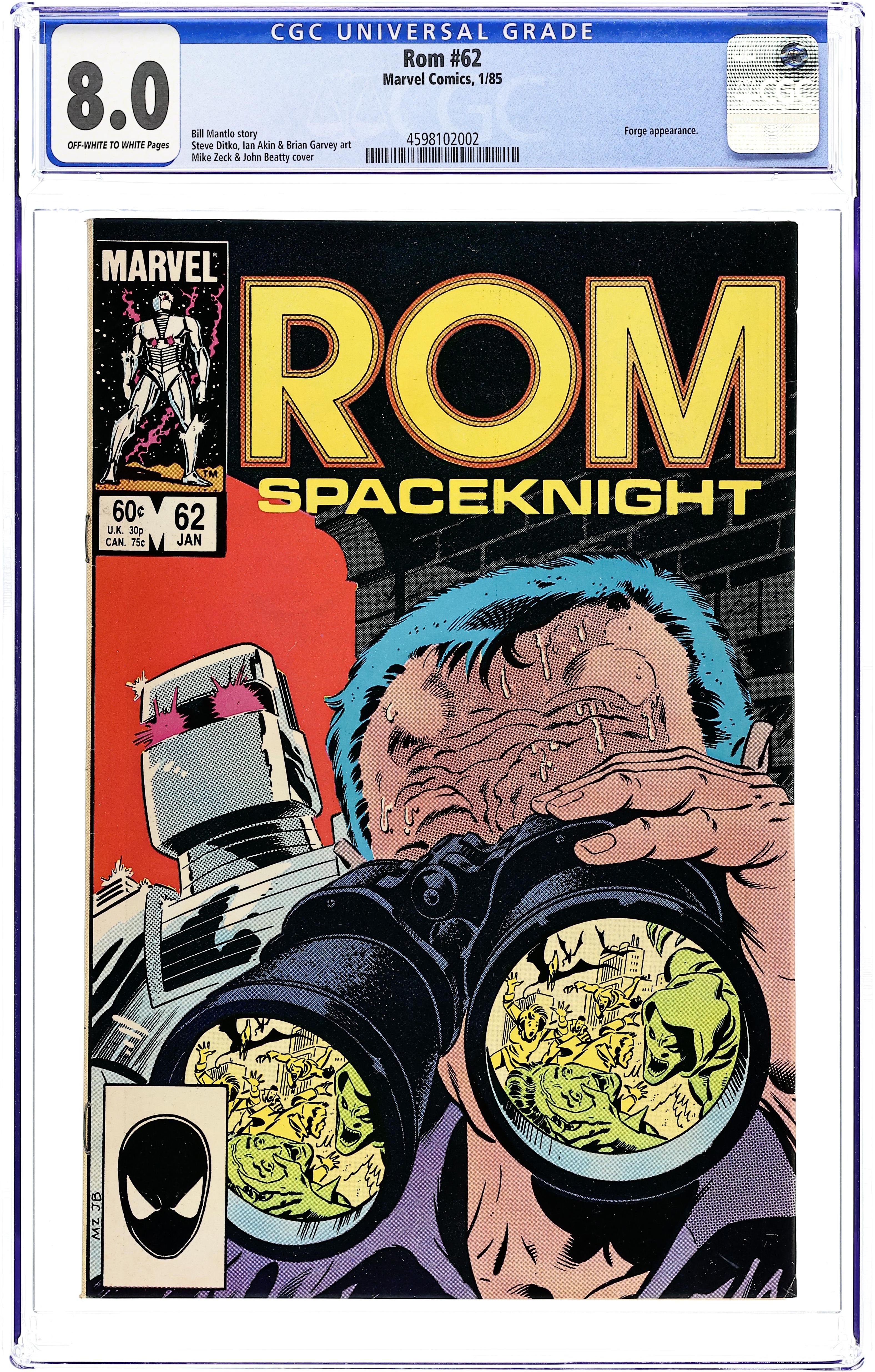 Guest-starring Forge. Story by Bill Mantlo. Art by Steve Ditko, Ian Akin, and Brian Garvey. Cover by Mike Zeck. As Forge remembers the attempt on his life by the alien Dire Wraiths (which took place in Uncanny X-Men (1963) #187-188), he struggles with the decision to help the very government that persecutes mutant-kind and would use his inventions to keep the super-hero community under its thumb. But after witnessing the true horror of the Dire Wraiths, Forge reassures Rom that he has a new and powerful ally. 32 pages.