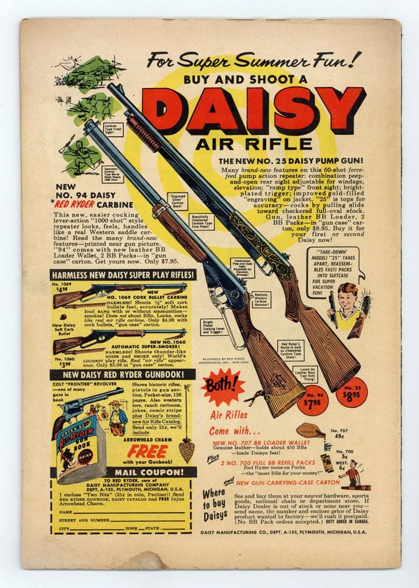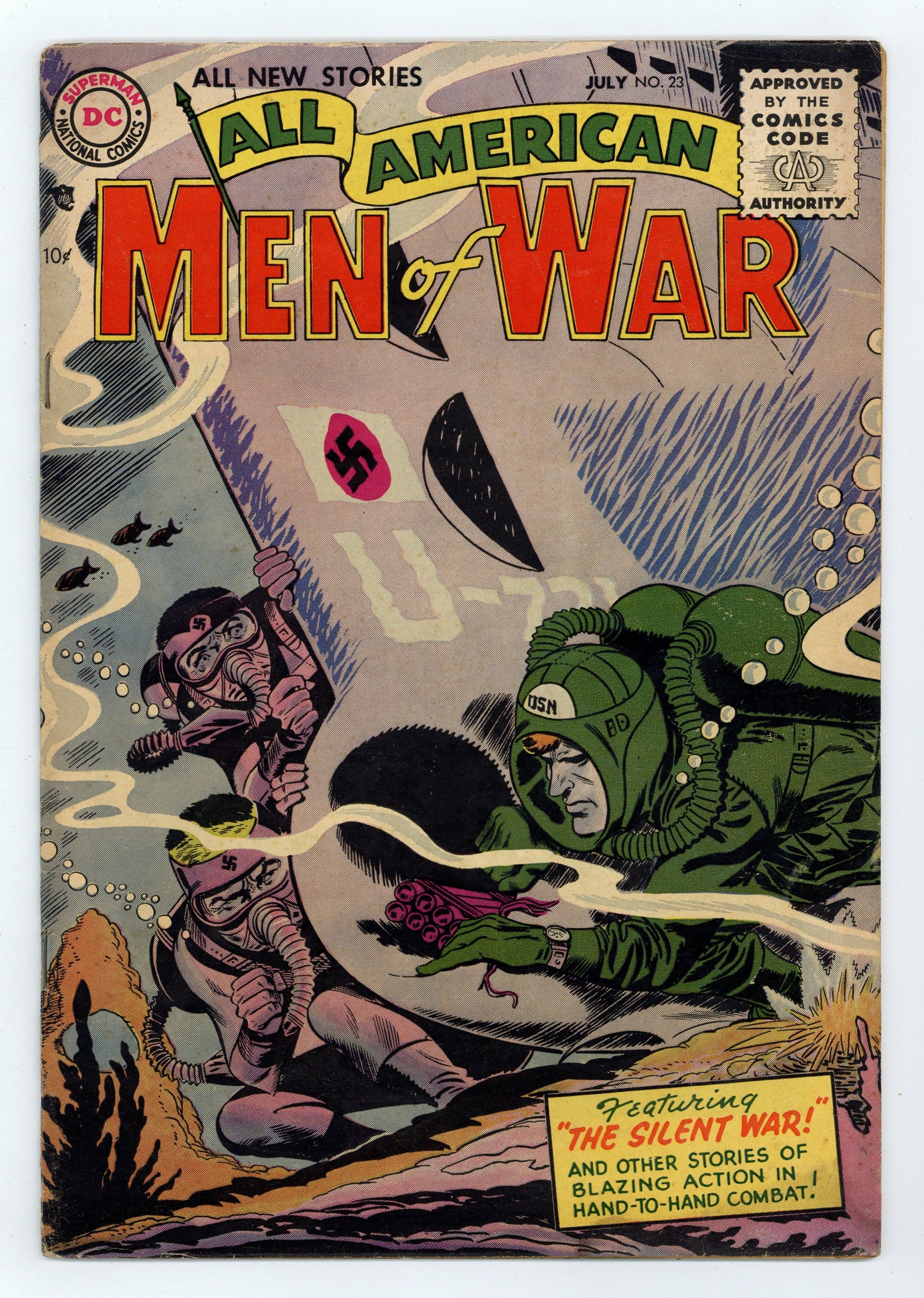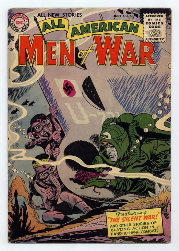 "The Silent War," "Search For a Hero," "Tumbling Soldier," and "Operation Survival!" (art by Carmine Infantino). Fearless Fosdick stars in a quarter-page Wildroot Cream-Oil ad by Al Capp. Edited by Whitney Ellsworth and Robert Kanigher. Cover by Jerry Grandenetti. Stories by Robert Kanigher, Ross Andru, Mike Esposito, Irwin Hasen, Bill Finger, Carmine Infantino, Bernard Sachs, Jack Miller, Joe Kubert, Ed Herron, and Irv Novick. Adventure tales of war and the military, including some humor—go into combat with All American Men of War! 36 Pages, Full Color. Cover price $0.10.