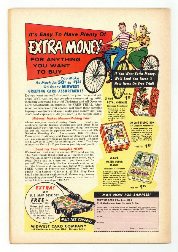 Tags: Superman$49.00Cover pencils by Curt Swan, inks by Stan Kaye. The Day Lois Lane Forgot Superman!, script by Robert Bernstein, art by Kurt Schaffenberger; Lois asks a hypnotist to make her forget Superman. House ad for Superman Annual #1. The Superman of the Past!, script by Otto Binder, art by Kurt Schaffenberger; Lois dreams she's in ancient times and meets Samson, who also has a secret identity. Mr. and Mrs. Clark (Superman) Kent!, script by Jerry Siegel, art by Kurt Schaffenberger; Lois marries Clark Kent and then gets depressed because she can't tell anybody she's really married to Superman. 36 Pages, Full Color. Cover price $0.10.