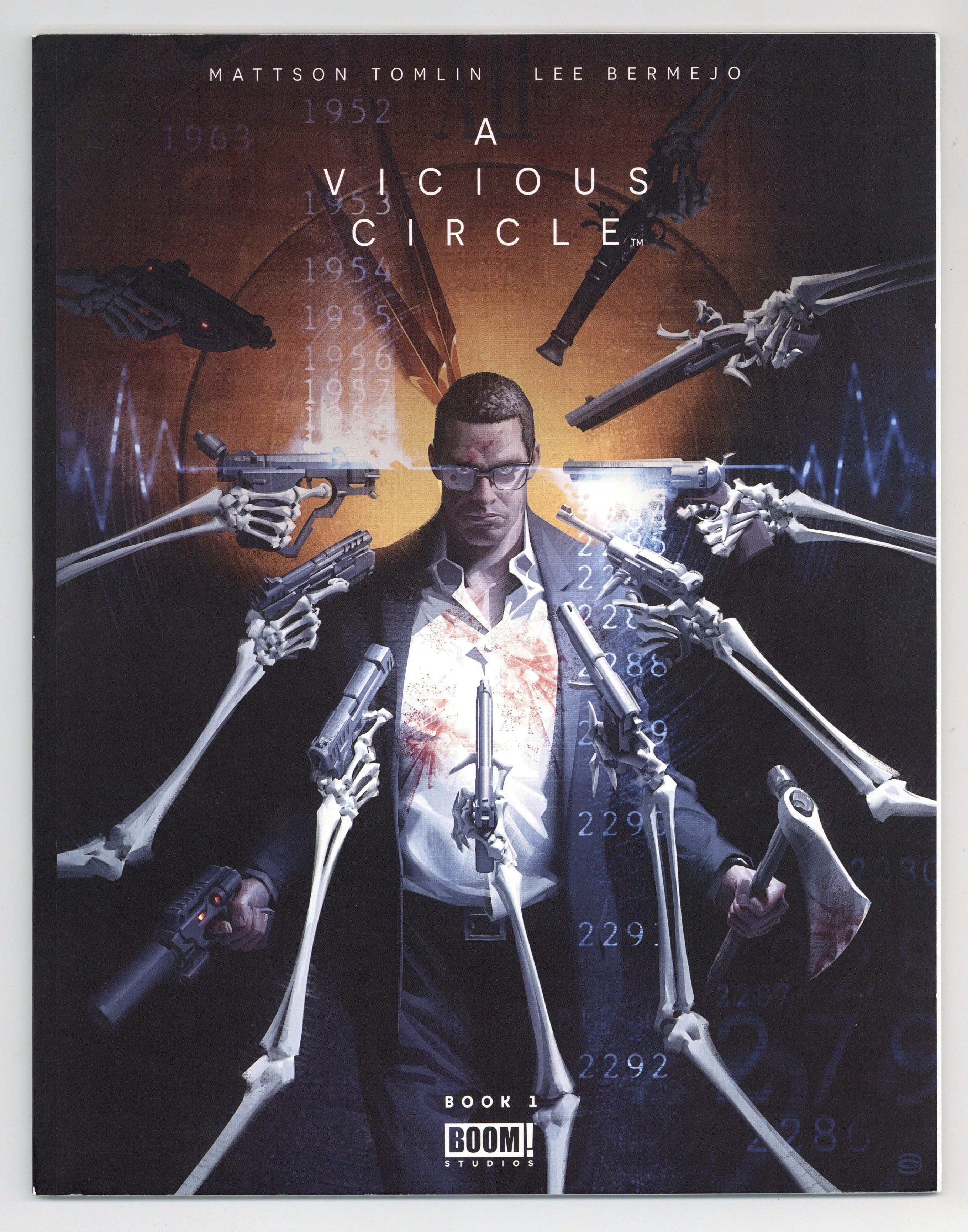Published Dec 2022 by Boom Studios.$10.00Written by Mattson Tomlin. Art by Lee Bermejo. Cover by Alex Garner. Director, screenwriter, one of the visionaries behind The Batman, and Project Power creator Mattson Tomlin teams up with iconic artist Lee Bermejo (Batman: Damned, Joker)! Shawn Thacker is a trained assassin from the future who seeks revenge on the only other man with his affliction-each life they take forces them both to travel between vastly different past and future eras. Spanning from 22nd century Tokyo to 1950s New Orleans to the Cretaceous Era and beyond, the two mortal rivals are locked in a battle of wills that spans millions of years, all to alter the course of history. With each time period, artist Lee Bermejo adjusts his artististic style to pay homage to luminary comics artists and historical master painters, presented in a prestige, oversized format! Cover price $9.99.