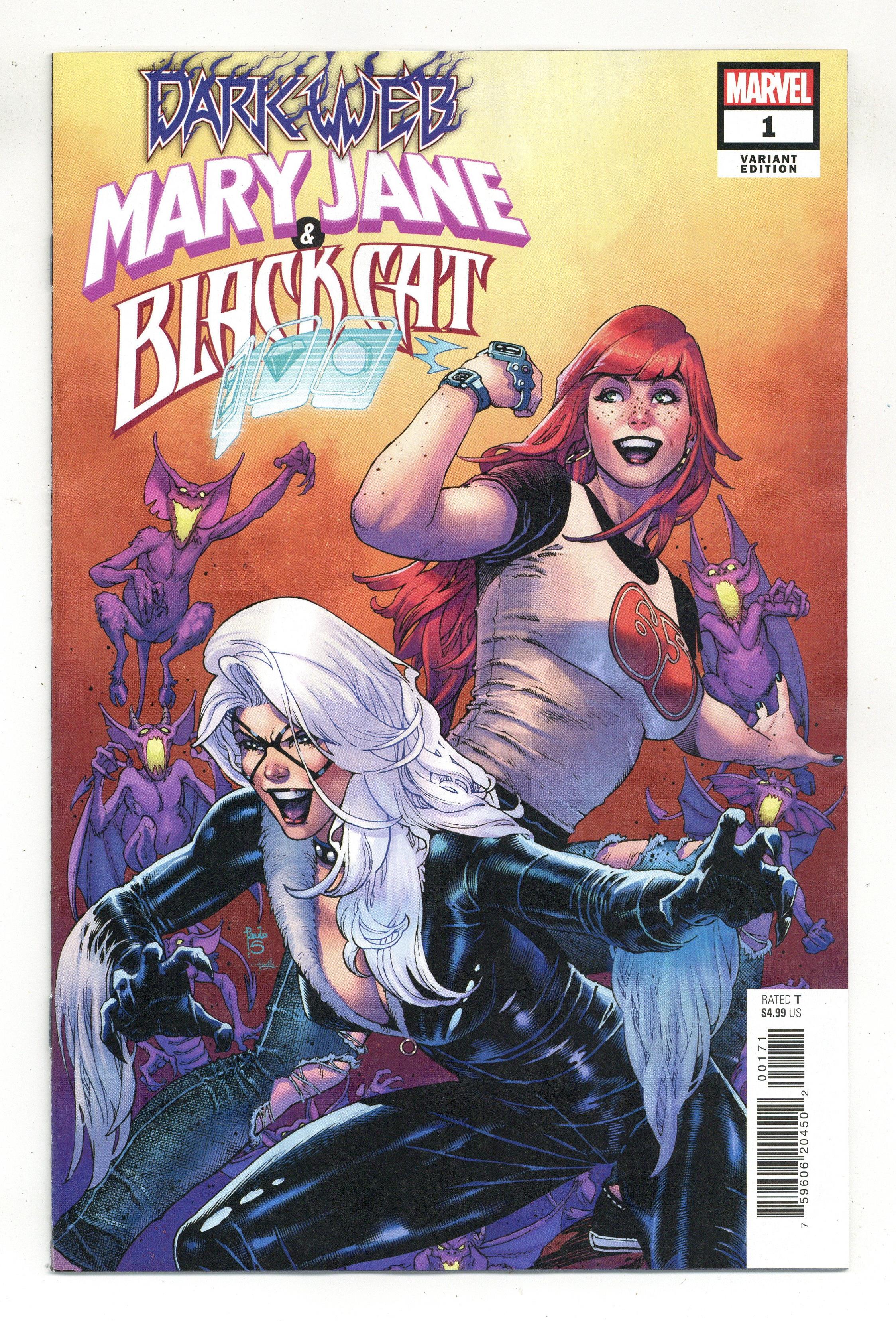 Tags: Dark Web (part 4), Spider-Man$13.00Limited 1 for 50 Retailer Incentive Variant Cover. Written by Jed MacKay. Art by Vincenzo Carratu. Cover by Paulo Siqueira. From Jed MacKay (MOON KNIGHT, IRON CAT) and Vincenzo Carratu comes one of the most explosive and kick-ass adventures in Marvel Memory! Set against the explosive backdrop of DARK WEB, Mary Jane Watson and Felicia Hardy find themselves thrown into one another's paths and then into LIMBO! But SOMETHING HAS CHANGED WITH MJ! And she's not the only one keeping secrets - Felicia's got a guilty conscience and it's playing havoc with their escape plan! Cover price $4.99.