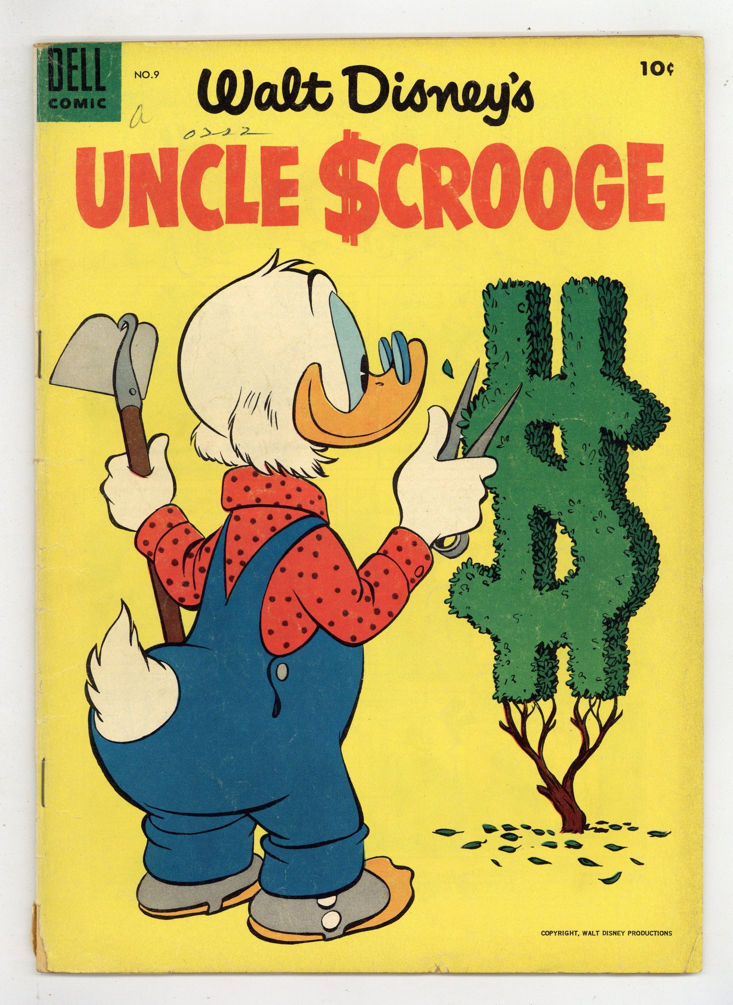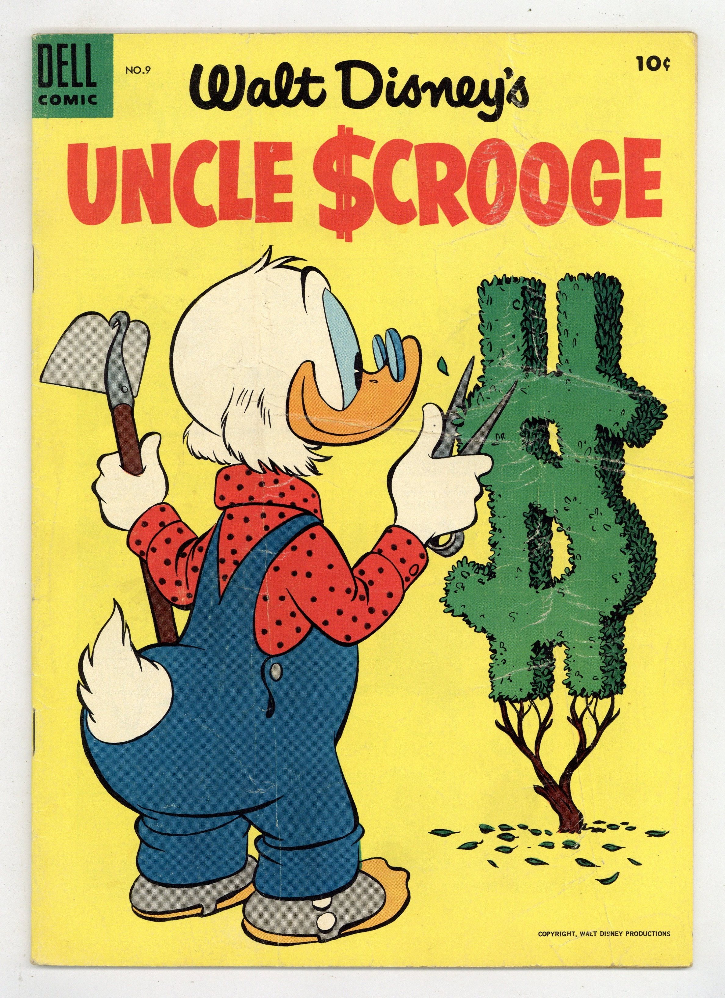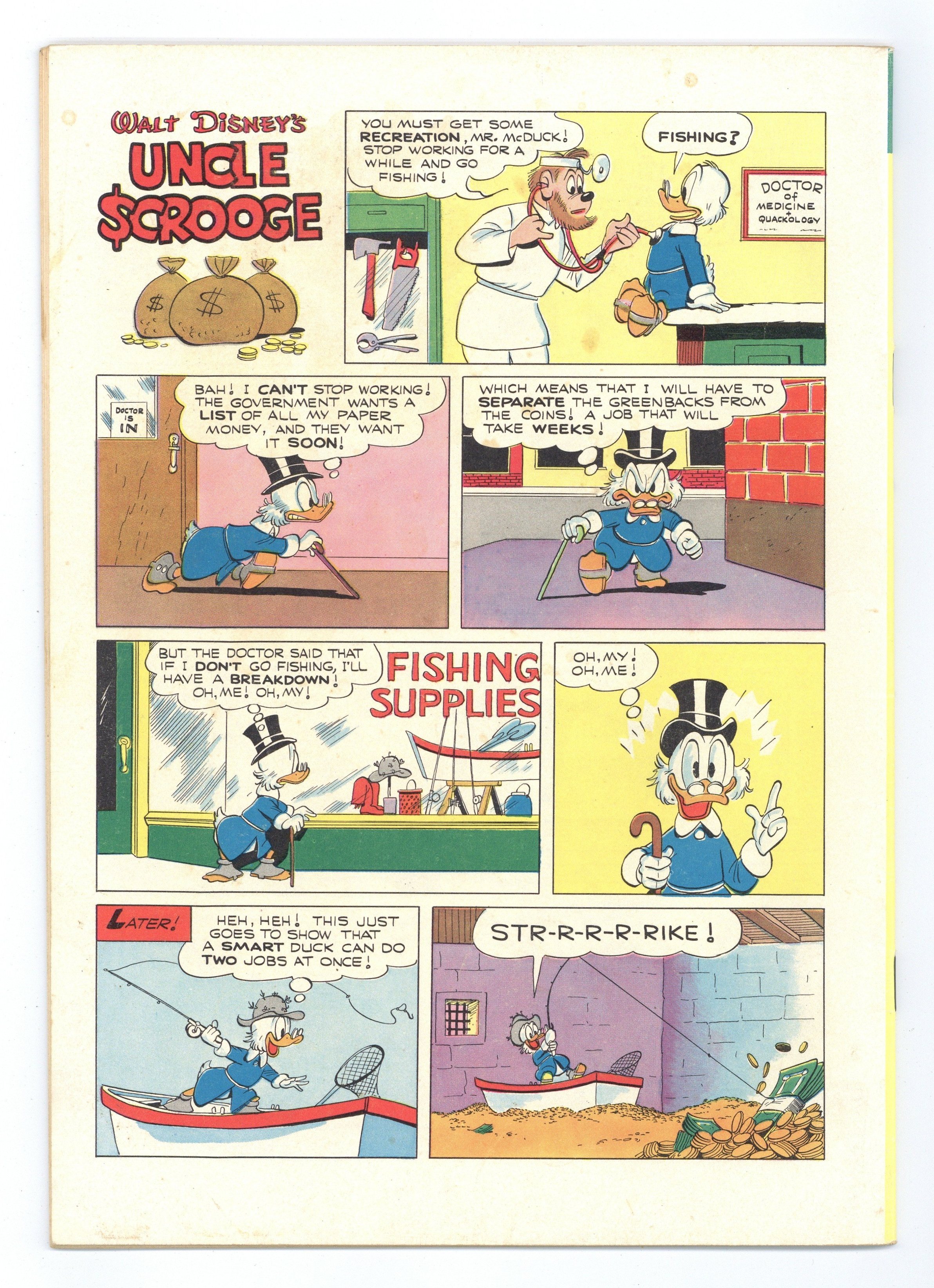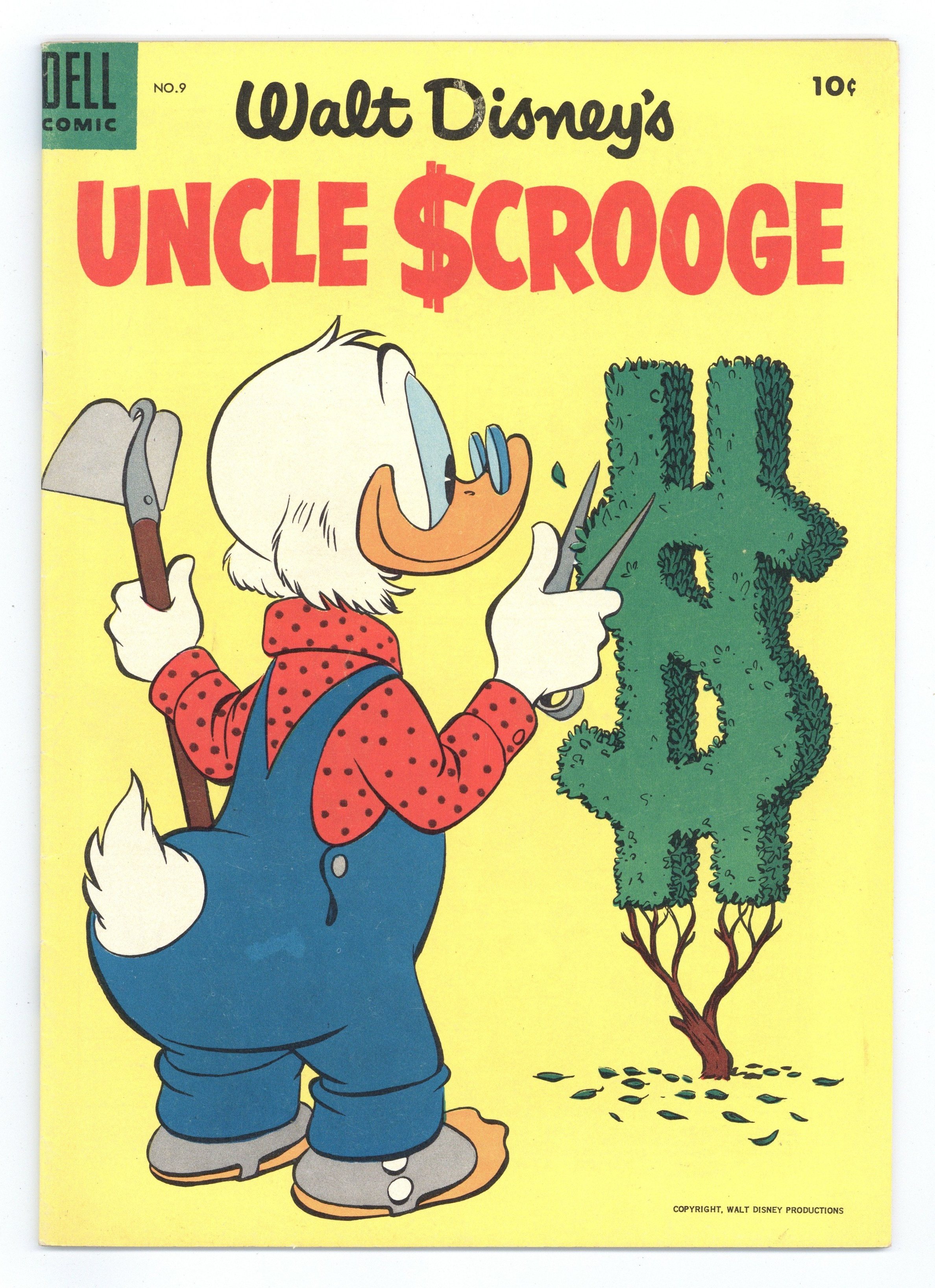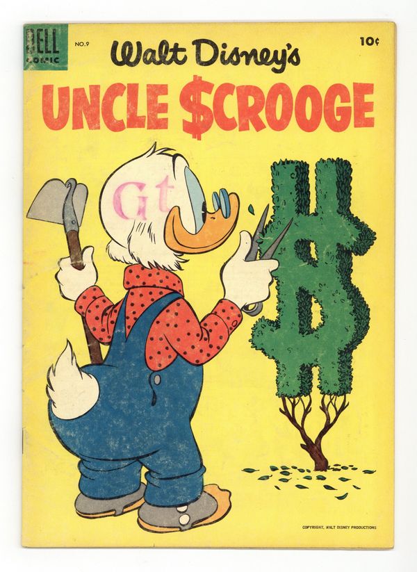 Published Mar 1955 by Dell/Gold Key/Whitman.$73.00Cover by Carl Barks. Stories and art by Carl Barks. Comics legend Carl Barks creates his masterpiece, featuring the adventures of Donald Duck's Uncle Scrooge, the richest duck in the world. A lemming gets hold of the combination to Scrooge's new safe, and Scrooge must find it amongst the millions of lemmings marching to the sea. This Carl Barks story was adapted into an episode of the beloved 1980s Disney cartoon show "Duck Tales." Scrooge bets his weight in diamonds that his horse can beat the Maharajah of Swingingdore's tiger in a race. Scrooge shows Donald his money-saving lawnmower: a sheep. The Lemming With the Locket; The Tuckered Tiger. 32 pages, Full Color. Cover price $0.10.
