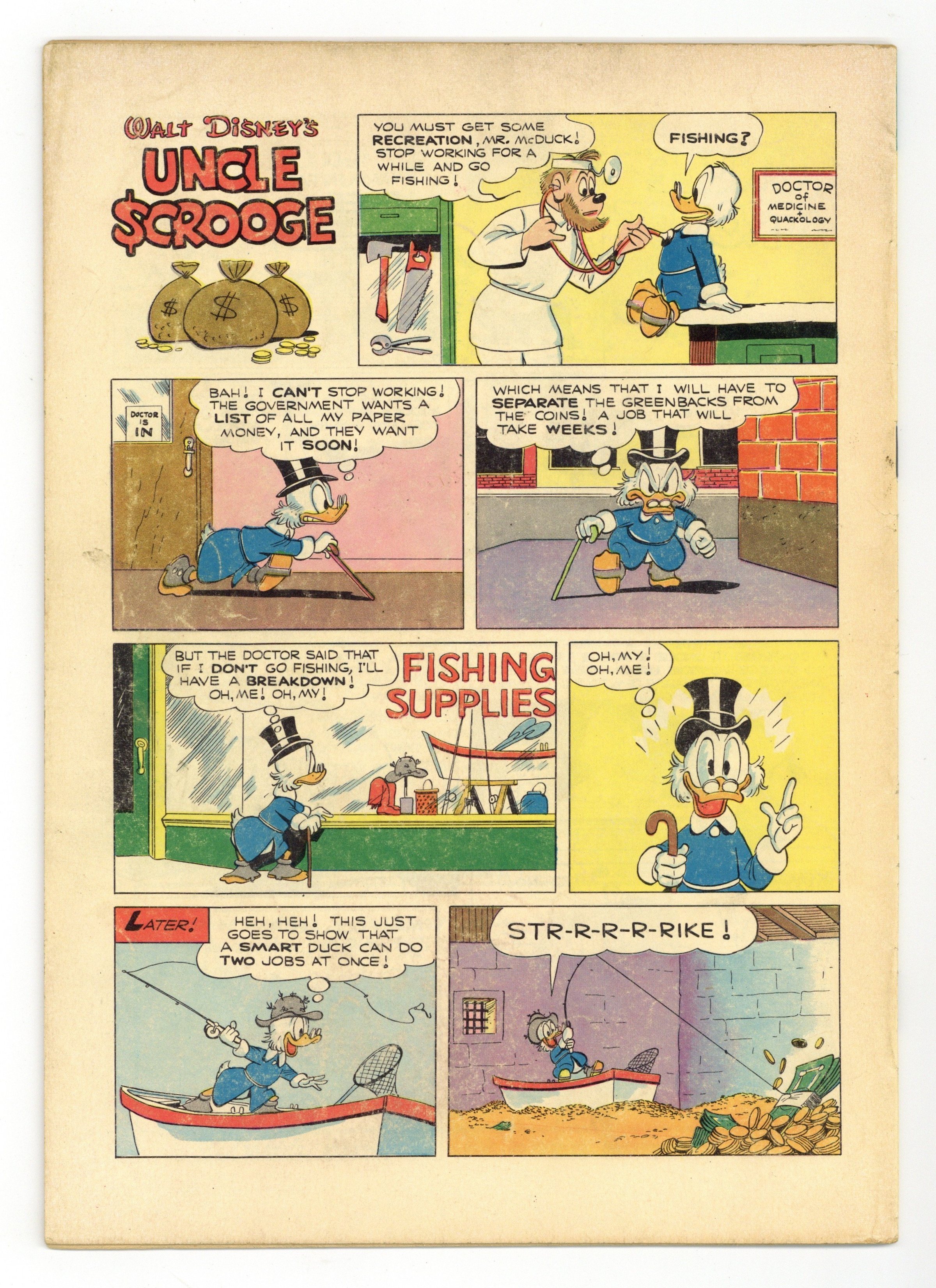 Published Mar 1955 by Dell/Gold Key/Whitman.$50.00Cover by Carl Barks. Stories and art by Carl Barks. Comics legend Carl Barks creates his masterpiece, featuring the adventures of Donald Duck's Uncle Scrooge, the richest duck in the world. A lemming gets hold of the combination to Scrooge's new safe, and Scrooge must find it amongst the millions of lemmings marching to the sea. This Carl Barks story was adapted into an episode of the beloved 1980s Disney cartoon show "Duck Tales." Scrooge bets his weight in diamonds that his horse can beat the Maharajah of Swingingdore's tiger in a race. Scrooge shows Donald his money-saving lawnmower: a sheep. The Lemming With the Locket; The Tuckered Tiger. 32 pages, Full Color. Cover price $0.10.