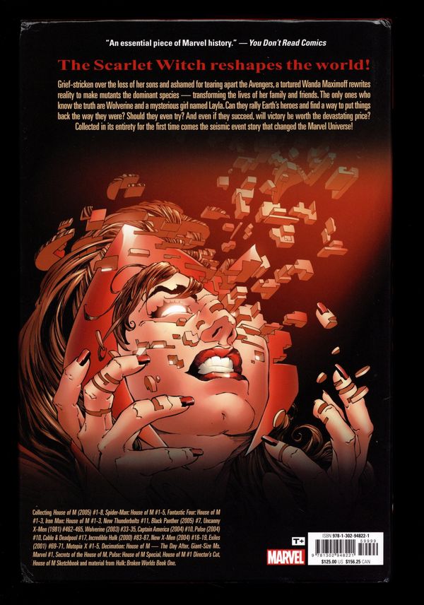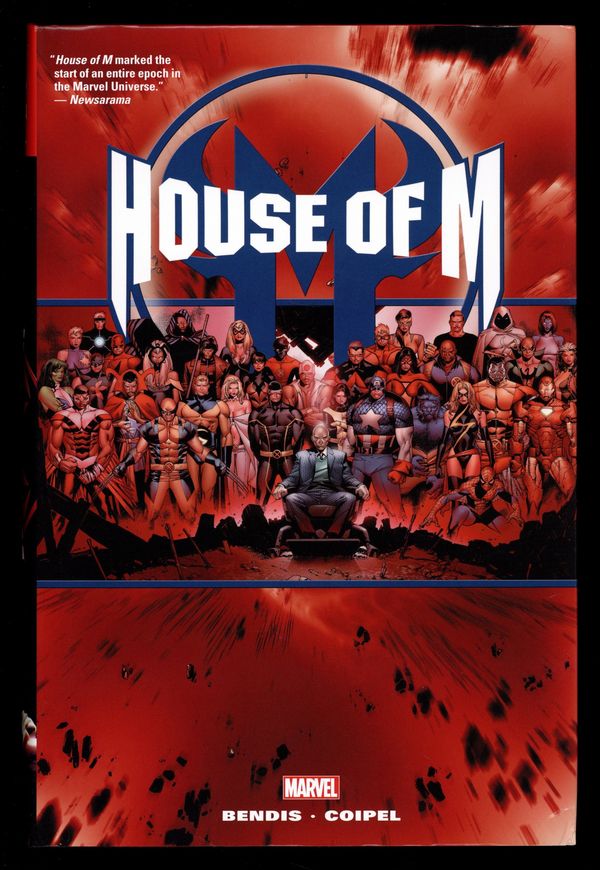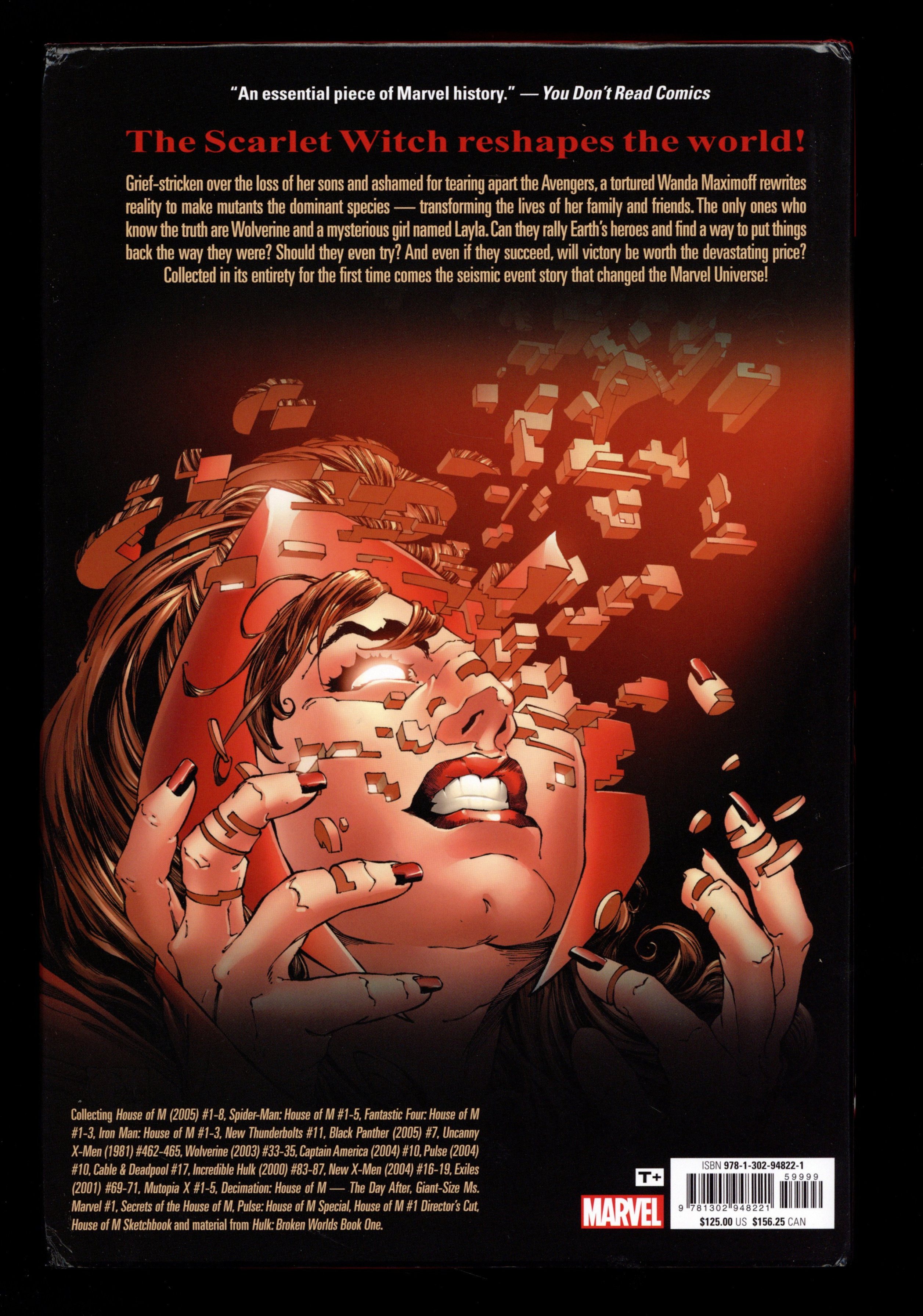 1st printing. Collects House of M (2005) #1-8, Spider-Man: House of M (2005) #1-5, Fantastic Four: House of M (2005) #1-3, Iron Man: House of M (2005) #1-3, New Thunderbolts (2005) #11, Black Panther (2005-2008 Marvel 3rd Series) #7, The Uncanny X-Men (1963-2011 1st Series) #462-465, Wolverine (2003-2009 2nd Series) #33-35, Captain America (2004-2011 5th Series) #10, Pulse (2004-2006) #10, Cable and Deadpool (2004-2008) #17, The Incredible Hulk (1999-2008 Marvel 2nd Series) #83-87, New X-Men (2004-2008 Marvel) #16-19, Exiles (2001-2008 1st Series Marvel) #69-71, Mutopia X (2005) #1-5, Decimation: House of M - The Day After (2005), Giant Size Ms. Marvel (2006), Secrets of the House of M (2005), Pulse: House of M Special Edition (2005), HOUSE OF M #1 DIRECTOR'S CUT, House of M Sketchbook (2005), and material from Hulk: Broken Worlds (2009) #1.