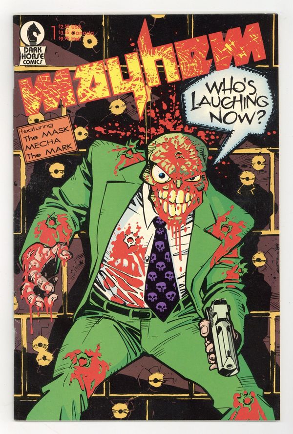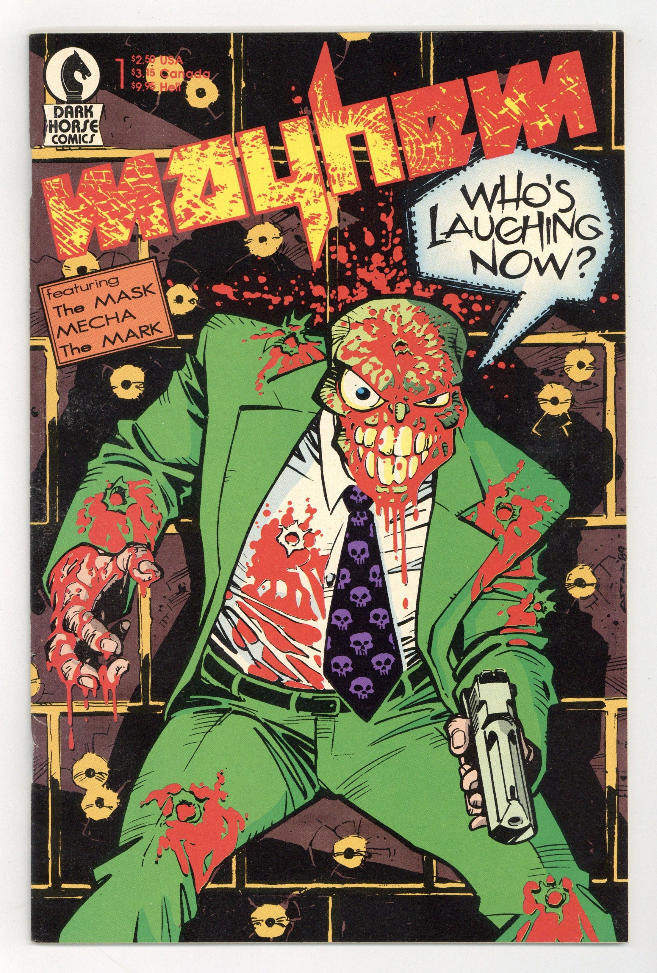 Published May 1989 by Dark Horse.$16.50Cover by Chris Warner. This new series is guaranteed to live up to its title! Each issue contains 3 twelve-page, action-packed stories of Mayhem! John Arcudi and Doug Mahnke (the team from Dark Horse Presents' Homicide) create strange, violent new tales of The Mask; new writer Tim Eldred and artists Harrison Fong and Robert Caracol carry the cast of Mecha into all-out war; and Jerry Prosser and new artist Wayne Tanaka continue the adventures of The Mark as he battles against the fascist regime of the Archon! B&W. Cover price $2.50.