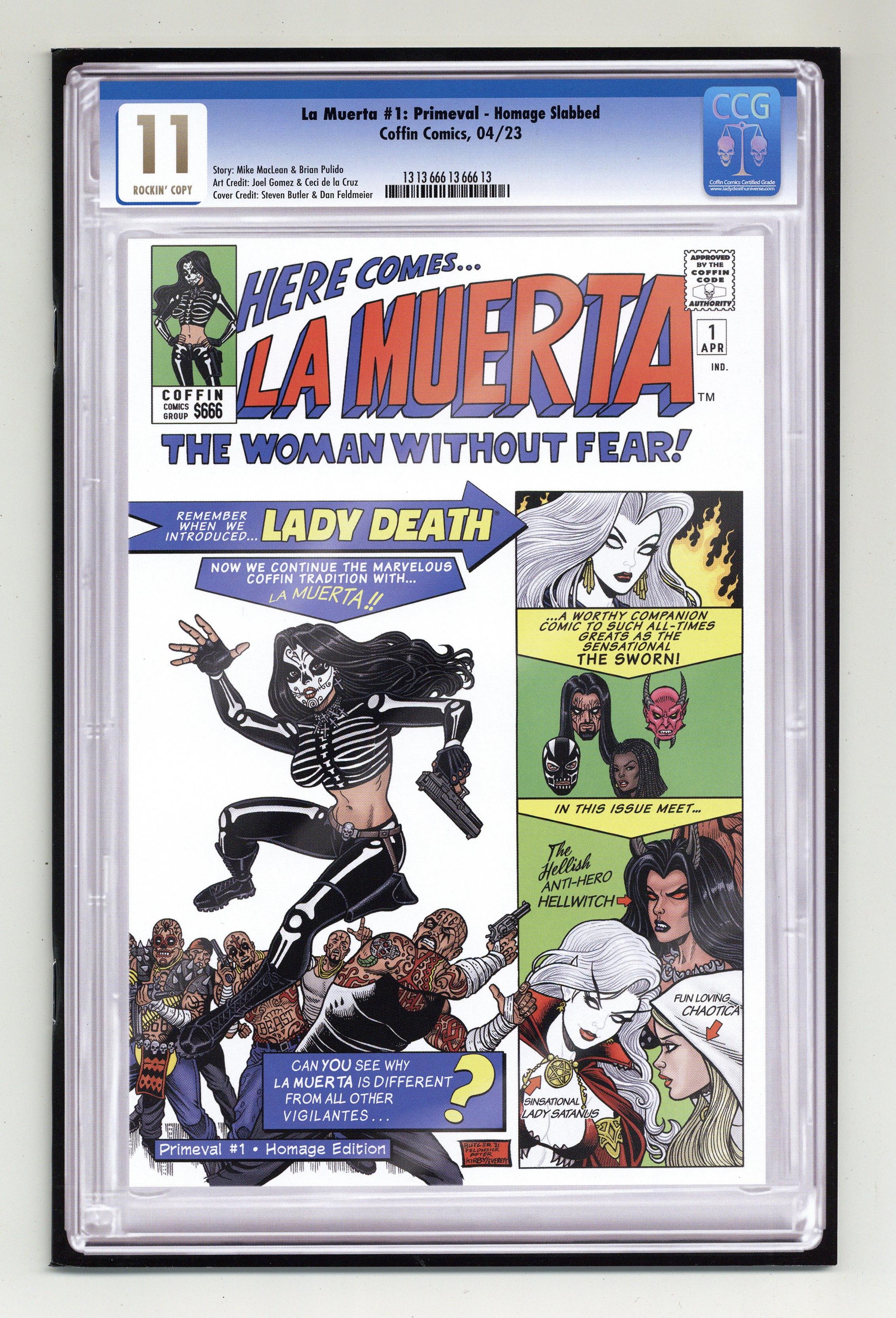 Tags: Lady DeathPublished Apr 2023 by Coffin Comics.$8.00Written by Mike MacLean, Joel Gomez, Brian Pulido. Art by Joel Gomez. Cover by Steven Butler. 'WORLD WAR DEATH!' official tie-in! When her former lieutenant mysteriously vanishes in the Amazon rainforest, urban vigilante LA MUERTA vows to bring him home at all costs. Joining a squad of ex-army rangers and a sexy riverboat captain, Maria ventures deep into the heart of darkness and faces an ancient, insidious evil bolstered by Lady Death's DNA and transforming the jungle itself into a house of hideous horrors. If Maria is to survive, she must surrender to a primordial savagery she never knew she had in her, but can she? Will she? 48 pages, full color. Cover price $25.00.